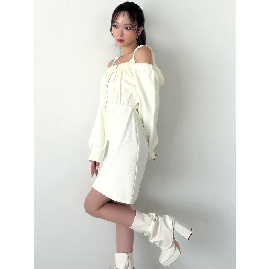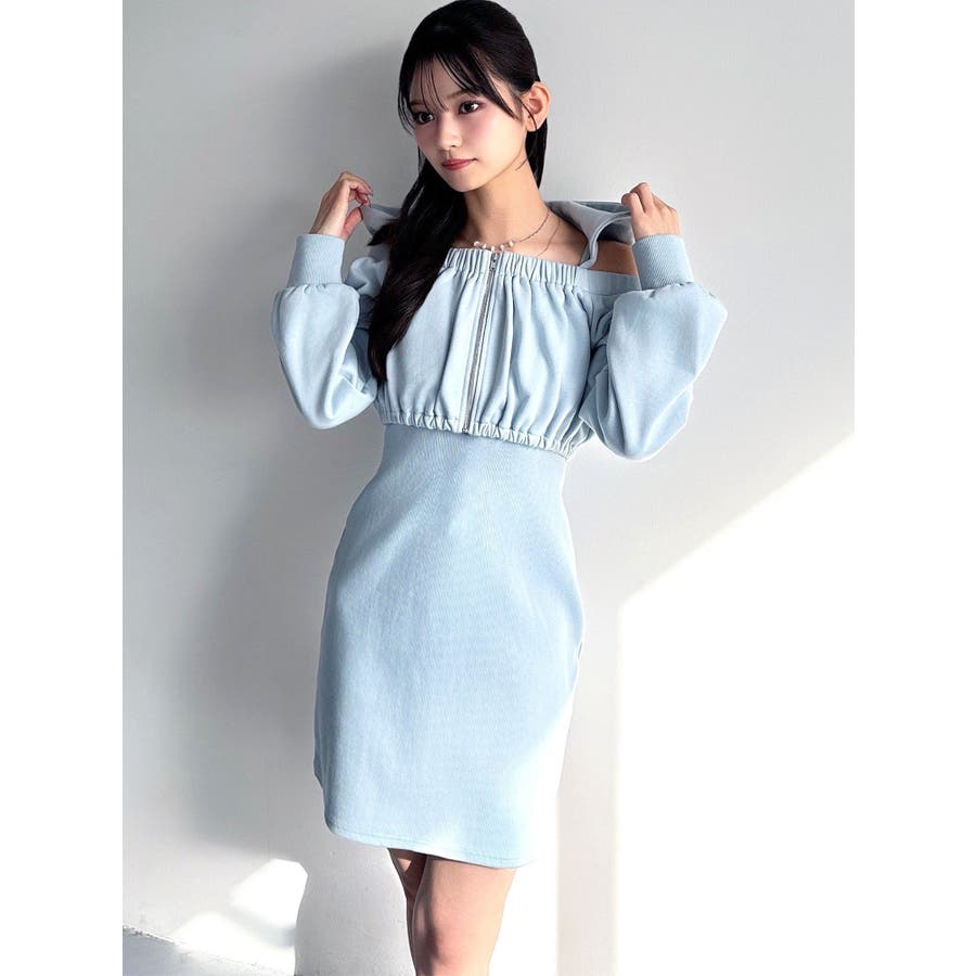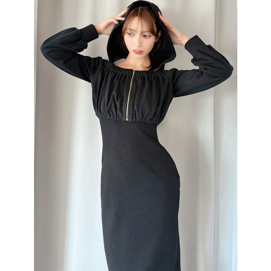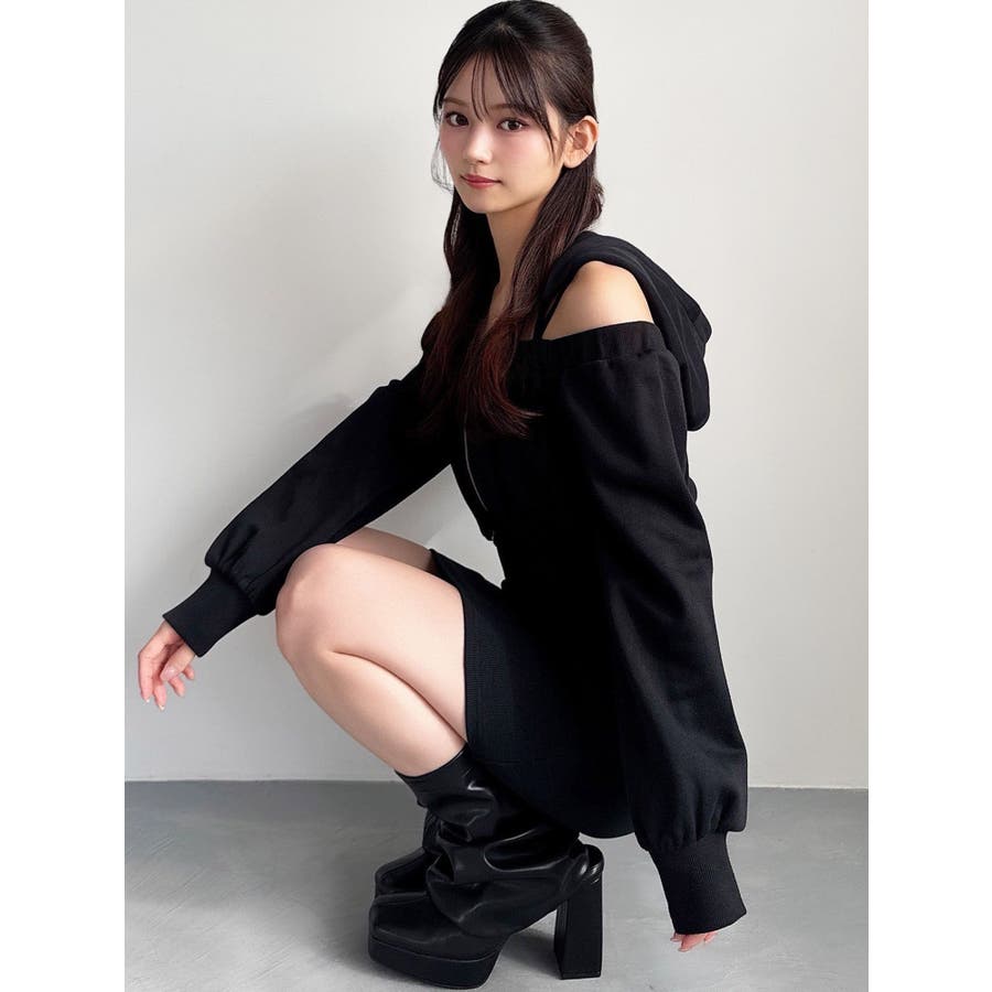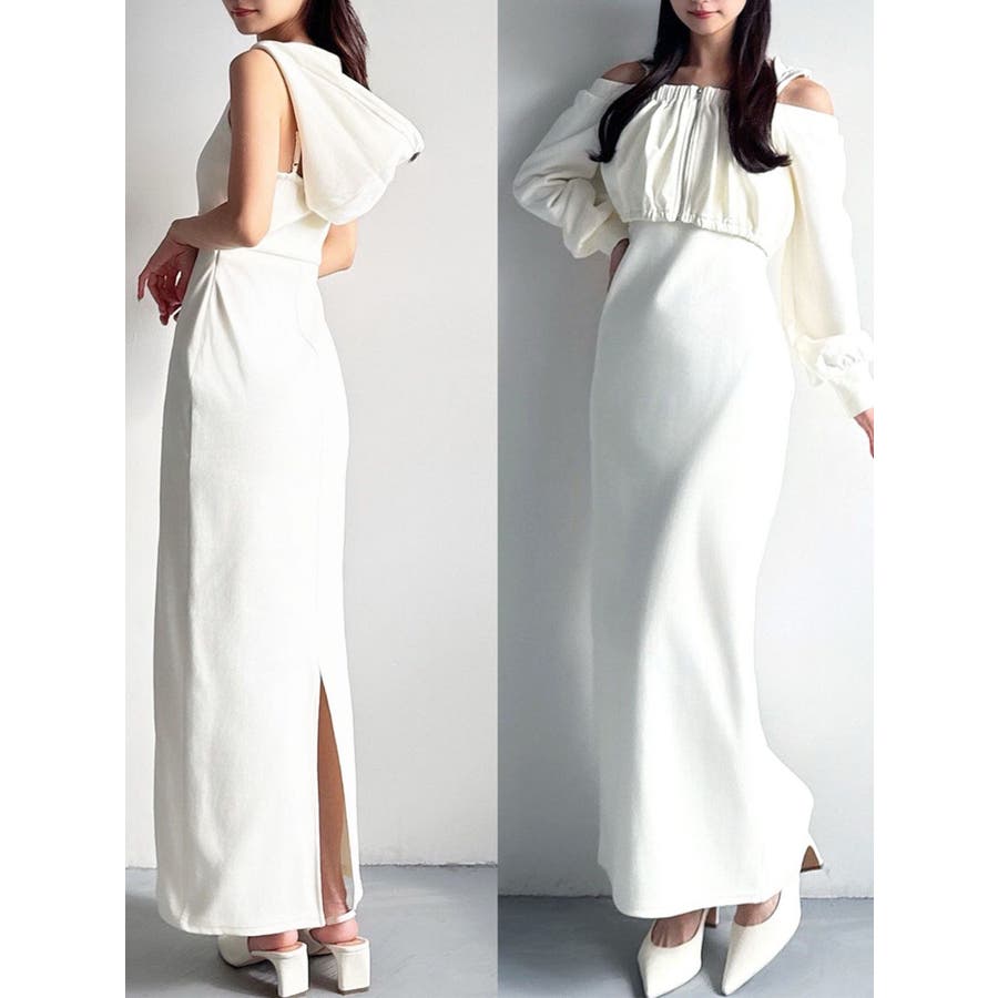 裏毛素材のロングワンピースです。フード付きのキャミワンピースにオフショルのトップスを重ねて着用するレイヤードデザイン。
