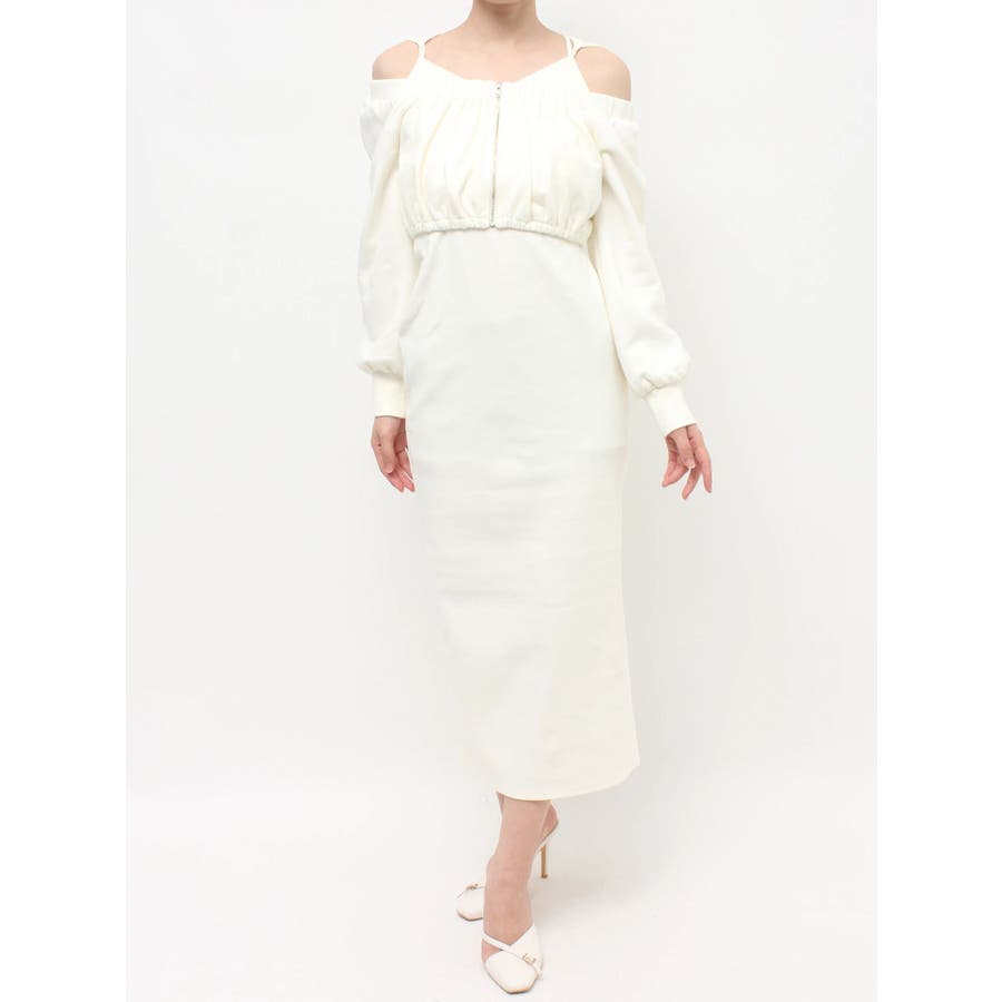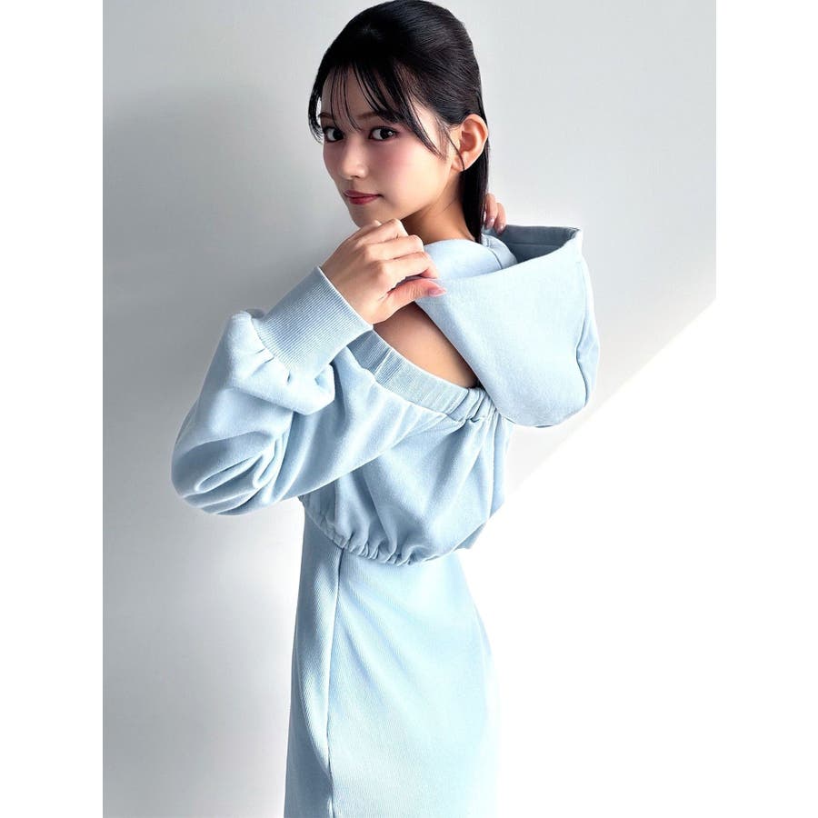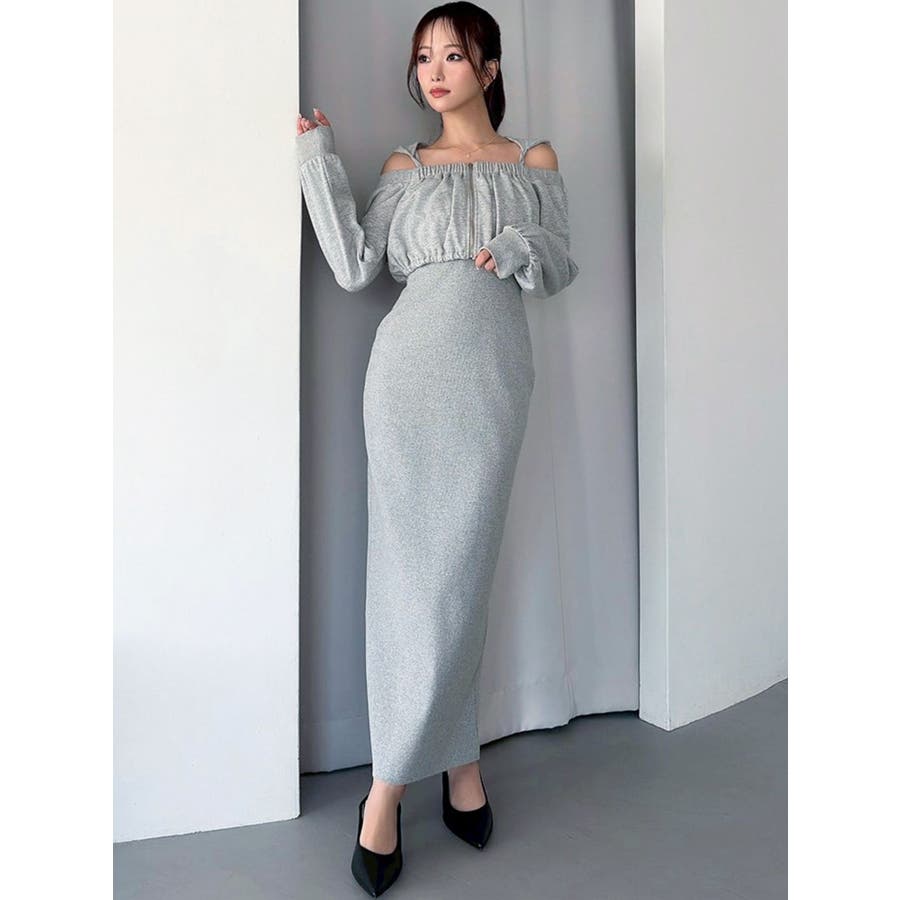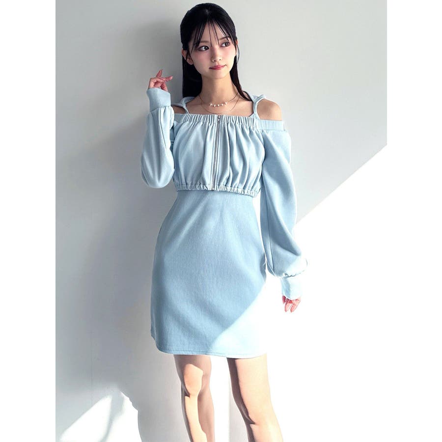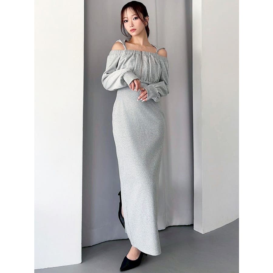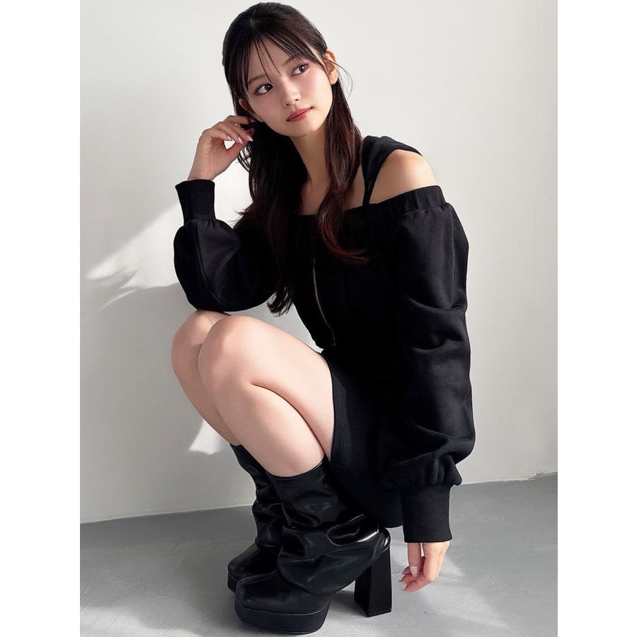裏毛素材のロングワンピースです。フード付きのキャミワンピースにオフショルのトップスを重ねて着用するレイヤードデザイン。