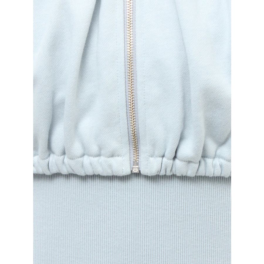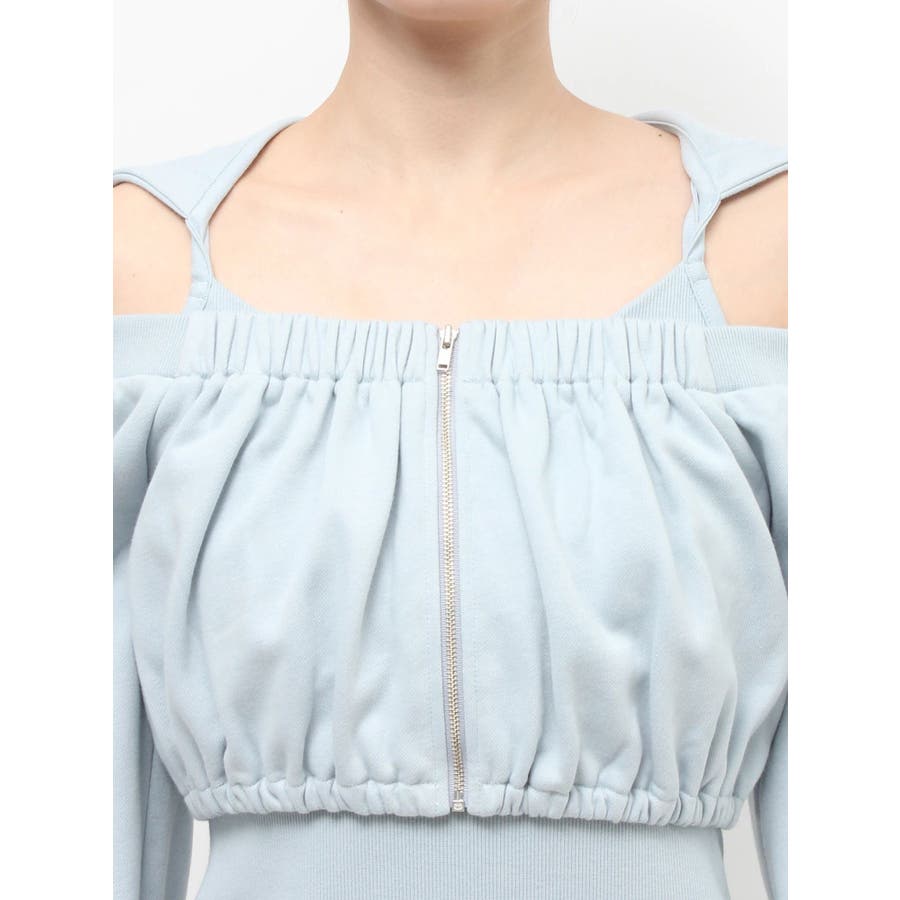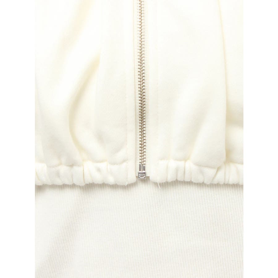 フードとジップアップでスポーティーな印象ながら、ほどよい肌見せで女性らしさを加えました。