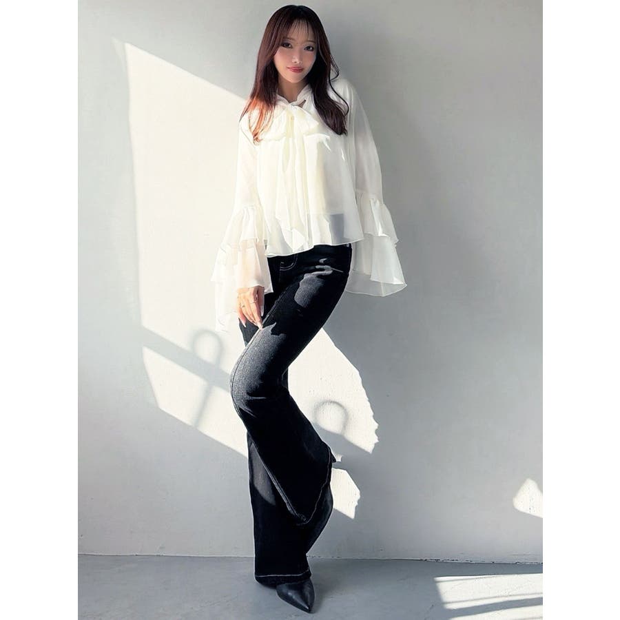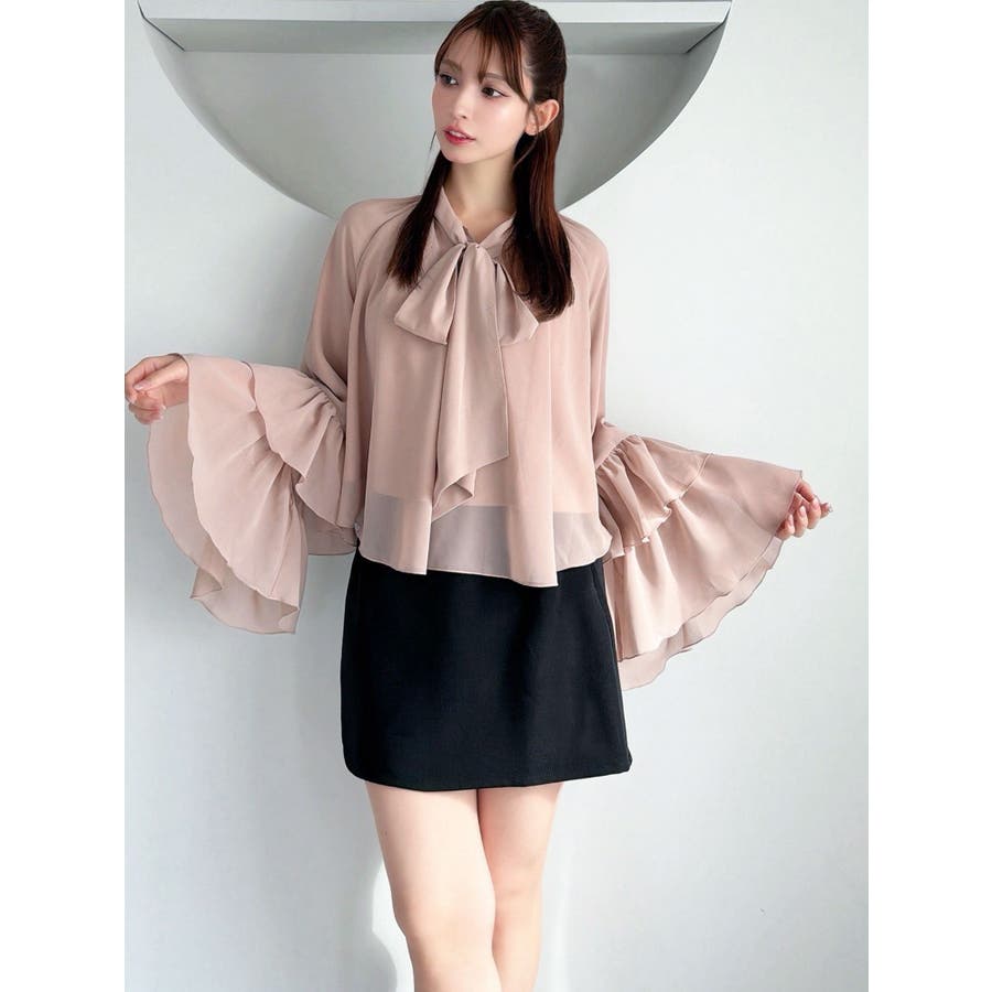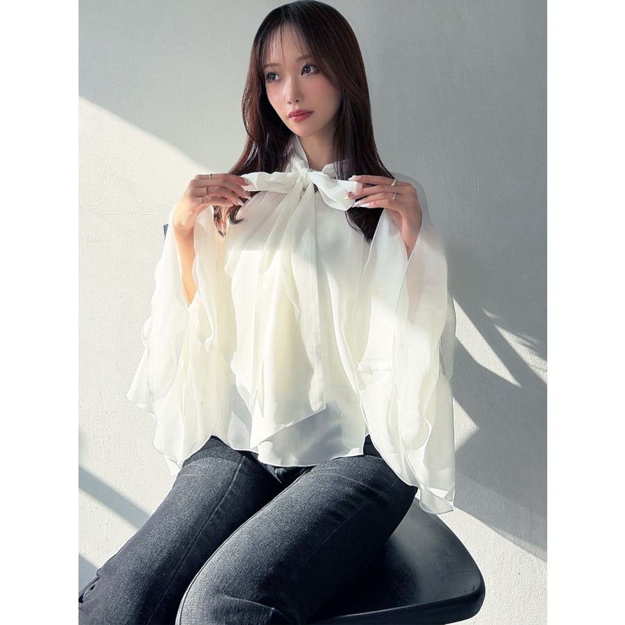 大きなリボンがポイントのフリルブラウス▽デザイン▽フリルがたっぷりあしらわれたフェミニンな印象のブラウス。程よい透け感と揺れるシルエットが女性らしさを演出します。ワイドスリーブと胸元の大きなリボンが華やかな印象を与えてくれます。1枚で主役級のアイテム◎▽カラー▽白、黒、ピンクの3色展開。▽スタイリング▽スカートをあわせたフェミニンなスタイルはもちろん、デニムを合わせてカジュアルダウンするのもおすすめ。デートや記念日など特別なシーンにもお使いいただけるアイテムです◎