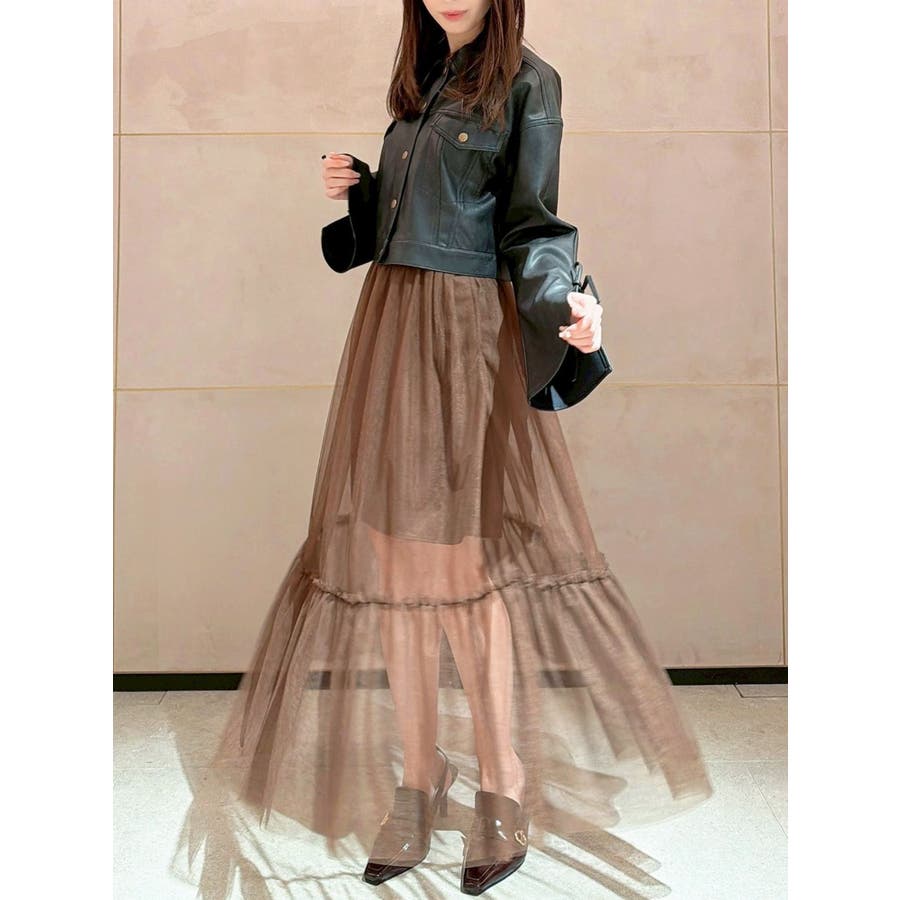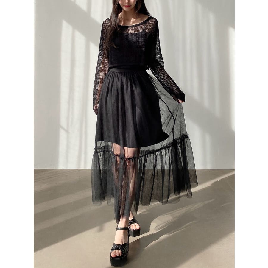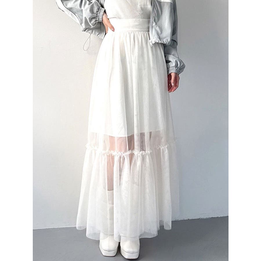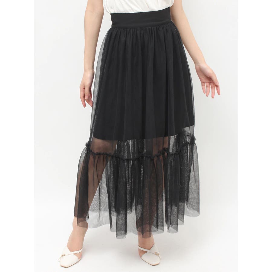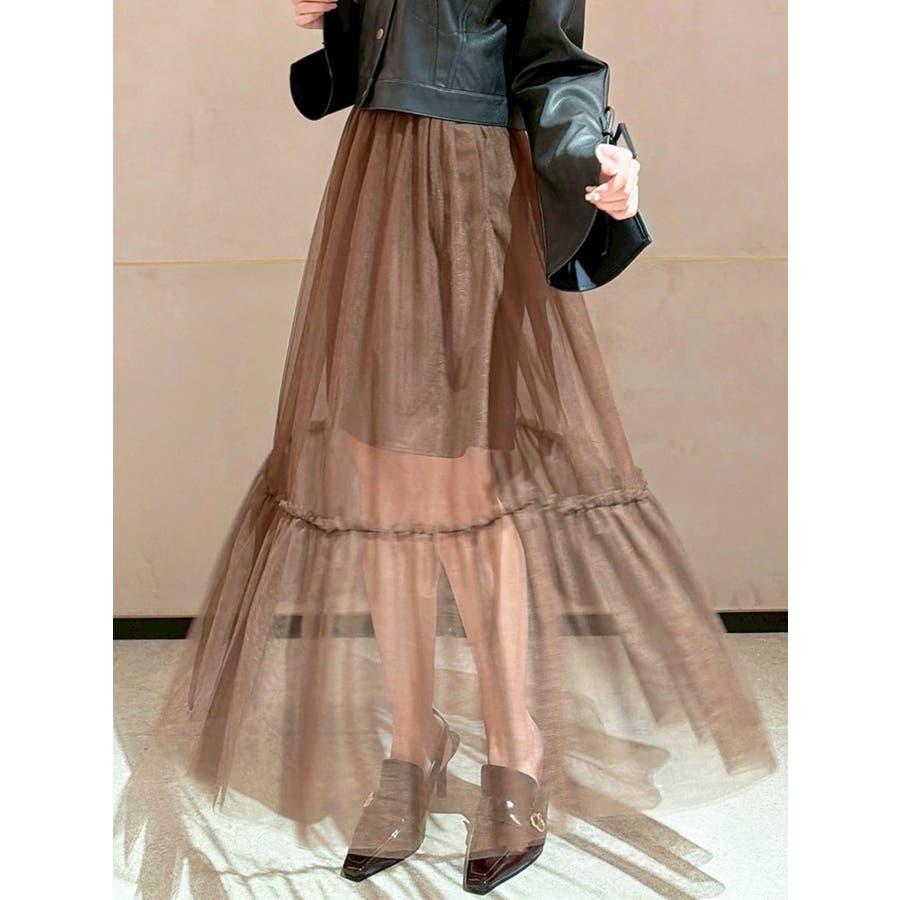 トレンドのチュール素材をふんだんに使用したスカート▽デザイン▽トレンドのチュールを全体に使用したチュールスカート。ニュアンスのあるシースルーデザインにときめく1枚。ロング丈なので、大人レディに着こなせるアイテムです。ひざ下から足元が透けることで、抜け感を演出。ワンカラーで仕上げているので、どんなトップスとも相性抜群です◎▽カラー▽白、黒、ブラウンの3色展開。▽スタイリング▽どんなトップスとも合わせやすい万能アイテム◎ブラウスやニットを合わせたキレイ目コーデはもちろん、スウェットやオーバーニットを合わせたカジュアルダウンしたコーデもおすすめ◎