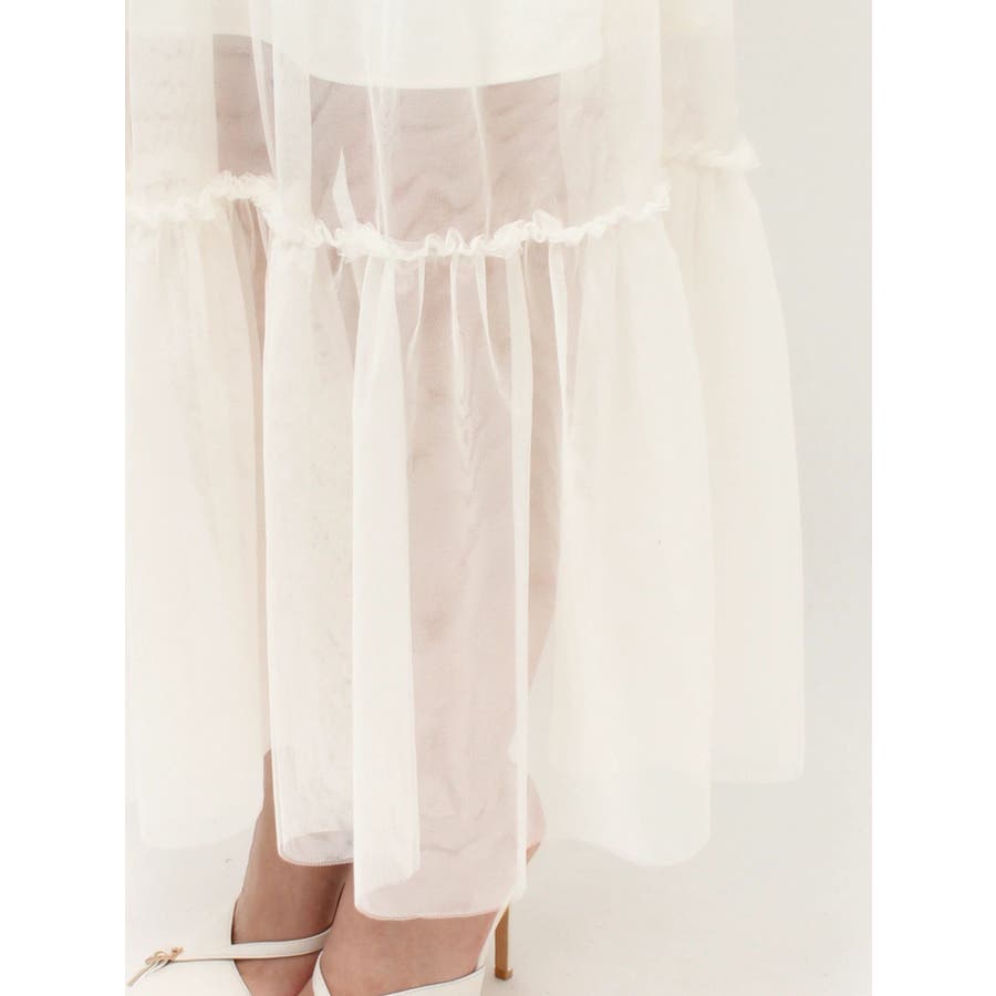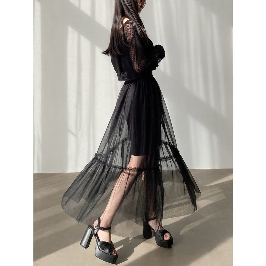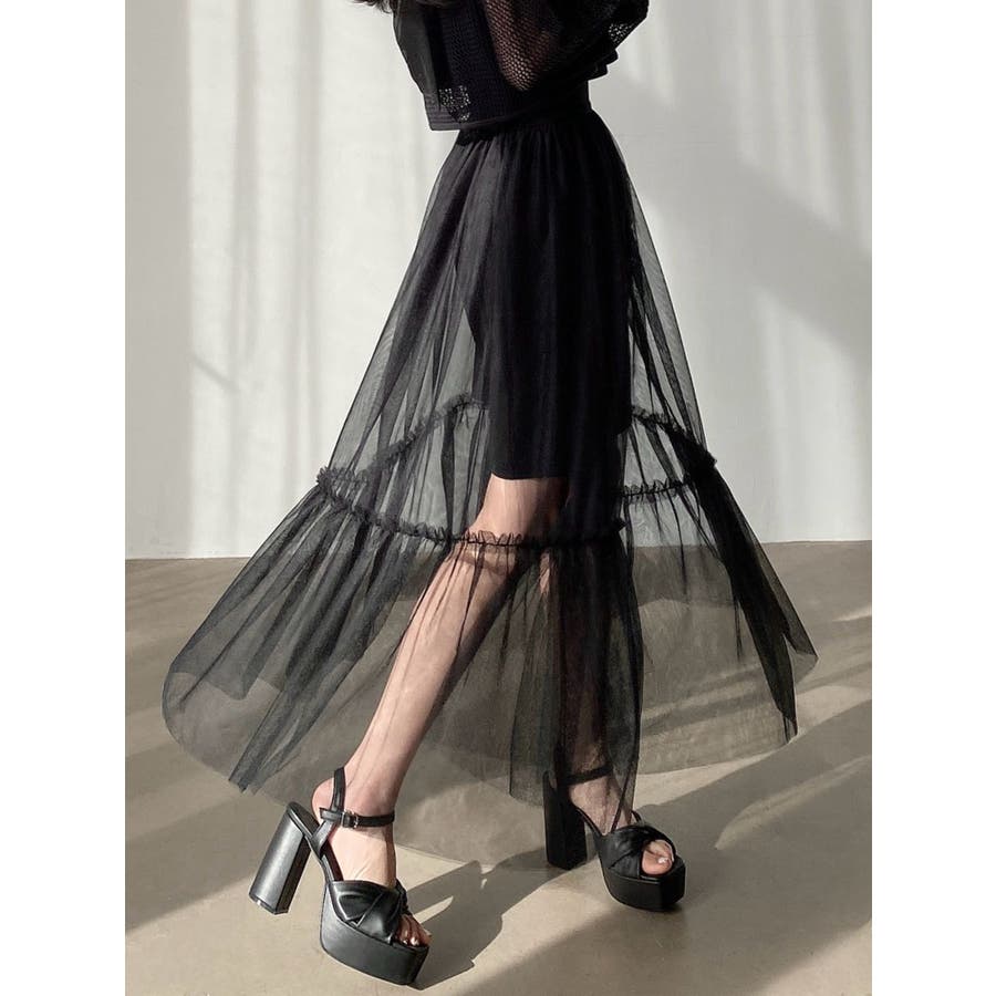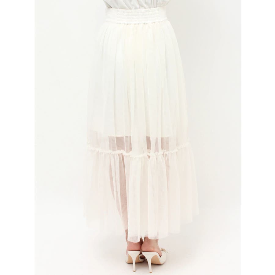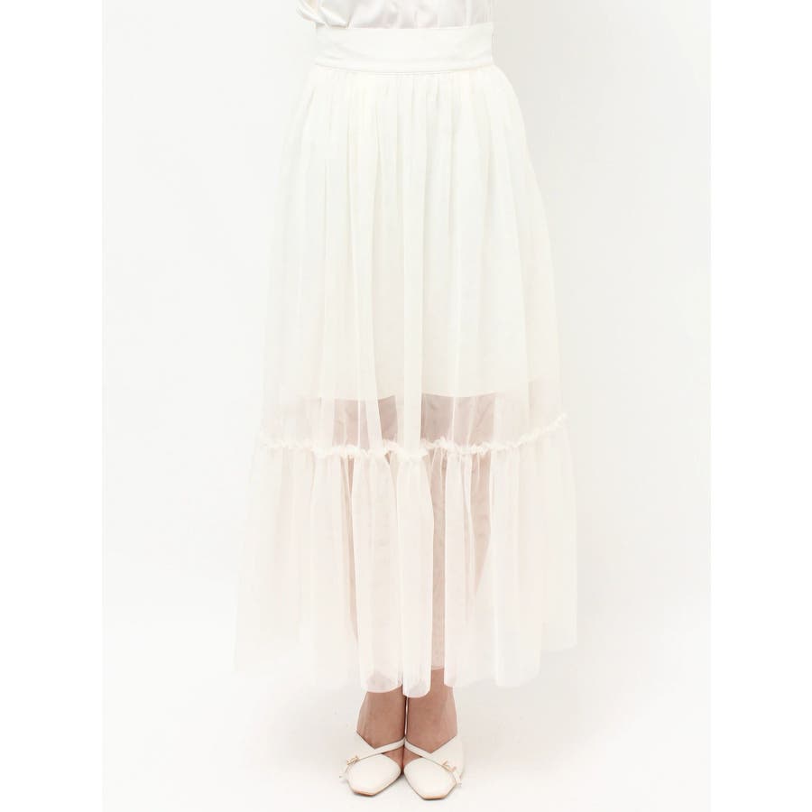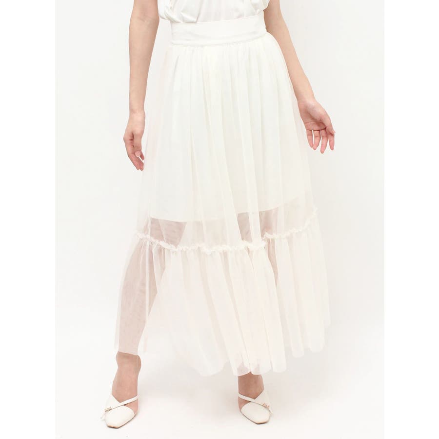 トレンドのチュール素材をふんだんに使用したスカート▽デザイン▽トレンドのチュールを全体に使用したチュールスカート。ニュアンスのあるシースルーデザインにときめく1枚。ロング丈なので、大人レディに着こなせるアイテムです。ひざ下から足元が透けることで、抜け感を演出。ワンカラーで仕上げているので、どんなトップスとも相性抜群です◎▽カラー▽白、黒、ブラウンの3色展開。▽スタイリング▽どんなトップスとも合わせやすい万能アイテム◎ブラウスやニットを合わせたキレイ目コーデはもちろん、スウェットやオーバーニットを合わせたカジュアルダウンしたコーデもおすすめ◎