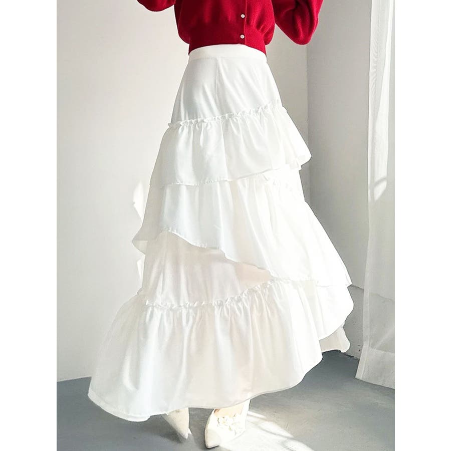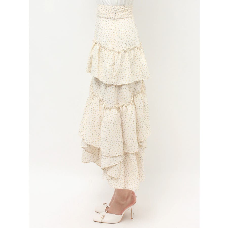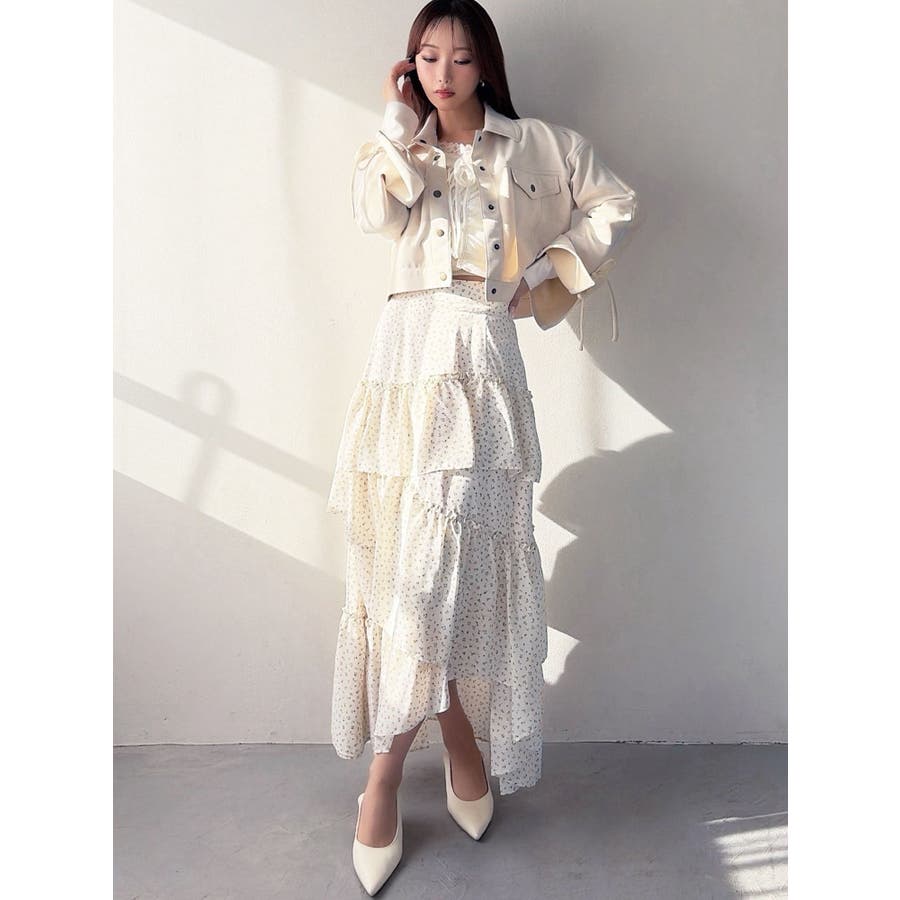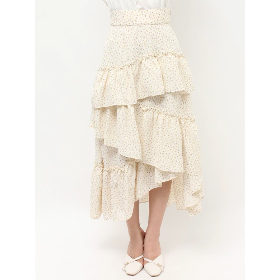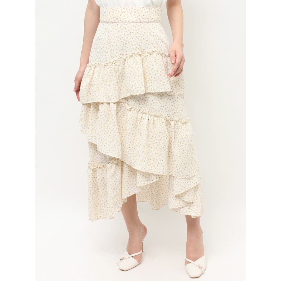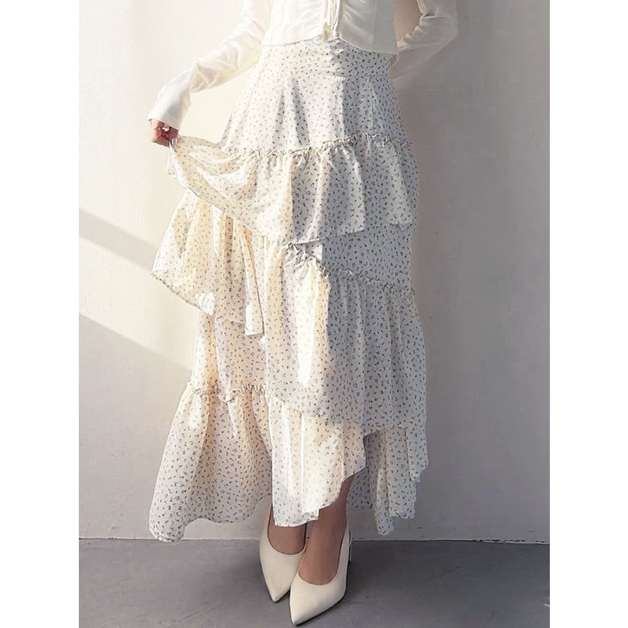 ボリューム感のあるフェミニンなフレアスカート▽デザイン▽ランダムなフリルデザインで動きのあるシルエットに仕上げました。薄手の生地を使用し、軽やかさと柔らかな女性らしさを演出。春にぴったりのさわやかな印象のスカートです。▽カラー▽白、アイボリー、黒の3色展開。白は無地、黒とアイボリーは小花柄です。▽スタイリング▽カーディガンやニットトップスを合わせたフェミニンなスタイリングはもちろん、Tシャツを合わせたカジュアルなスタイリングもおすすめ◎デイリー使いだけでなく、デートや女子会にもピッタリのアイテムです♪