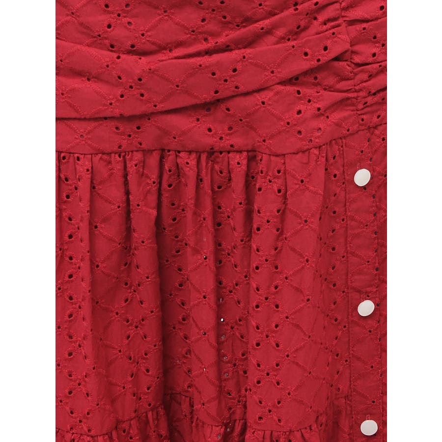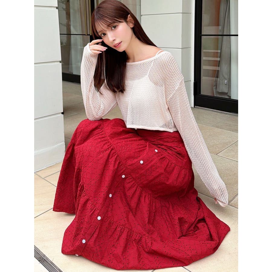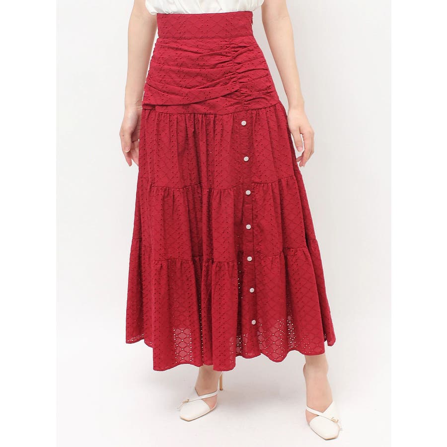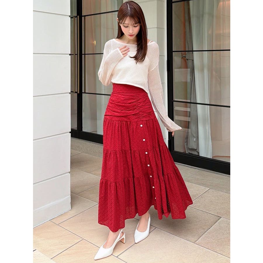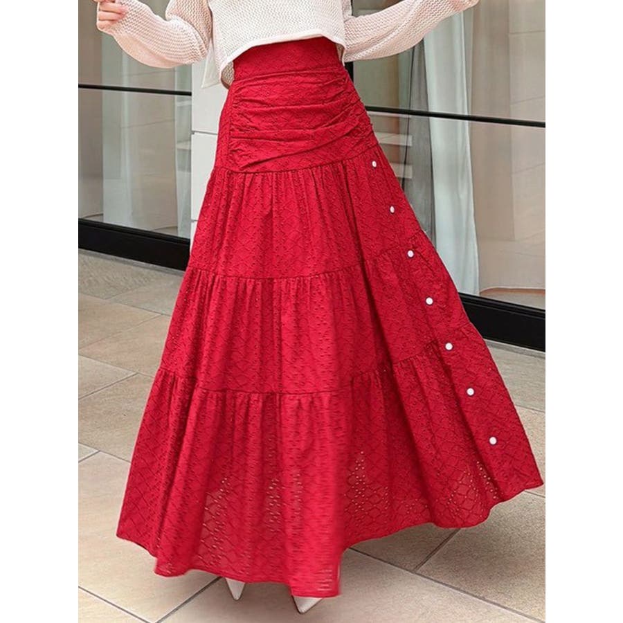 コットンレースが春らしいフレアスカート▽デザイン▽コットンレースがポイントのフレアスカート。ティアードやギャザーを寄せたデザインを入れ込み、デザイン性あるスカートに仕上げました♪フロント部分のボタンを開けていただくと脚がちらりと見えてさりげない肌見せに♪▽カラー▽白、黒、赤の3色展開。▽スタイリング▽ニットトップスやカーディガンを合わせたフェミニンなコーディネートはもちろん、Tシャツを合わせたカジュアルなスタイリングもおすすめ◎デイリー使いはもちろん、デートや記念日など特別なシーンにもピッタリのアイテムです。