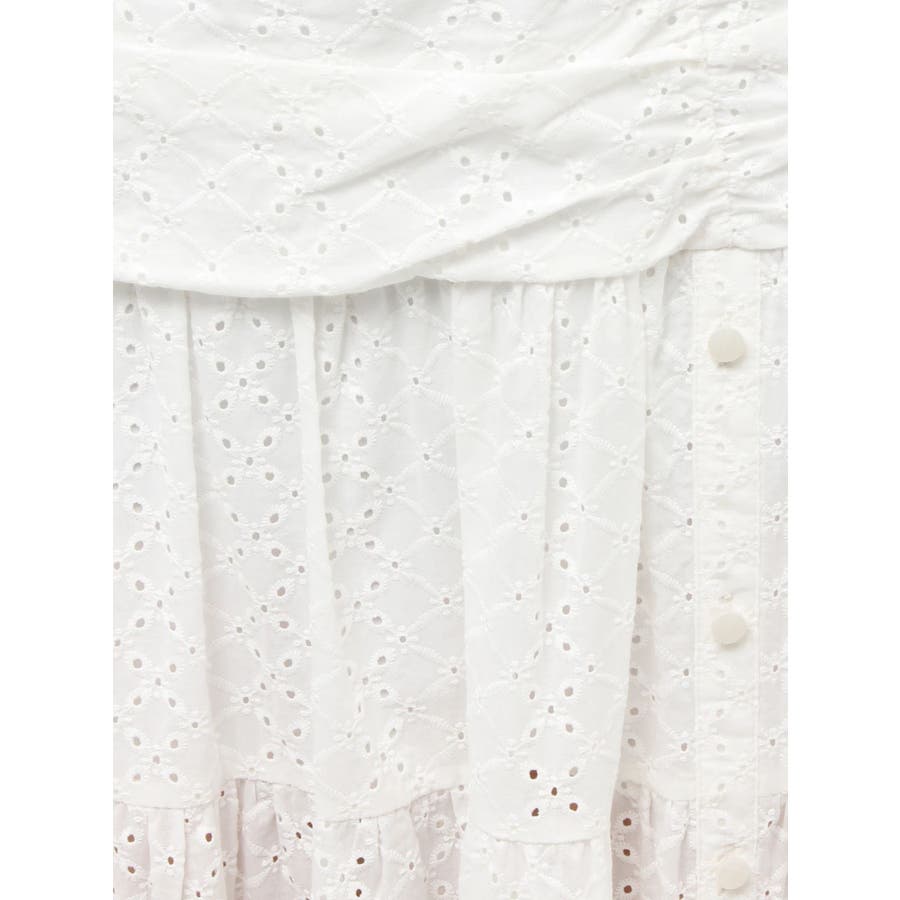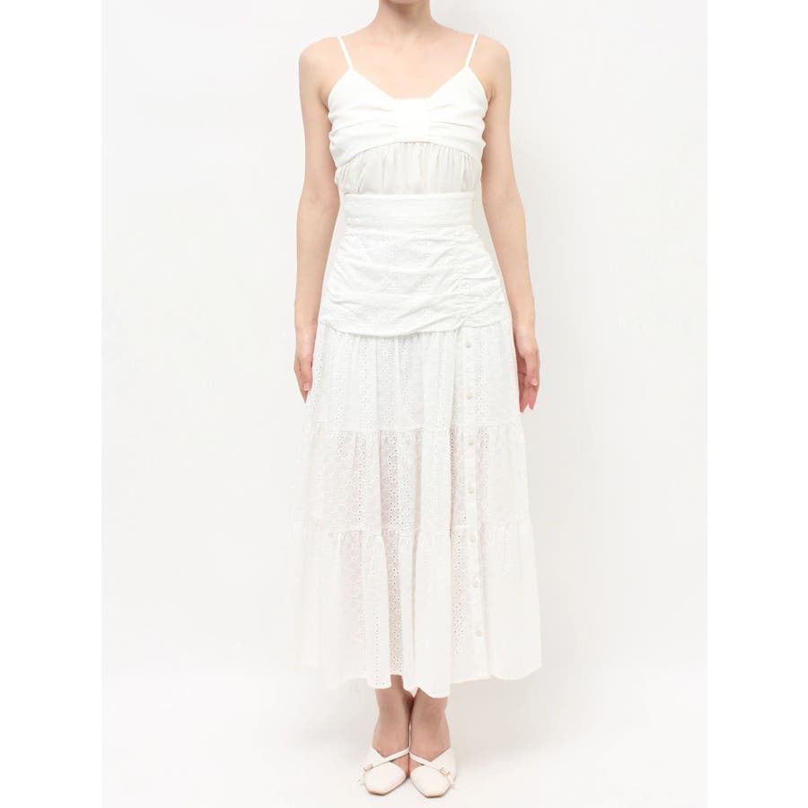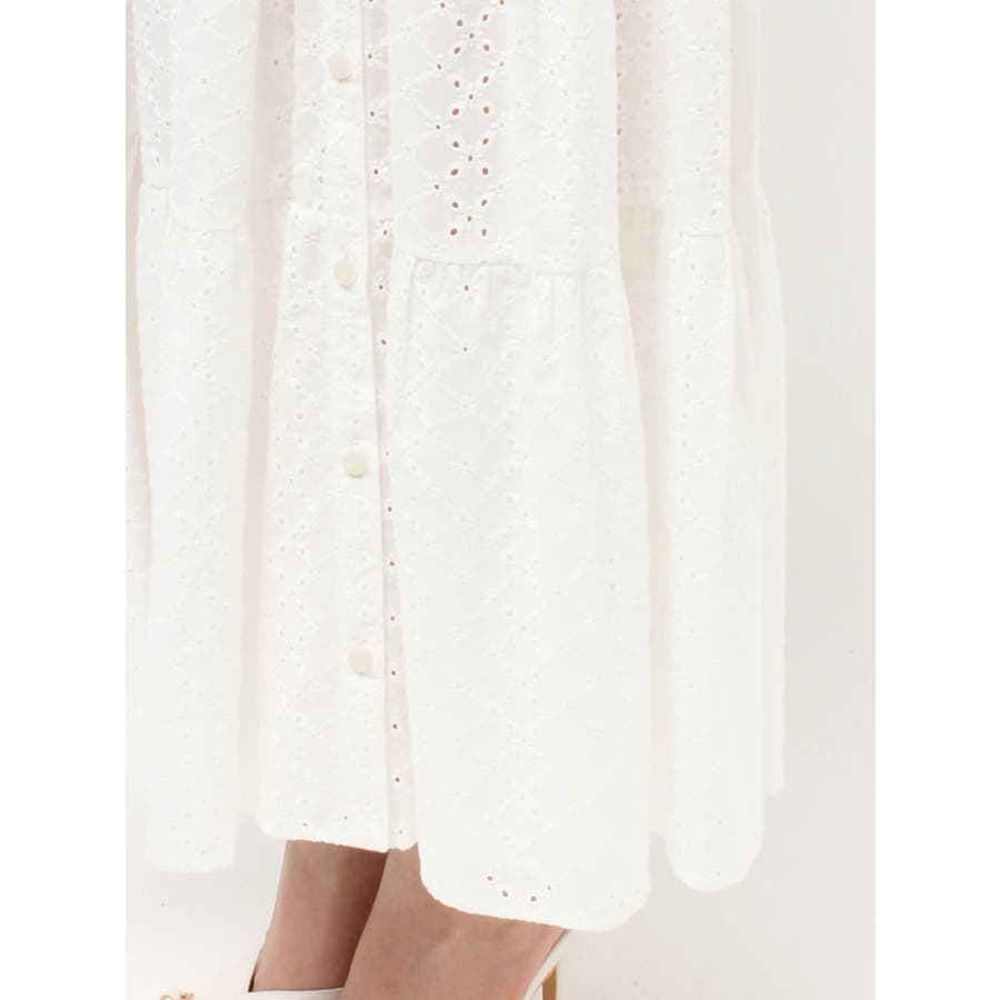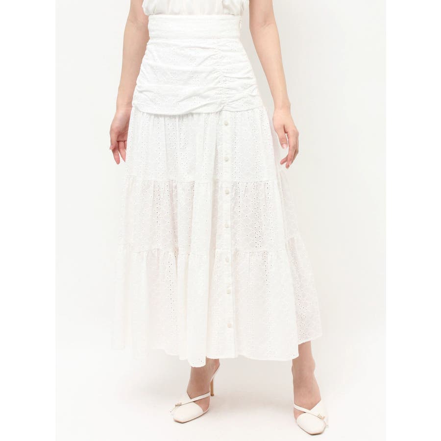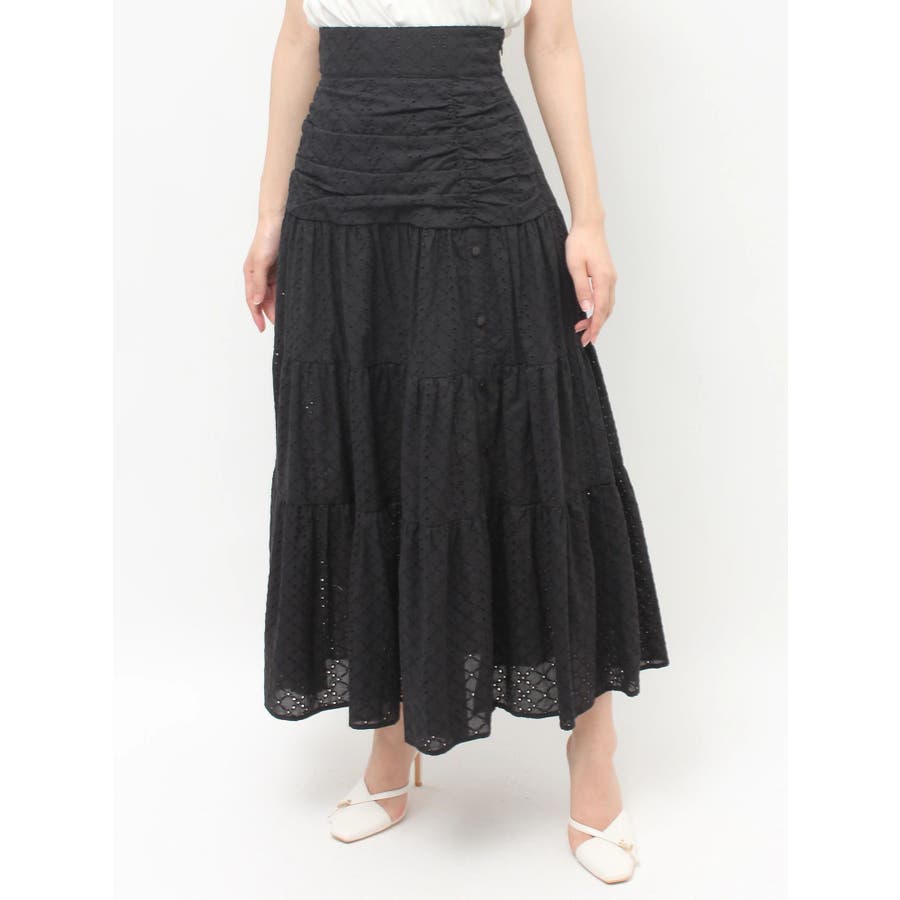 コットンレースが春らしいフレアスカート▽デザイン▽コットンレースがポイントのフレアスカート。ティアードやギャザーを寄せたデザインを入れ込み、デザイン性あるスカートに仕上げました♪フロント部分のボタンを開けていただくと脚がちらりと見えてさりげない肌見せに♪▽カラー▽白、黒、赤の3色展開。▽スタイリング▽ニットトップスやカーディガンを合わせたフェミニンなコーディネートはもちろん、Tシャツを合わせたカジュアルなスタイリングもおすすめ◎デイリー使いはもちろん、デートや記念日など特別なシーンにもピッタリのアイテムです。