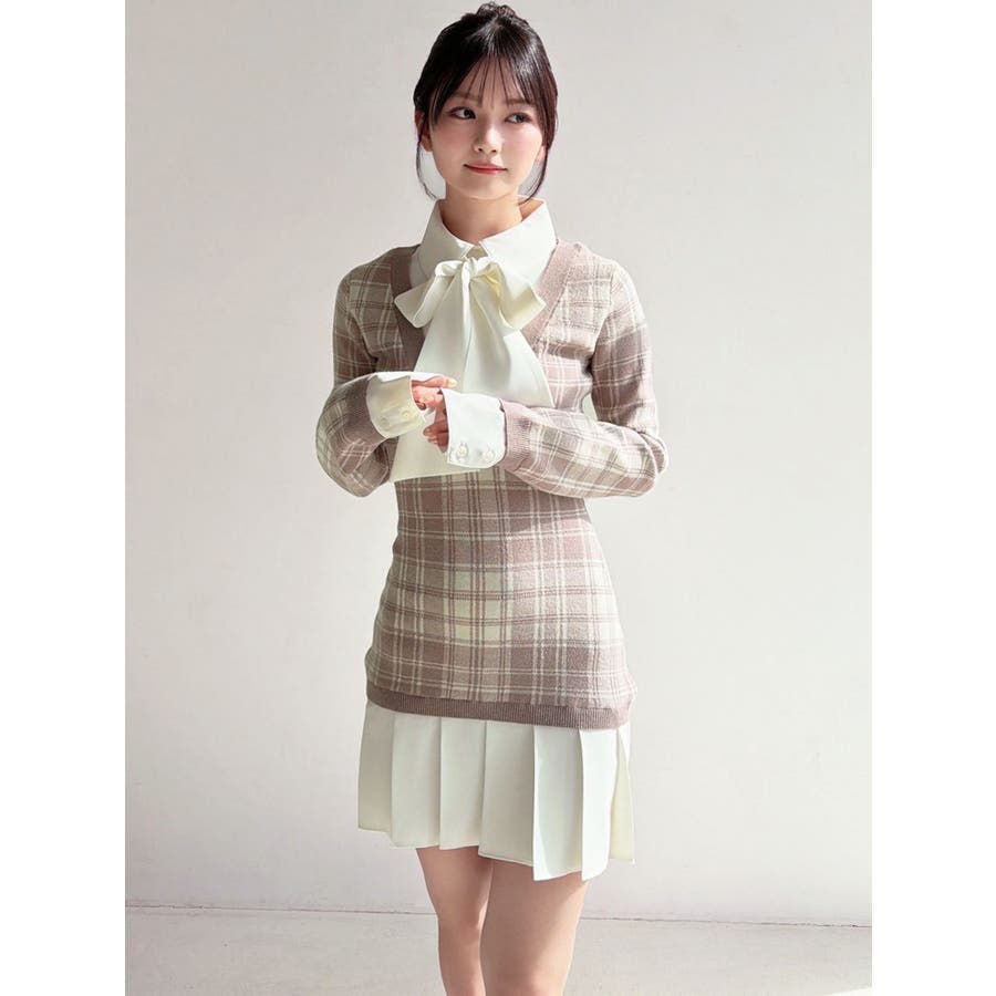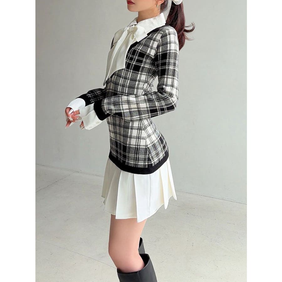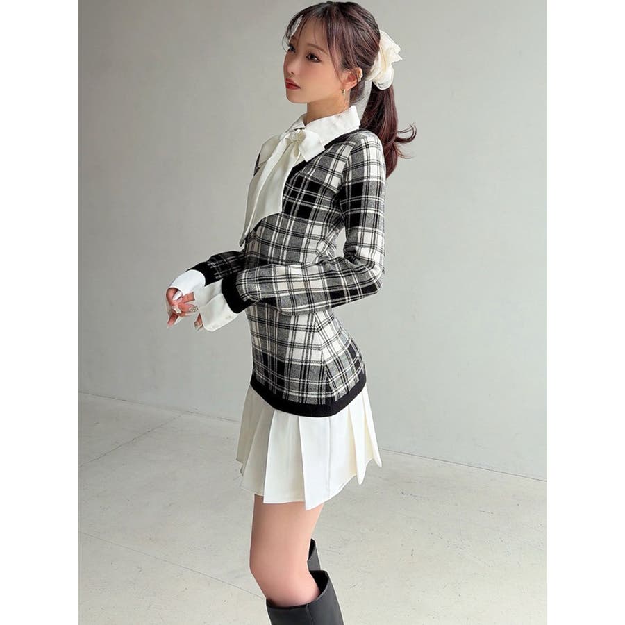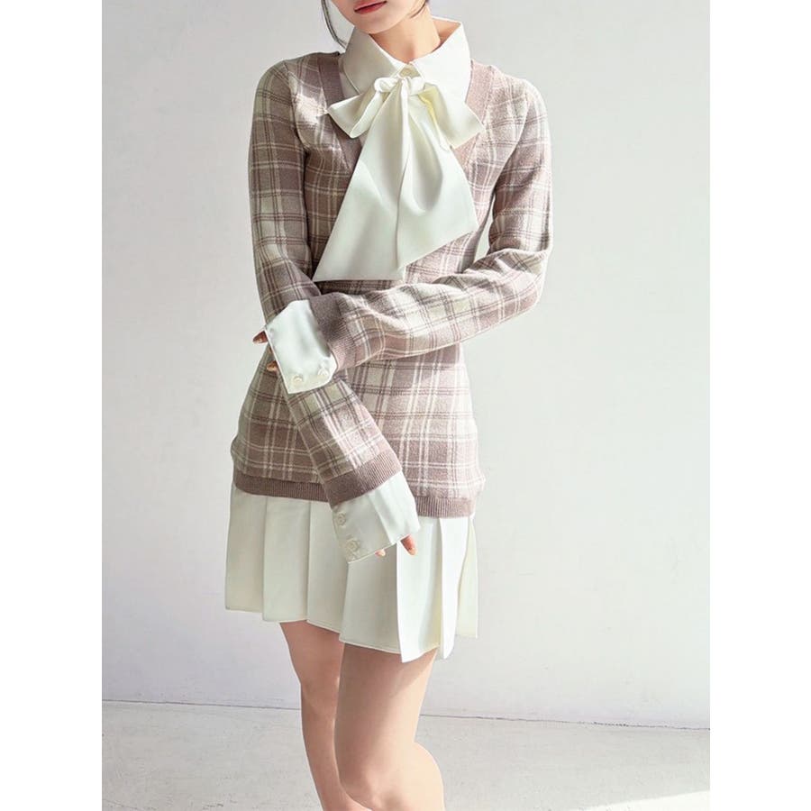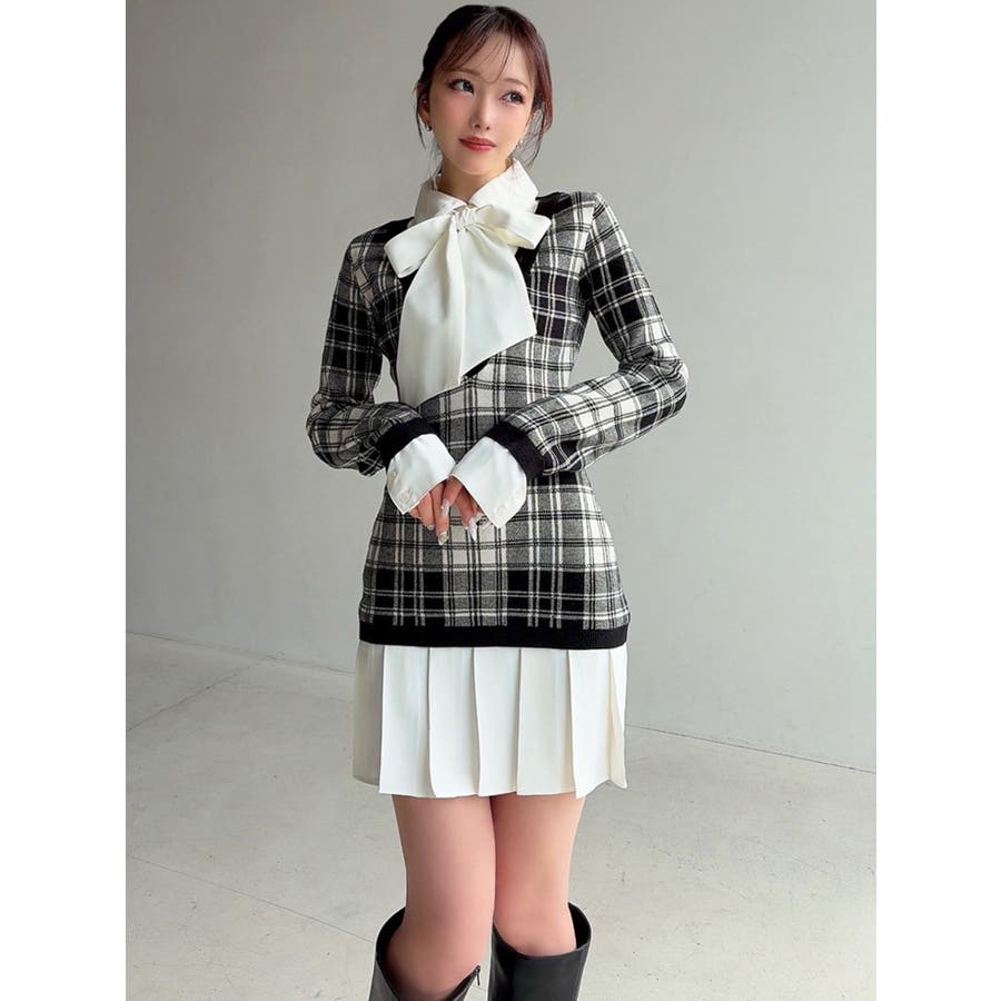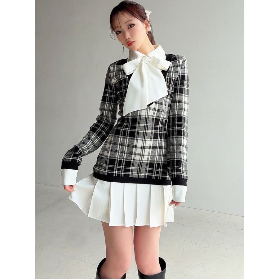 ニットとシャツワンピースのドッキングアイテム▽デザイン▽シャツワンピースにニットをドッキングしているデザインで1枚でサラッと着るだけでトレンド感のあるスタイリングが完成!緩やかなAラインシルエットで裾はプリーツになっているので美脚効果抜群◎大き目のリボンがアクセントになり華やかな印象になります。▽カラー▽黒・ネイビー・ベージュの3色展開。ネイビーは無地、黒とベージュは大判のチェック柄のニットです♪▽スタイリング▽1枚でサラッと着用で着てコーデが完成!厚手すぎないニットなので春先はアウター合わせもピッタリ◎ミニ丈なのでブーツやソックス×サンダル合わせがおすすめです♪
