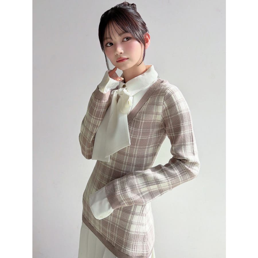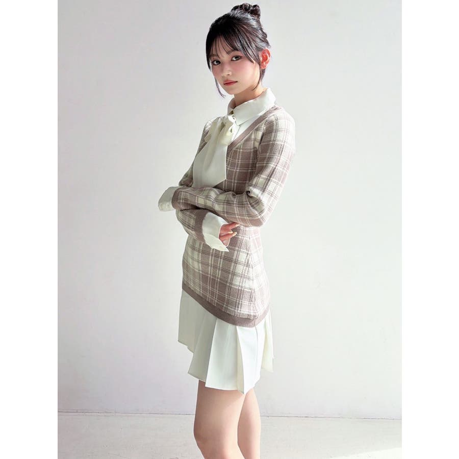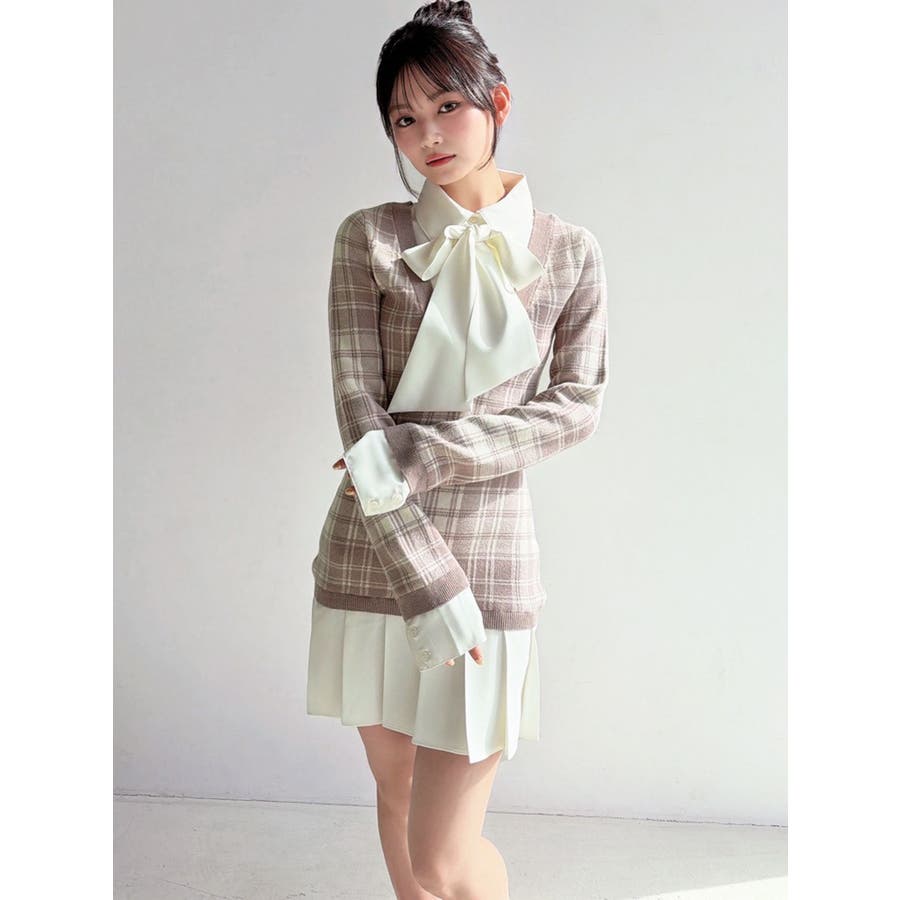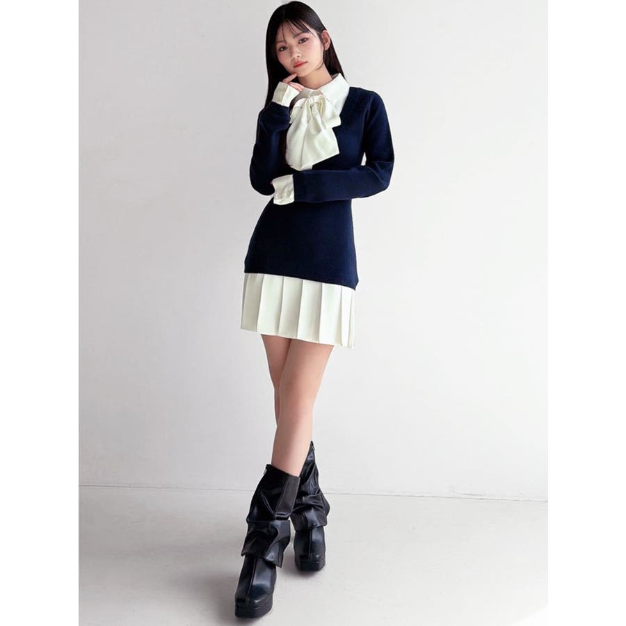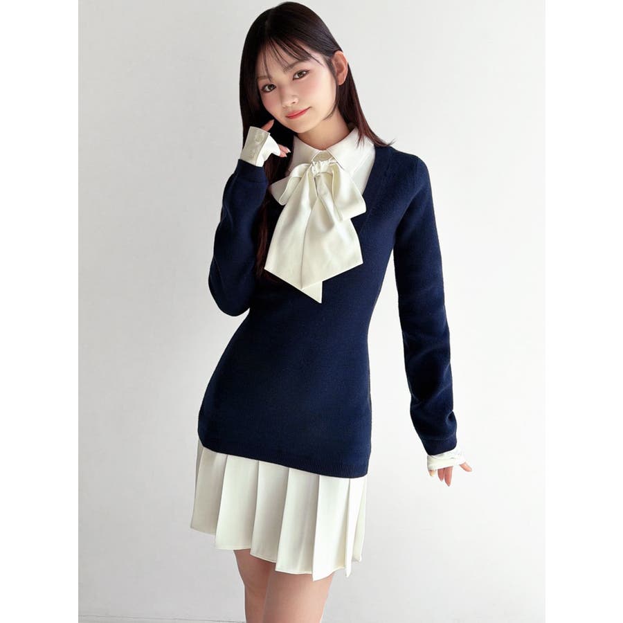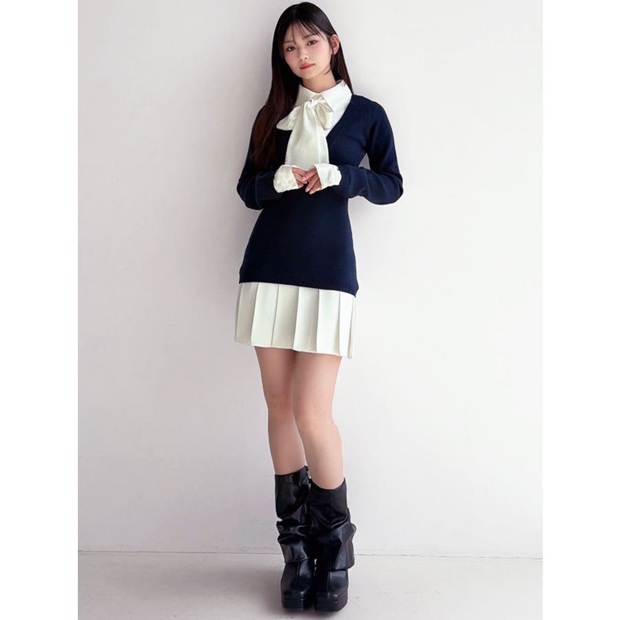 ニットとシャツワンピースのドッキングアイテム▽デザイン▽シャツワンピースにニットをドッキングしているデザインで1枚でサラッと着るだけでトレンド感のあるスタイリングが完成!緩やかなAラインシルエットで裾はプリーツになっているので美脚効果抜群◎大き目のリボンがアクセントになり華やかな印象になります。▽カラー▽黒・ネイビー・ベージュの3色展開。ネイビーは無地、黒とベージュは大判のチェック柄のニットです♪▽スタイリング▽1枚でサラッと着用で着てコーデが完成!厚手すぎないニットなので春先はアウター合わせもピッタリ◎ミニ丈なのでブーツやソックス×サンダル合わせがおすすめです♪