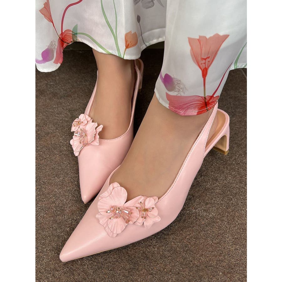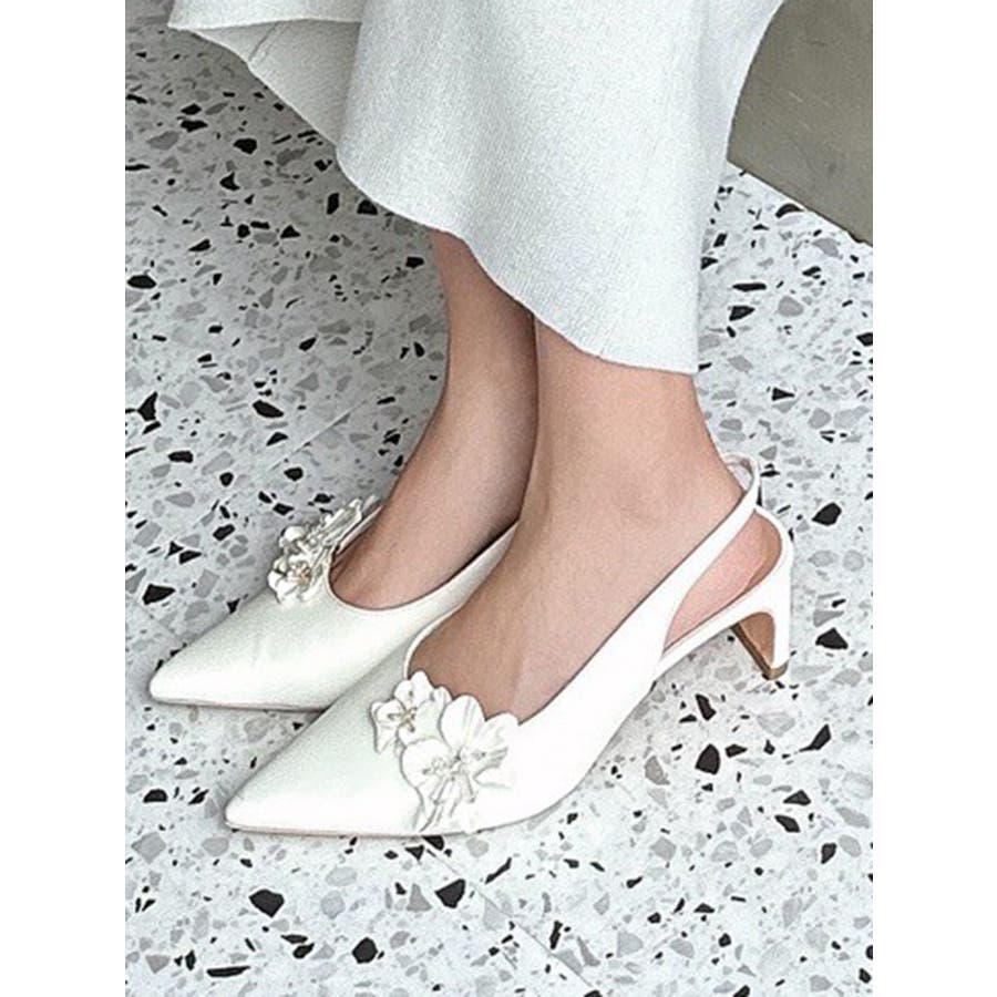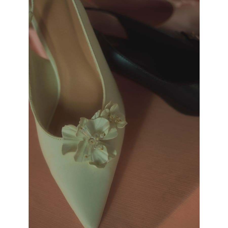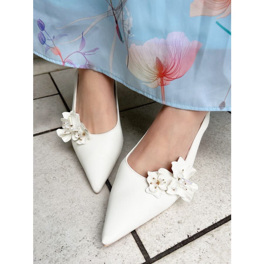 フラワーモチーフが目を惹くポインテッドミュール▽デザイン▽フラワーモチーフにはクリア素材のビーズを付けたことでアクセントになり、春らしいさわやかさを表現。モチーフは取り外し可能なのでシンプルなミュールとしても着用可能◎ヒールはローヒールなので歩きやすく、中敷きにクッションを入れているので履き心地抜群の1足になります♪▽カラー▽白・黒・ピンクの3色展開。