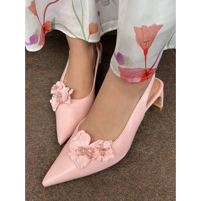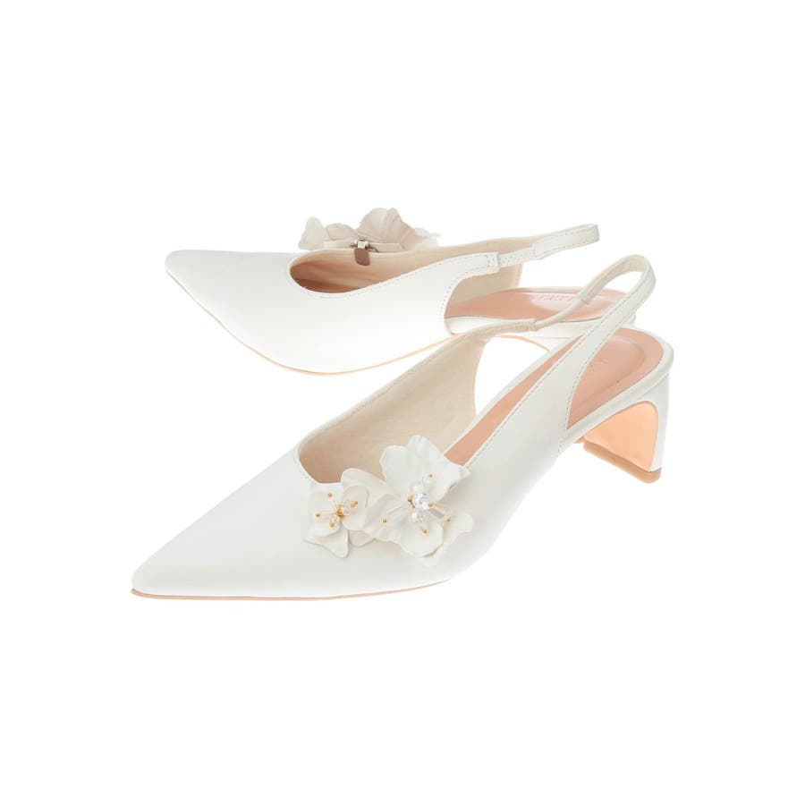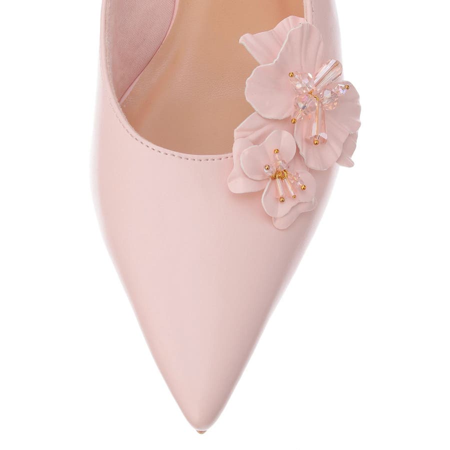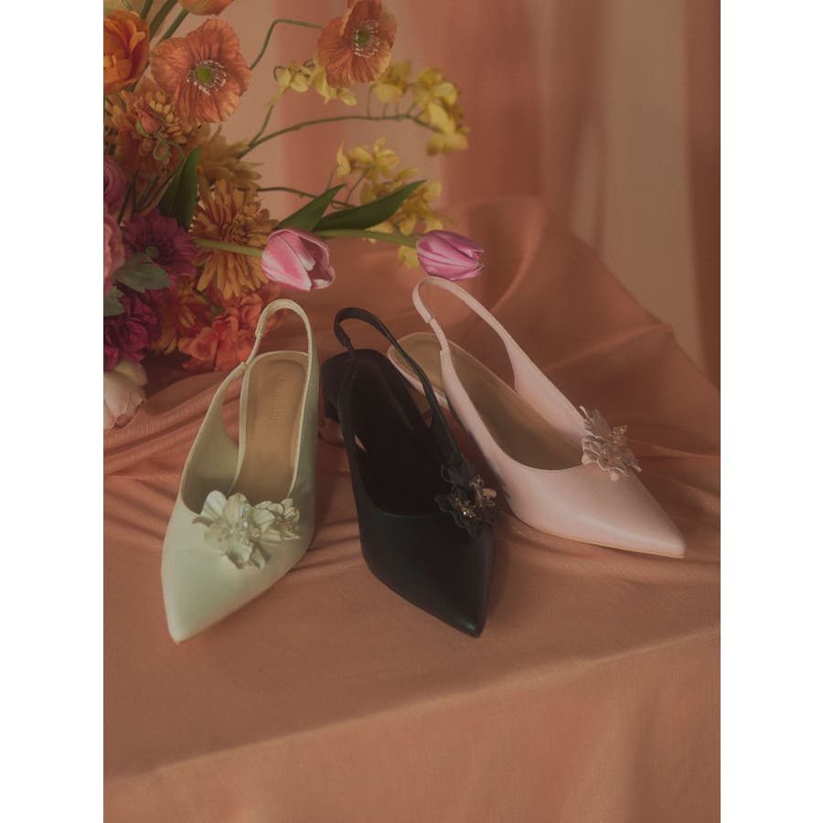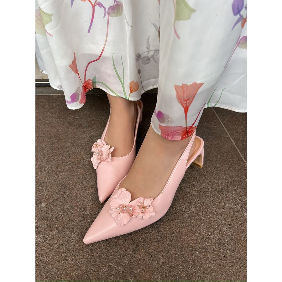 フラワーモチーフが目を惹くポインテッドミュール▽デザイン▽フラワーモチーフにはクリア素材のビーズを付けたことでアクセントになり、春らしいさわやかさを表現。モチーフは取り外し可能なのでシンプルなミュールとしても着用可能◎ヒールはローヒールなので歩きやすく、中敷きにクッションを入れているので履き心地抜群の1足になります♪▽カラー▽白・黒・ピンクの3色展開。