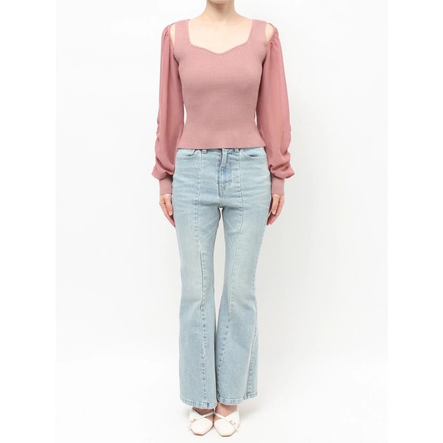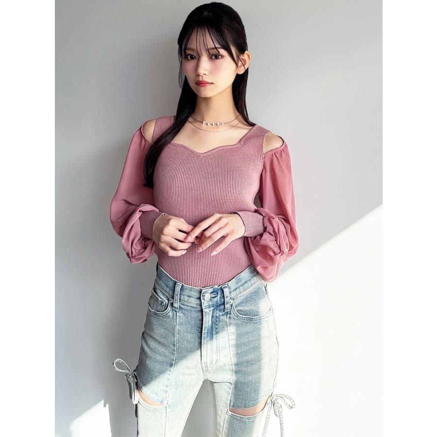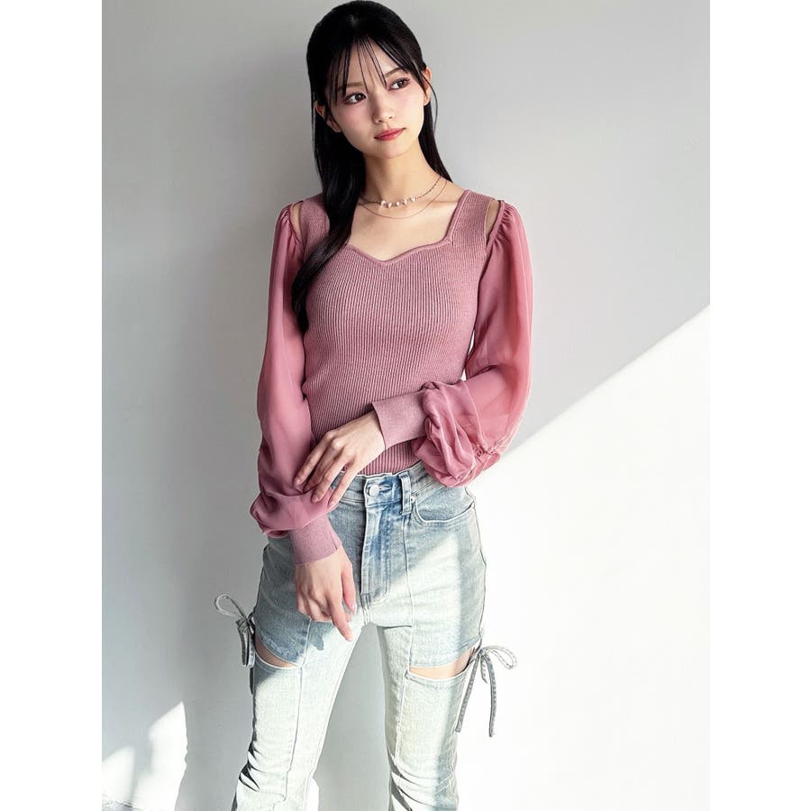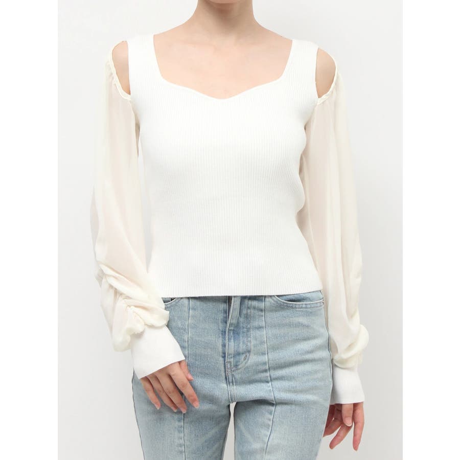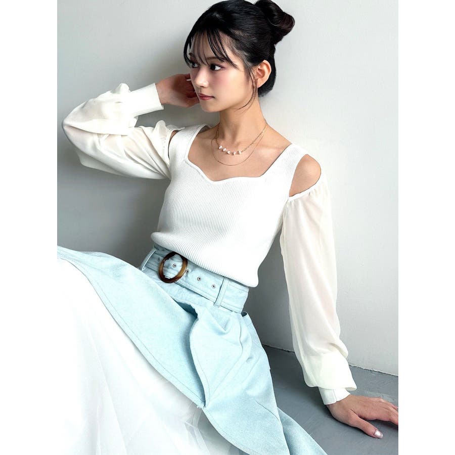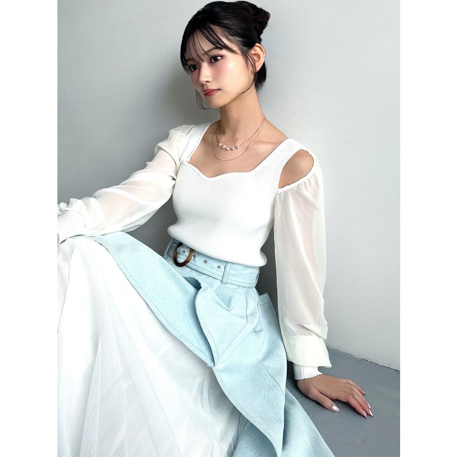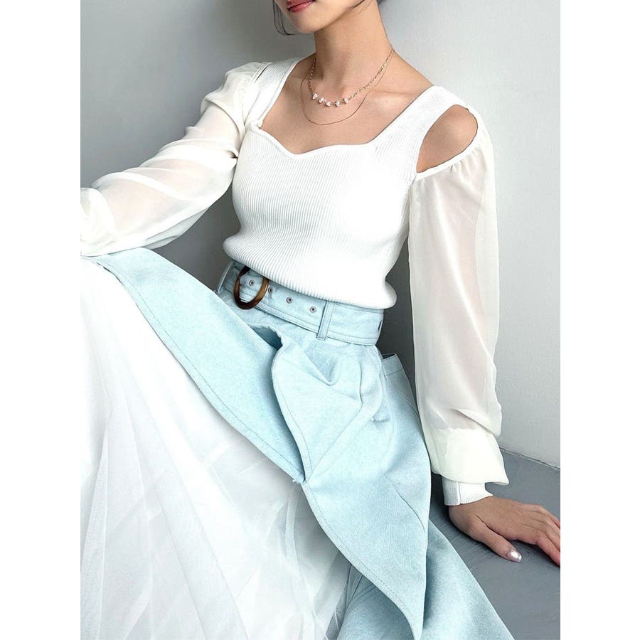 肩幅の華奢見せが叶う控えめな肌見せがポイントです。袖をシアーニットにすることで柔らかで抜け感のあるレディな雰囲気に仕上げました。