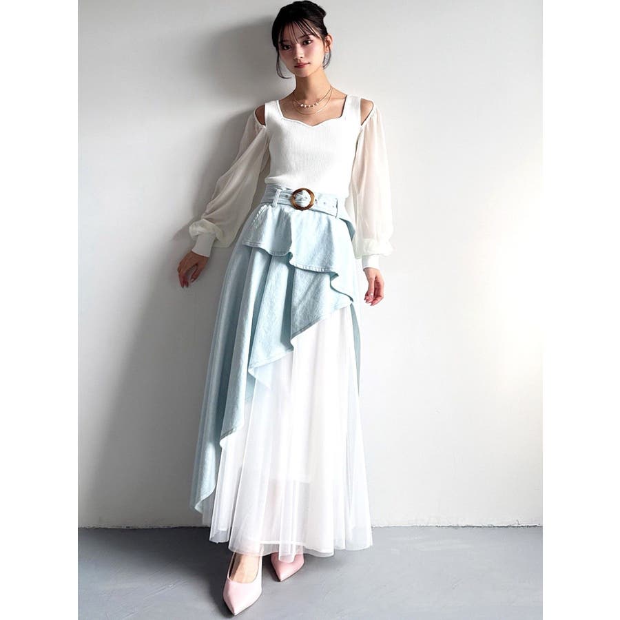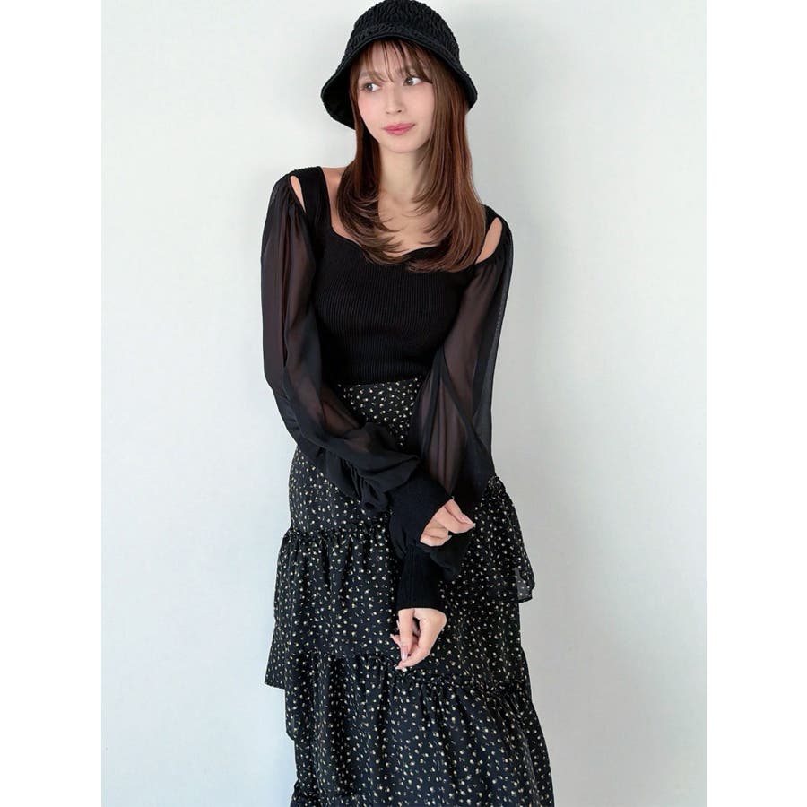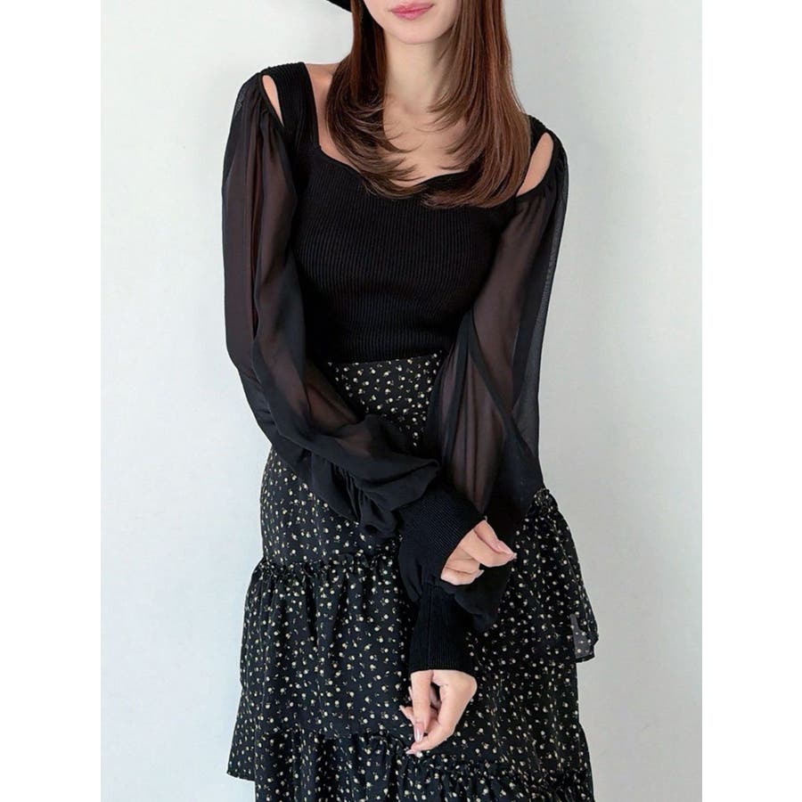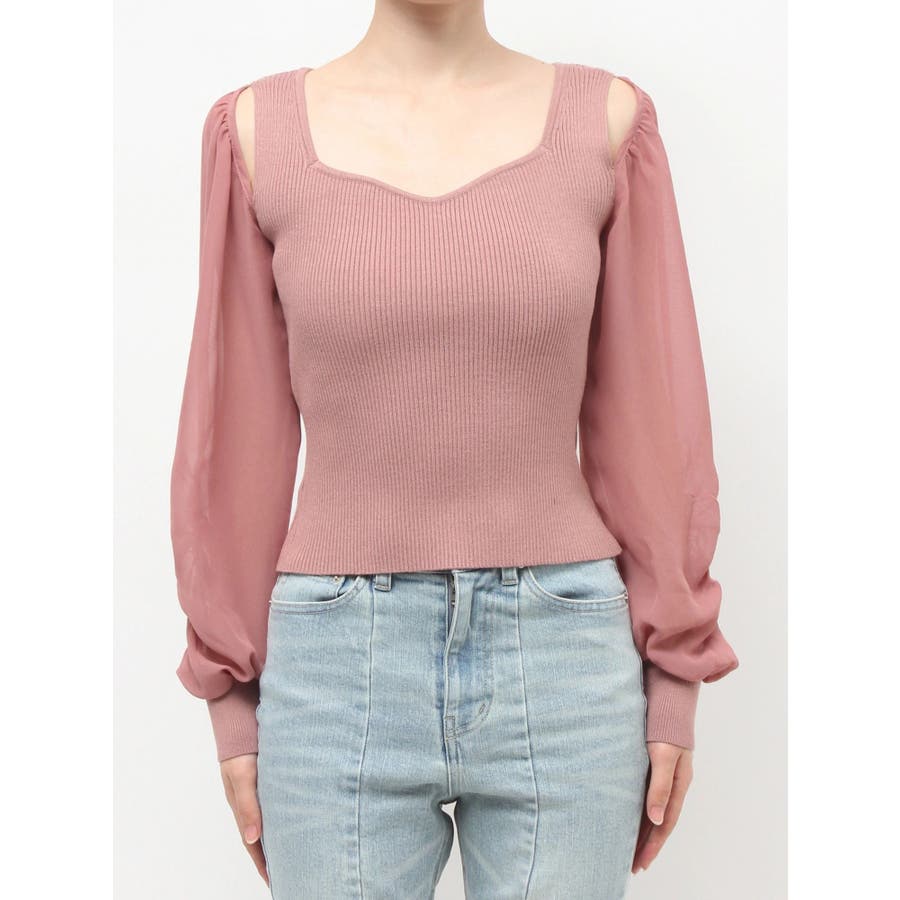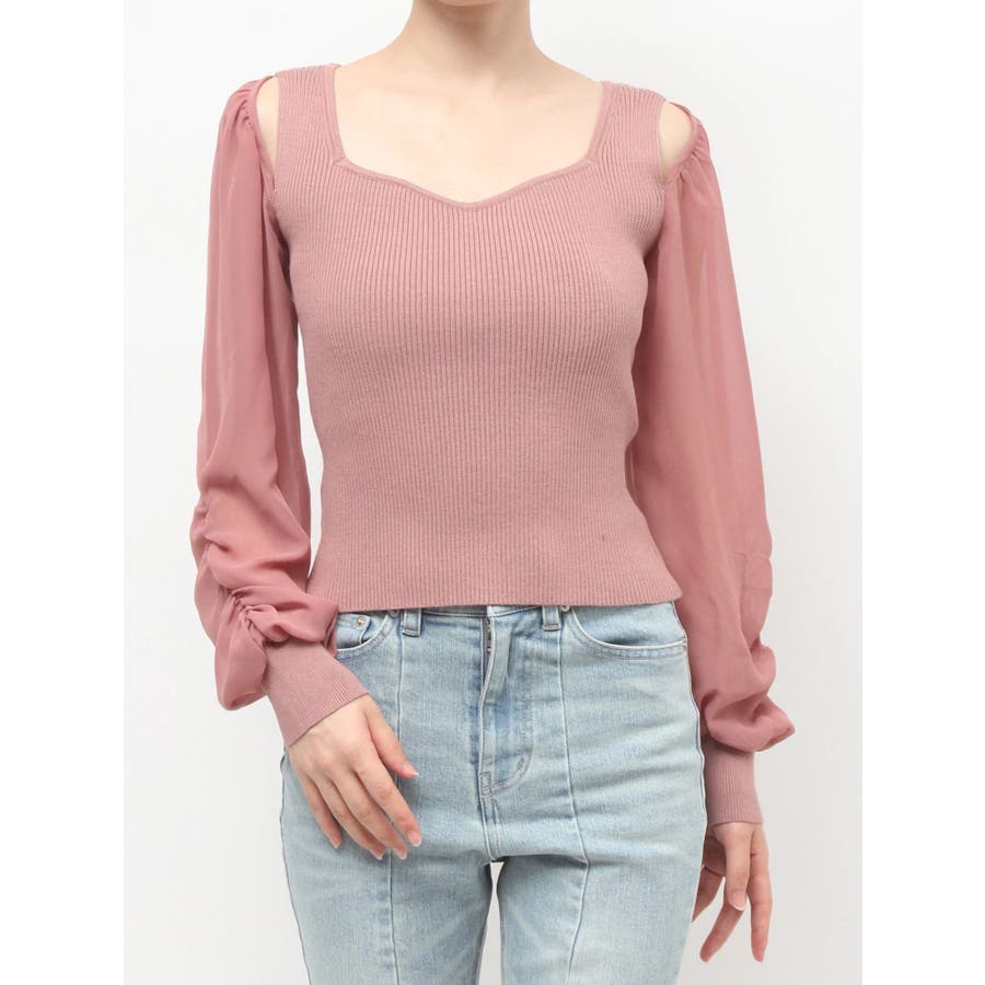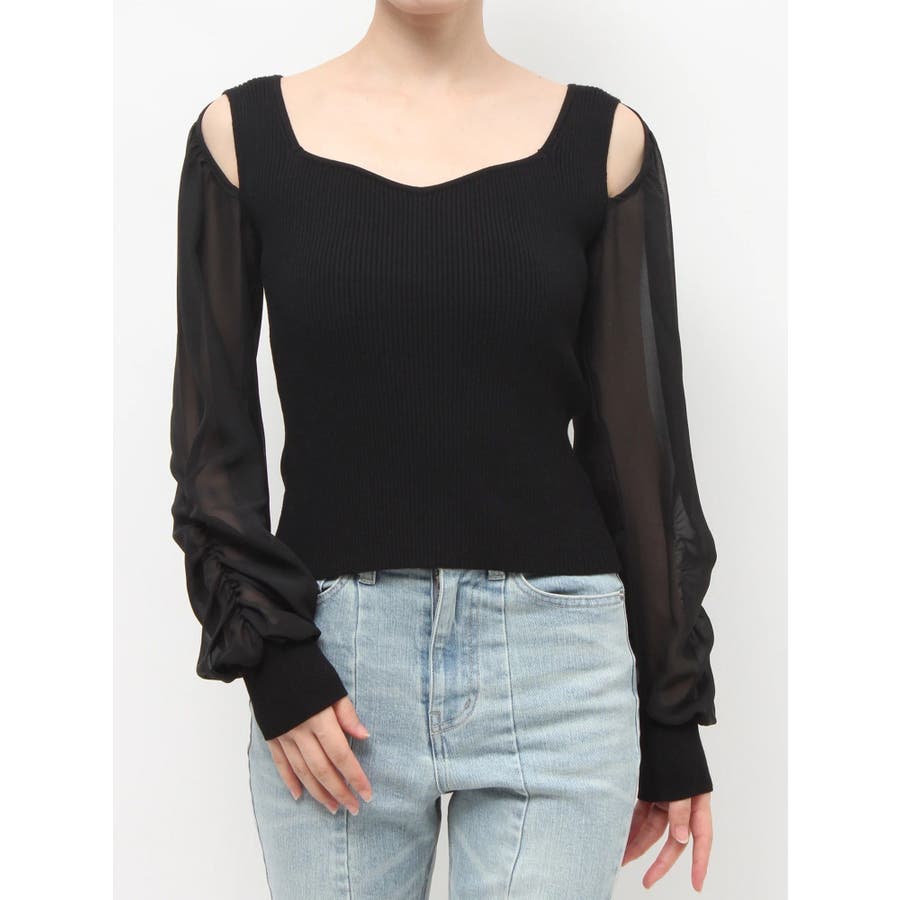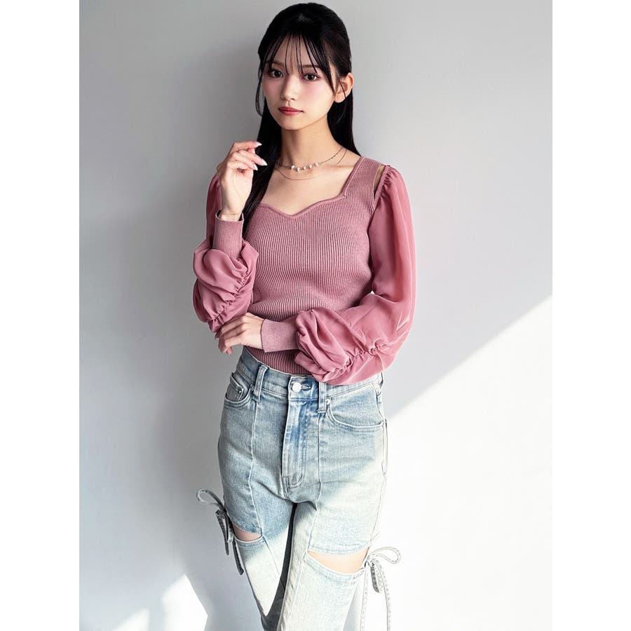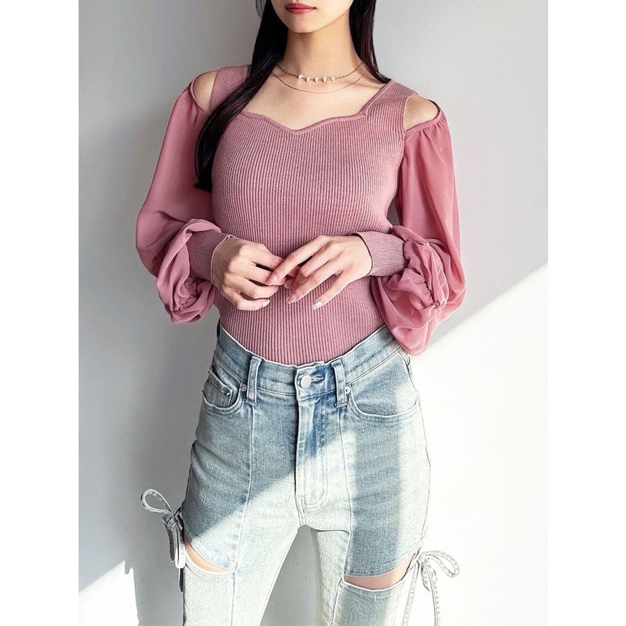 肩幅の華奢見せが叶う控えめな肌見せがポイントです。袖をシアーニットにすることで柔らかで抜け感のあるレディな雰囲気に仕上げました。