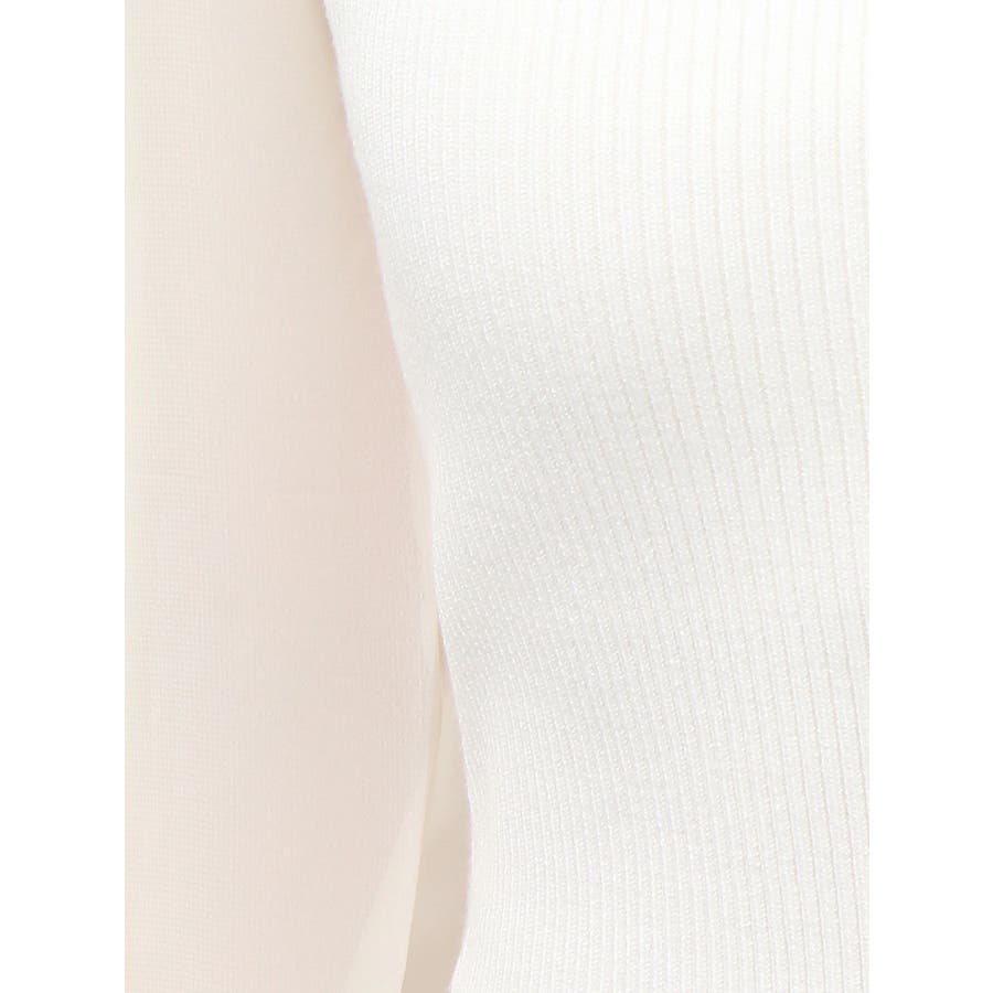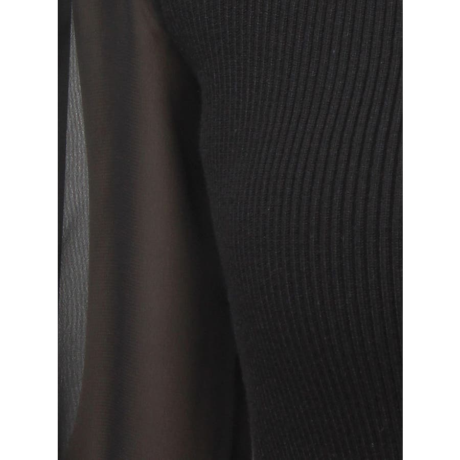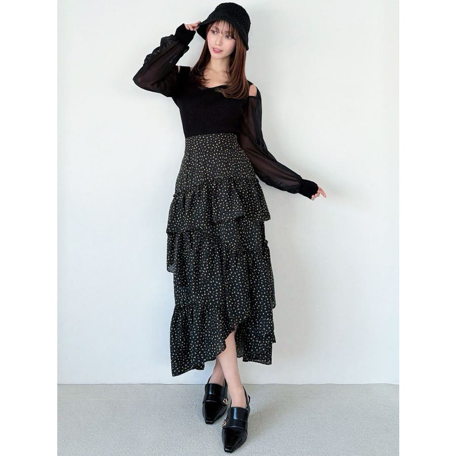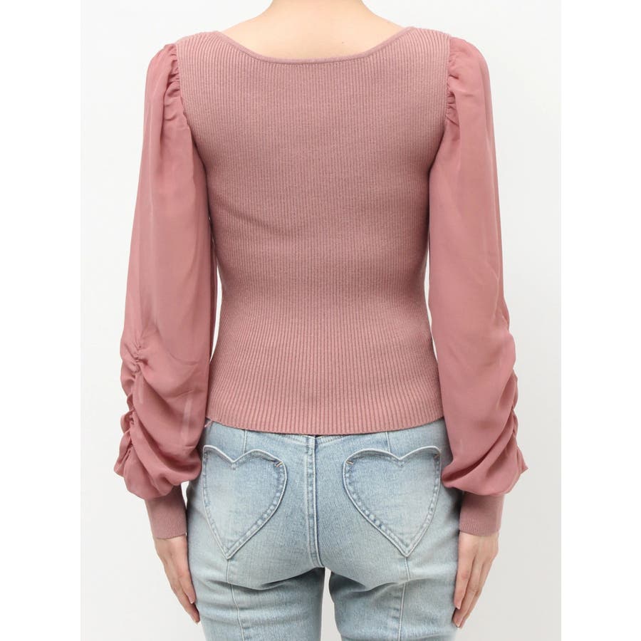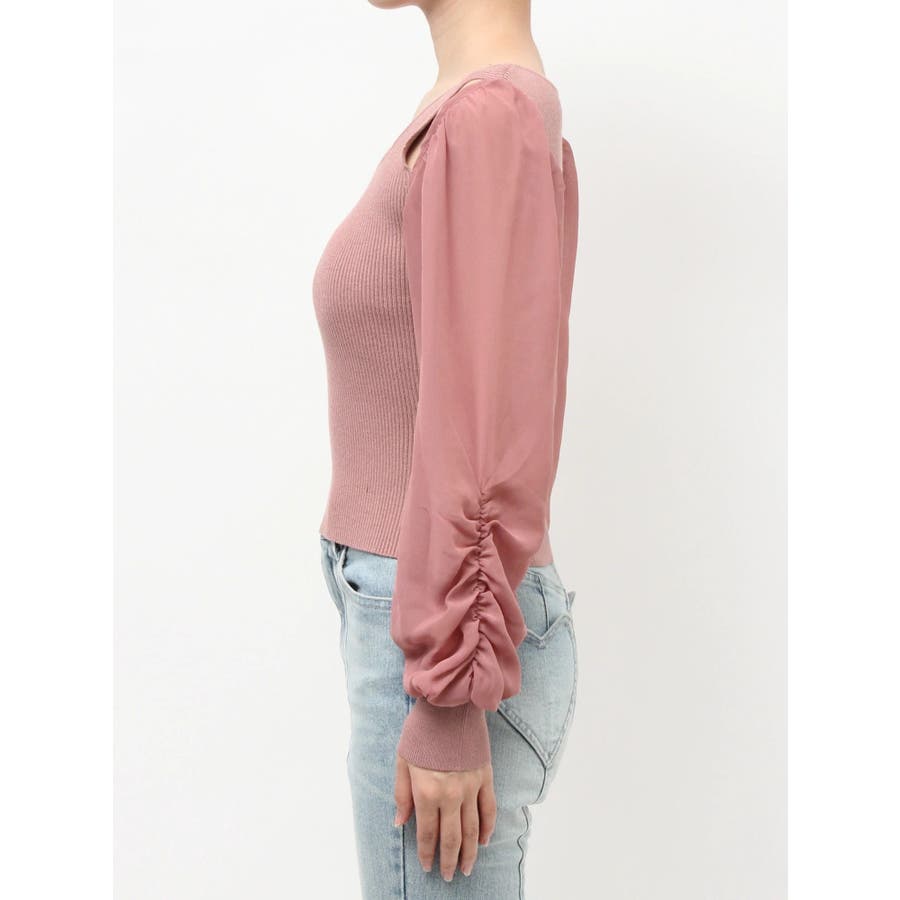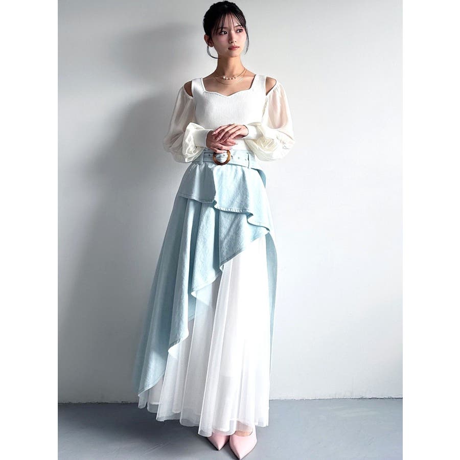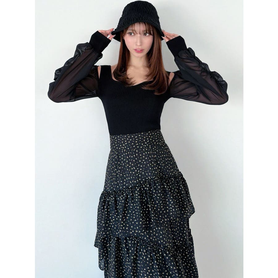 肩幅の華奢見せが叶う控えめな肌見せがポイントです。袖をシアーニットにすることで柔らかで抜け感のあるレディな雰囲気に仕上げました。