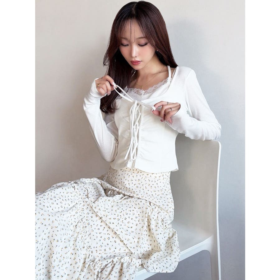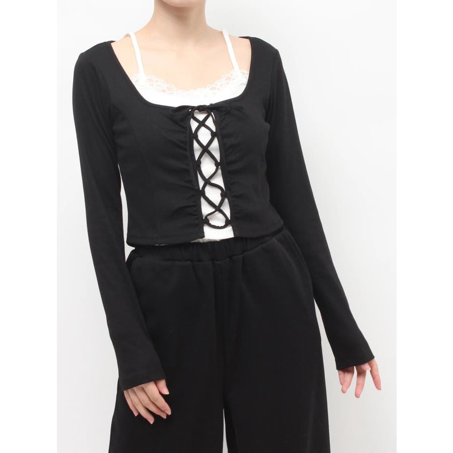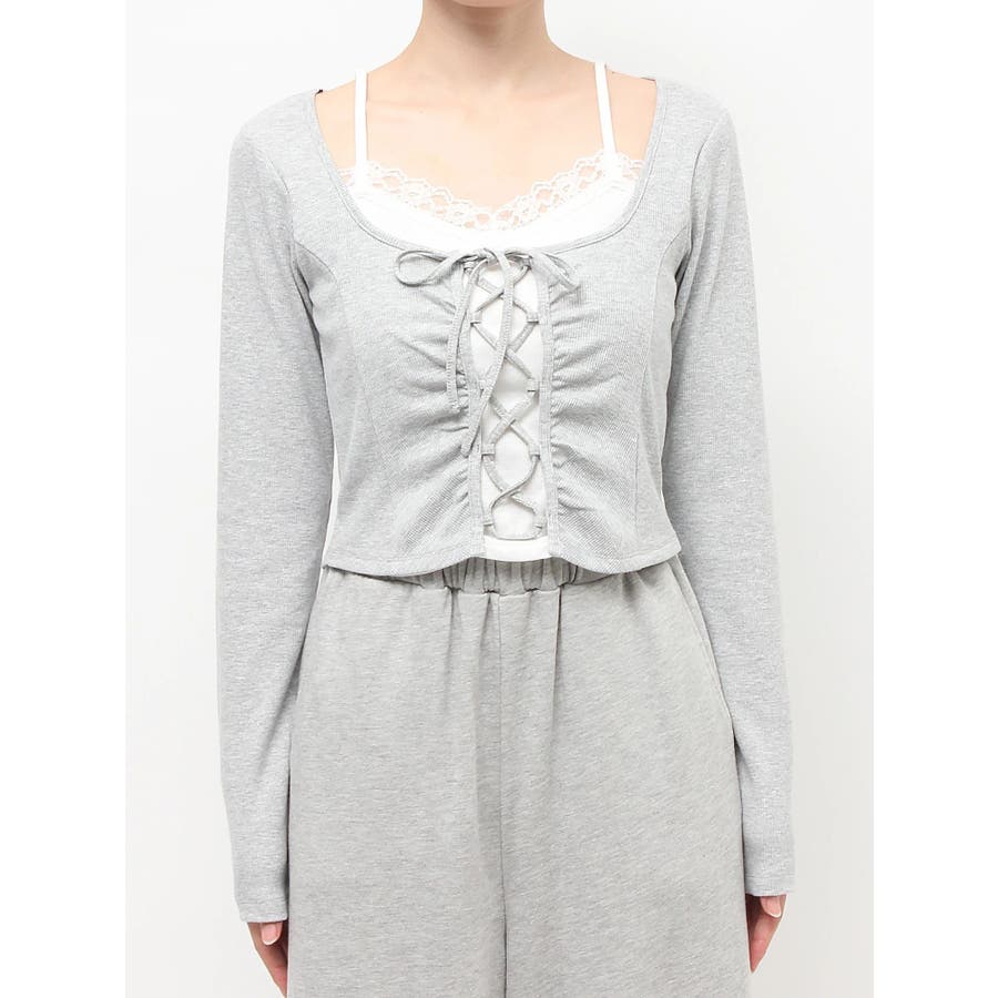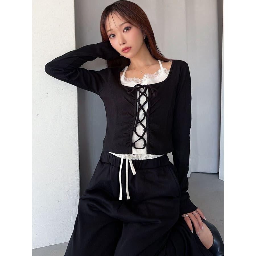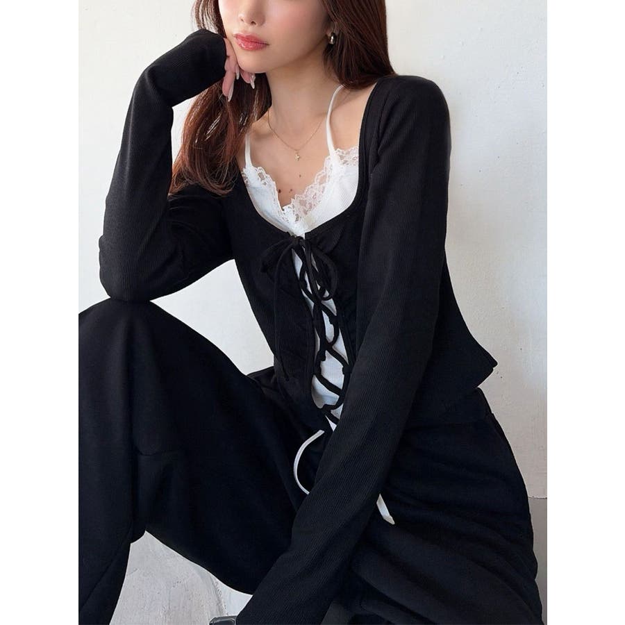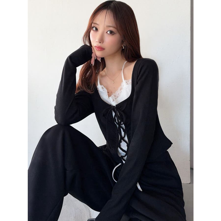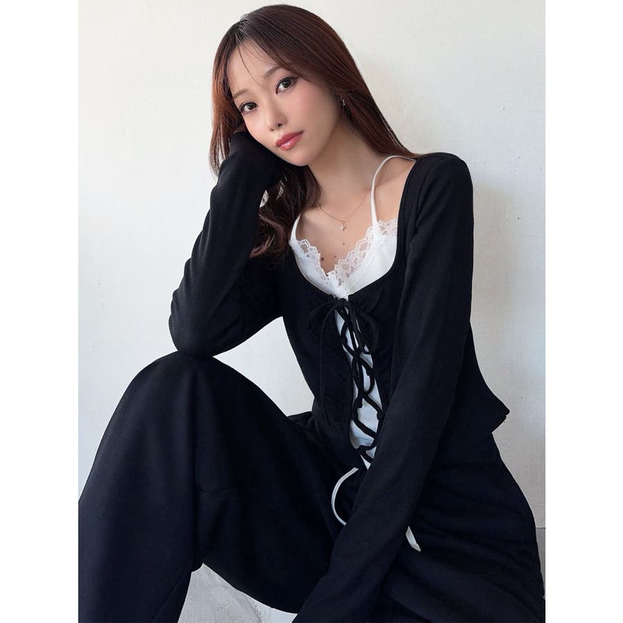 インナーは華奢なレースキャミでミニマルに、フロント部分はレースアップデザインにすることで華やかな印象に仕上げました。