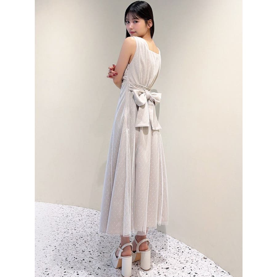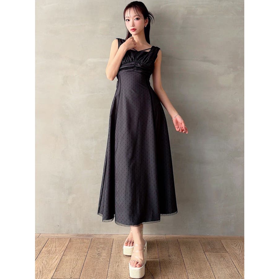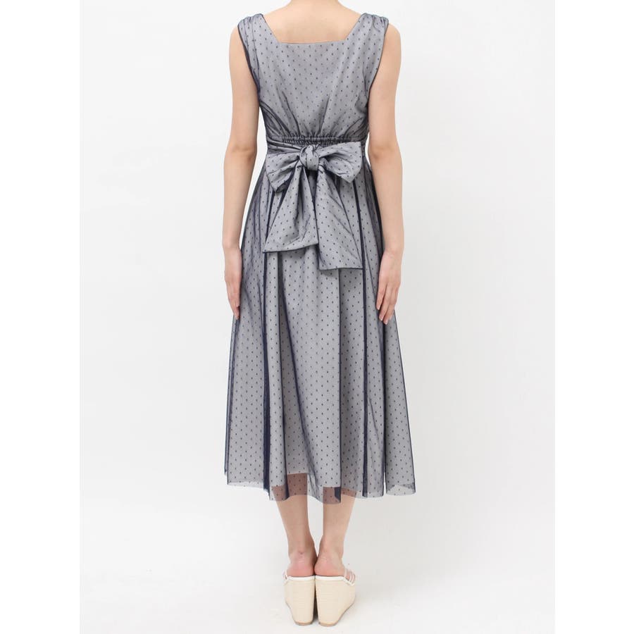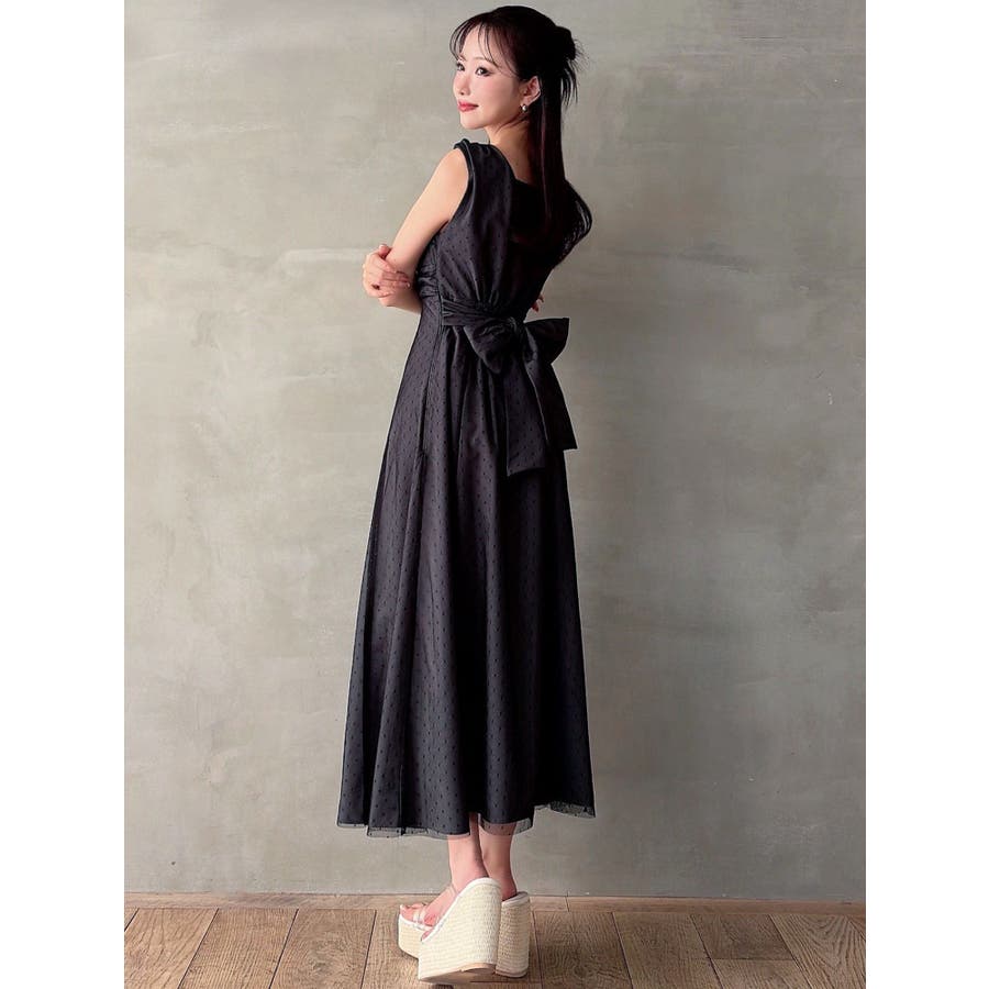 今季イチオシのフレアワンピース▽デザイン▽ドットチュールをレイヤードし、上品な印象のワンピースに仕上げました♪透け感とデザイン性で高見えするイチオシアイテムです。ポイントでギャザーをよせたり、バックウエストは大き目のリボンデザインにしたことで女性らしさをプラス。リボンでウエストのサイズ調節ができるのでウエストラインを強調でき、スカートのフレアシルエットとのメリハリが美しいフィットフレアシルエットを演出します。▽カラー▽黒・ネイビー・ベージュの3色展開。▽スタイリング▽1枚でサラッと着用できて大人なキレイ目コーデが完成。ノースリーブなので羽織りもマッチします◎デイリー使いはもちろん、デートやお呼ばれなど様々なシーンで活躍します。