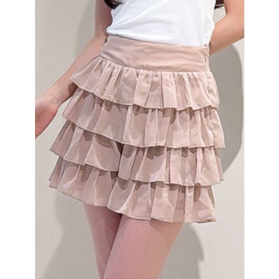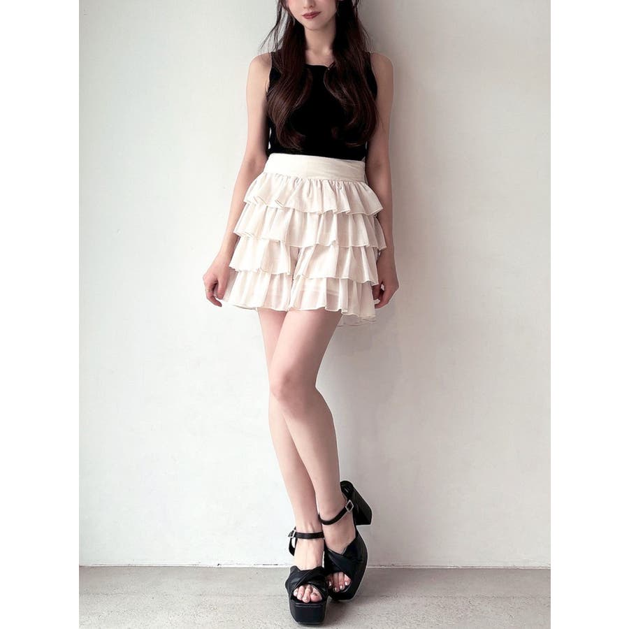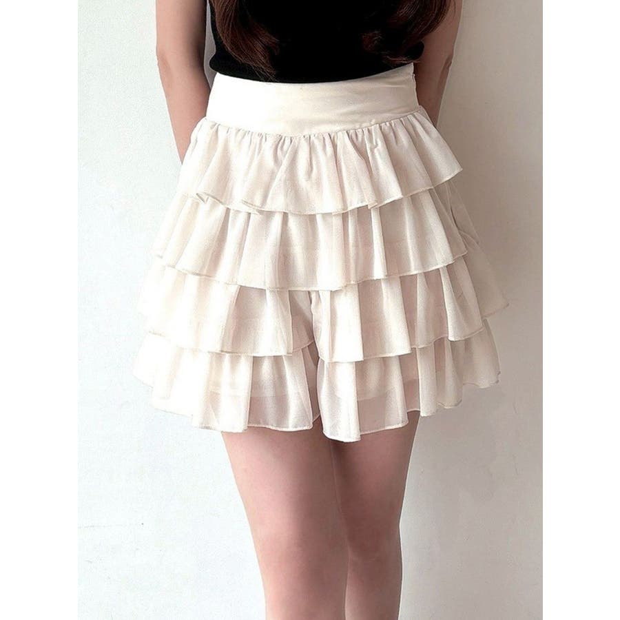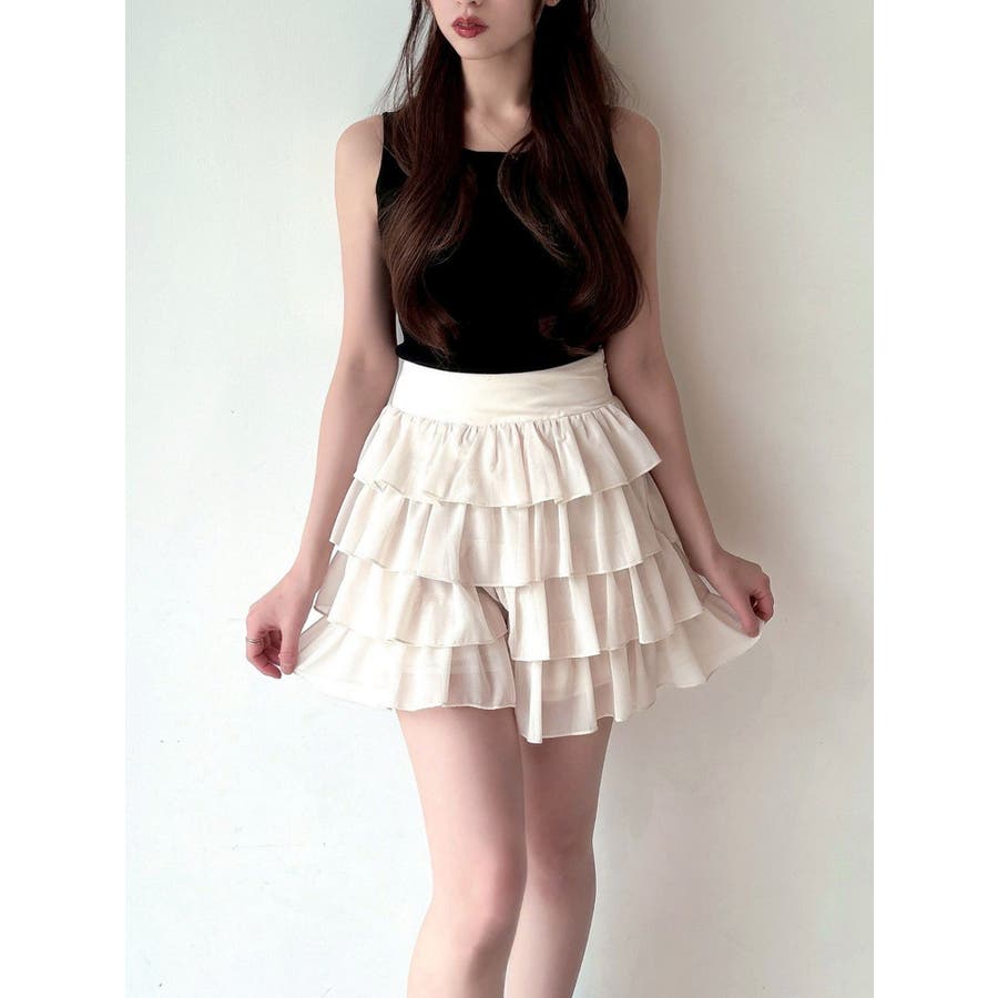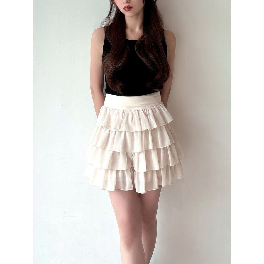 フリルデザインでボリューム感が可愛いショートパンツ▽デザイン▽フリルデザインの程よいボリューム感がトレンドルックに。スカートに見えてショートパンツの作りになっているので短めの着丈でも安心して着用いただけます。ハイウエストでウエスト幅がしっかりあるのでウエストラインの細見え効果も抜群!透け感のあるフリルを重ねているので抜け感があり、夏場にもピッタリの1着です。▽カラー▽白・黒・ピンクの3色展開。▽スタイリング▽同色のチュニックブラウスを合わせればセットアップ着用でワンピース見えのコーデに♪ハイウエストなのでお持ちのトップス合わせでもスタイルアップが叶うトレンドコーデが完成。春先や秋口にはゆるっとスウェットを合わせて裾からフリルを見せるのも可愛いです◎