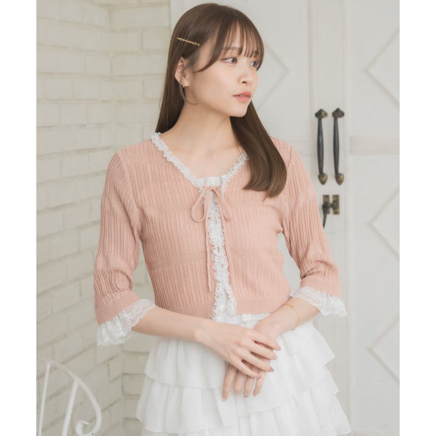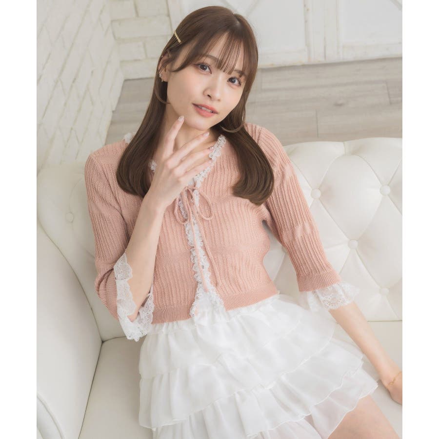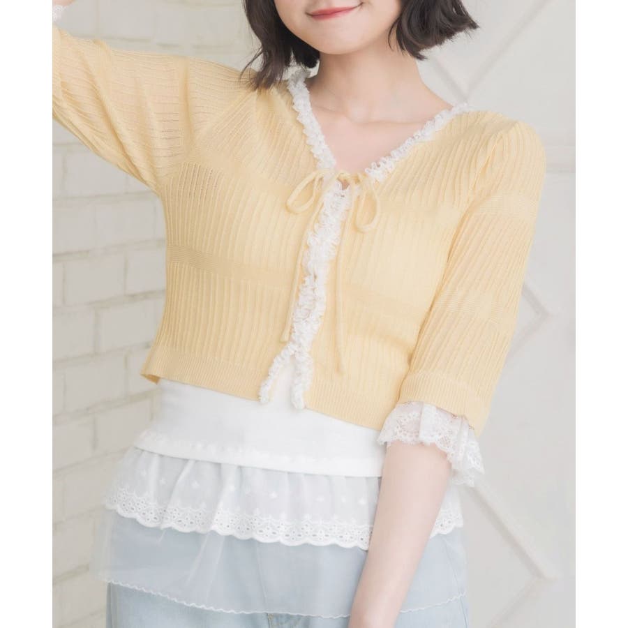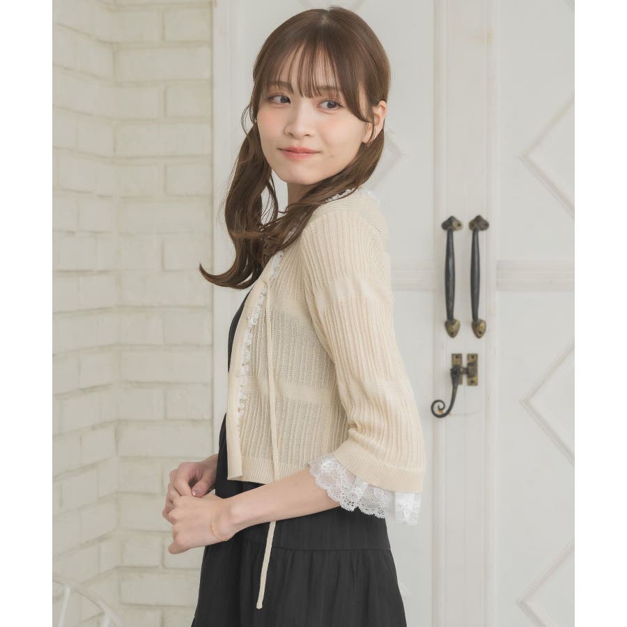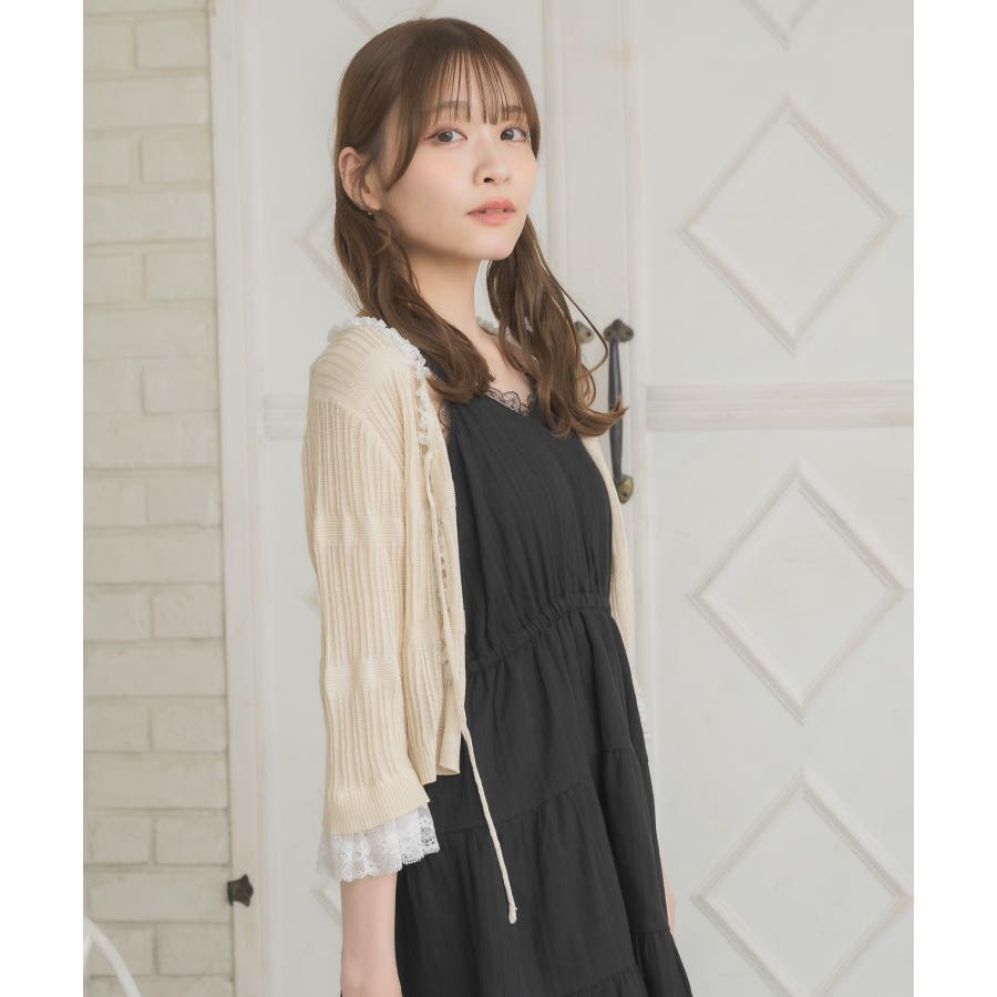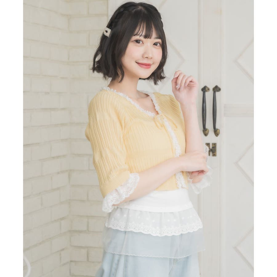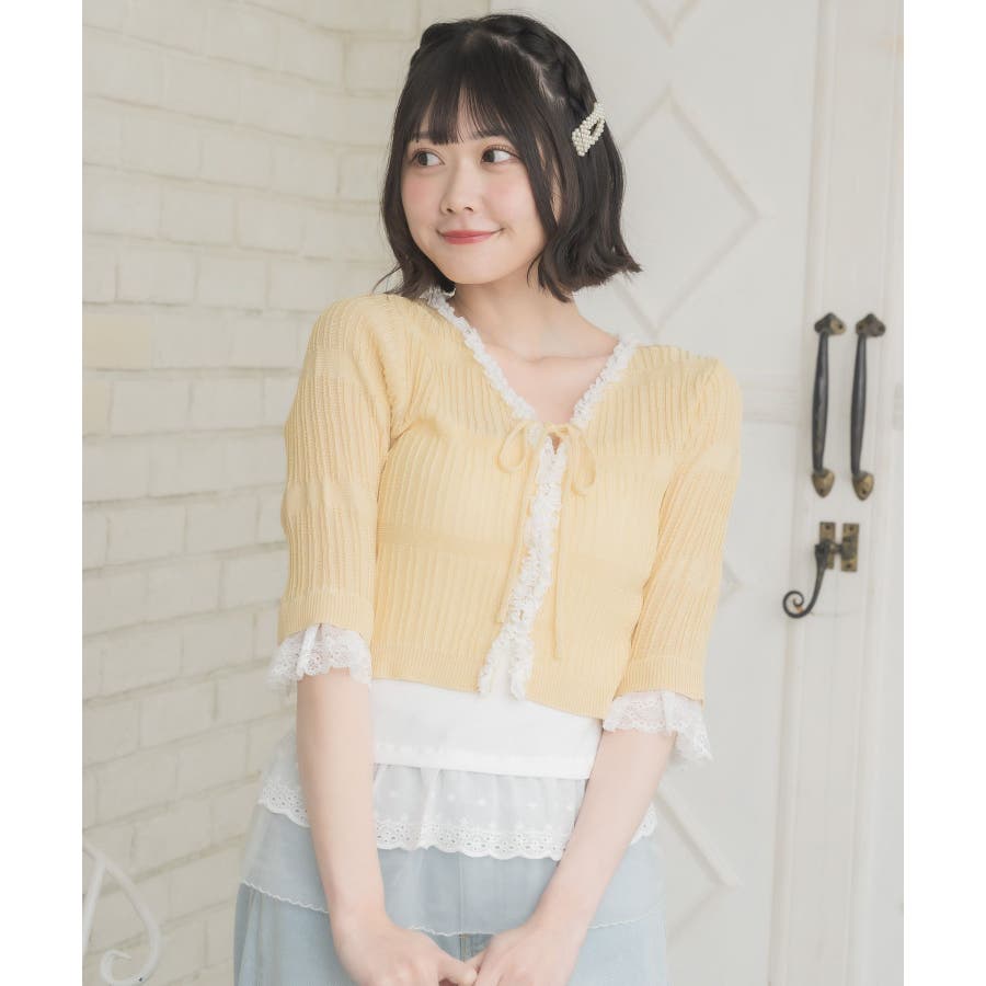 <冬に大人気を頂いたブローチセットのカーディガンがサマースタイルに♪>▼デザイン夏に嬉しい軽い素材のカーディガン。周りはレースで縁取りされていて、華やかな印象のアイテムです。袖口はふわっと広がるレースが動くたびに女性らしい印象に♪胸元のリボンとフックで着脱可能です◎▼コーディネート羽織っても、着用がおすすめのアイテム。夏も使いやすい透け感ある素材で、キャミワンピやカーディガンに1枚プラスしたい時におすすめです。------------------------------生地感:やや薄手伸縮性:ある透け感:ややある裏地:なし------------------------------▼ブランド紹介ems excite (エムズエキサイト)“more fun more cute”今をもっと楽しくもっと可愛くいたい女の子に向けたgirly cuteなブランド#スカシ編み #サマーニット #サマーニットカーデ #カーディガン #レース #五分袖 ▼注意事項※撮影環境やモニター環境によって実際の商品とお色味が 多少異なってみえる場合がございます。品番:EL518112B001 / 品名:レース付きフリルカーデ