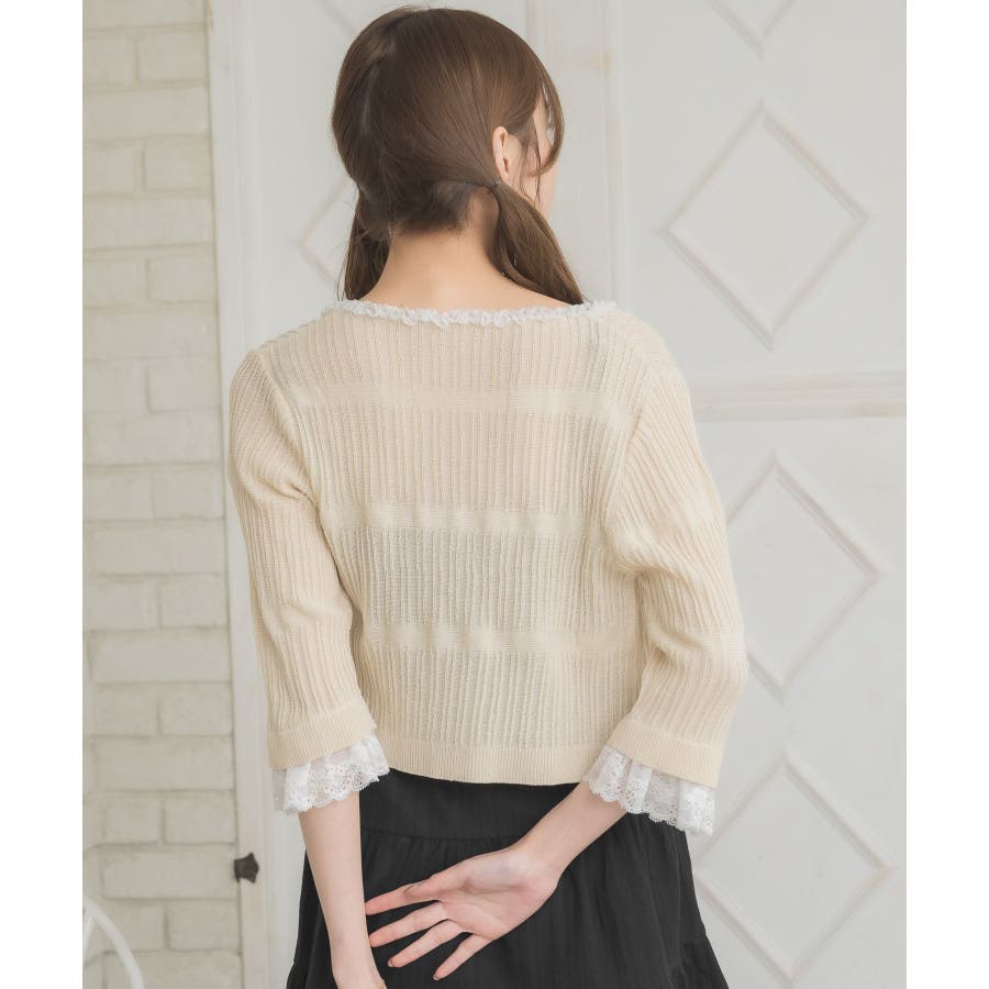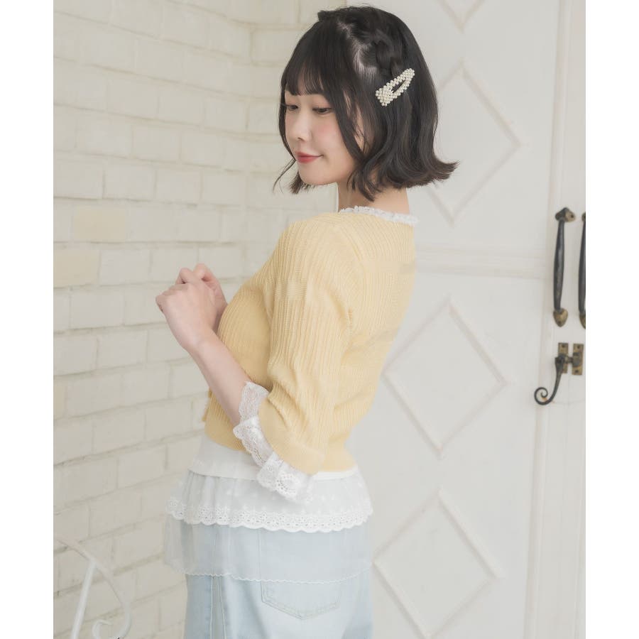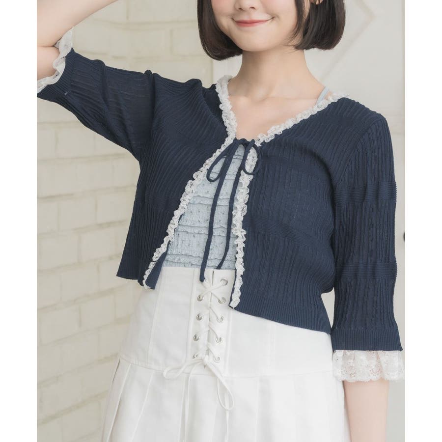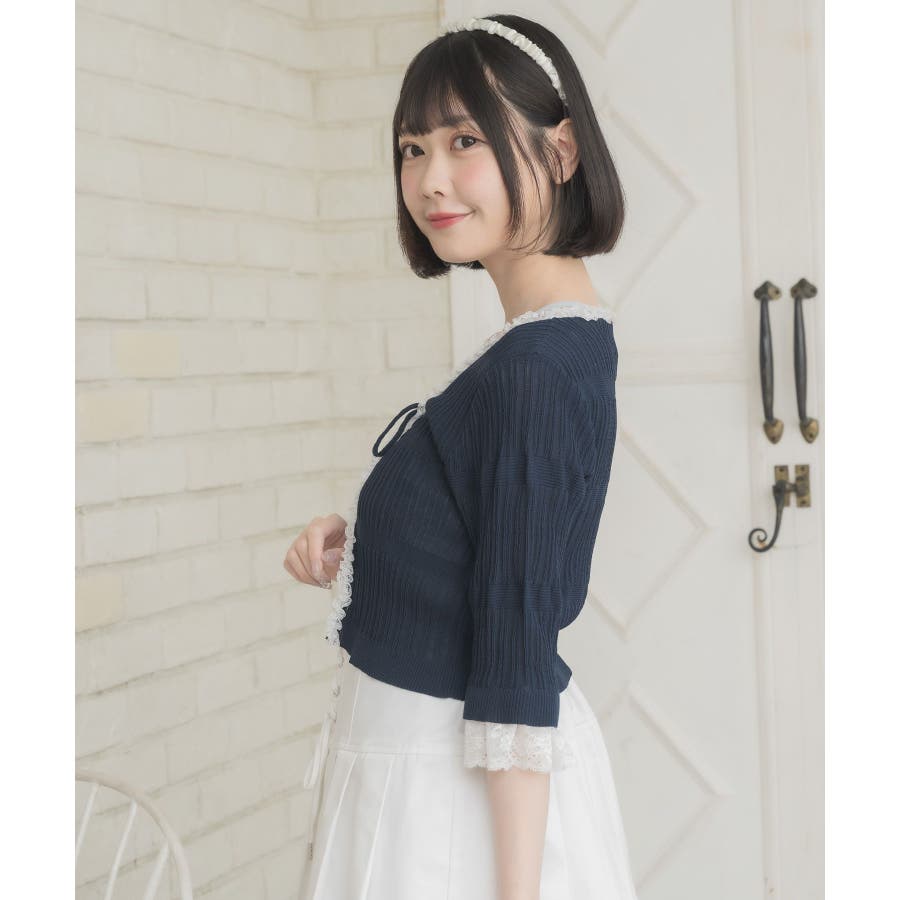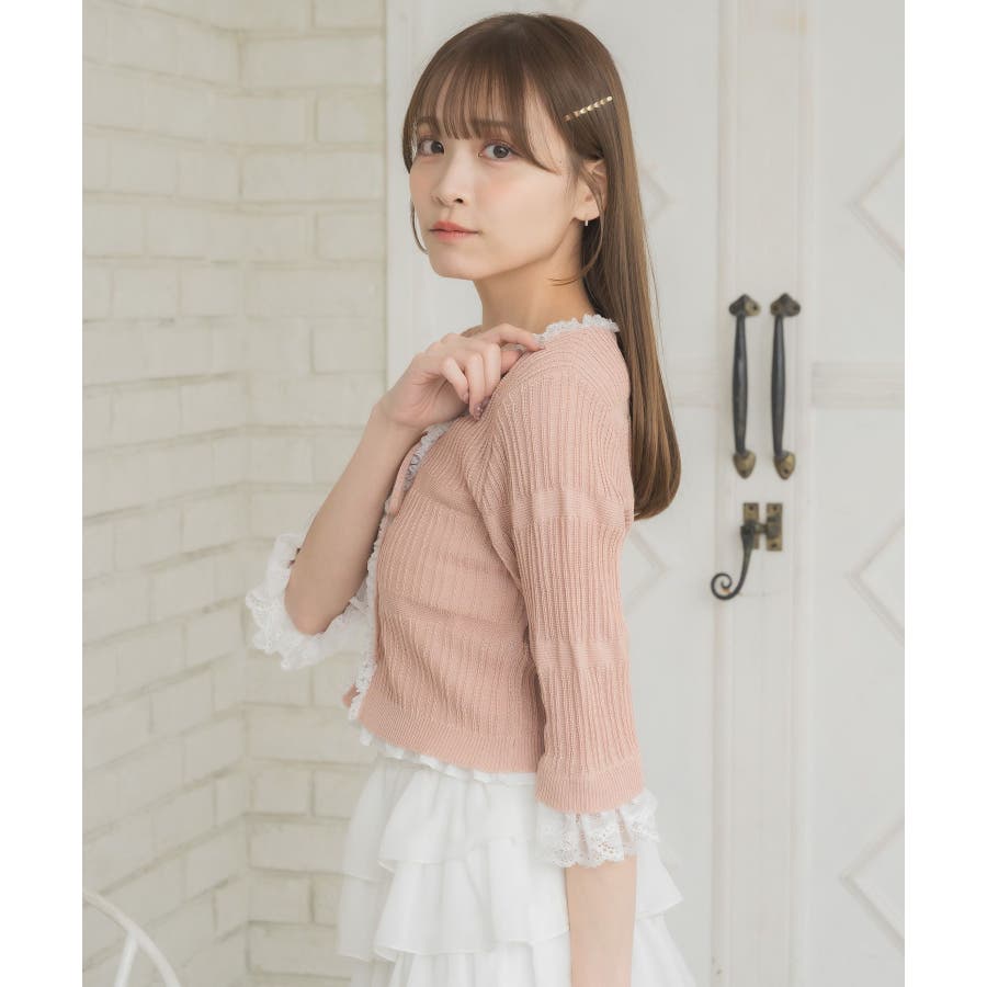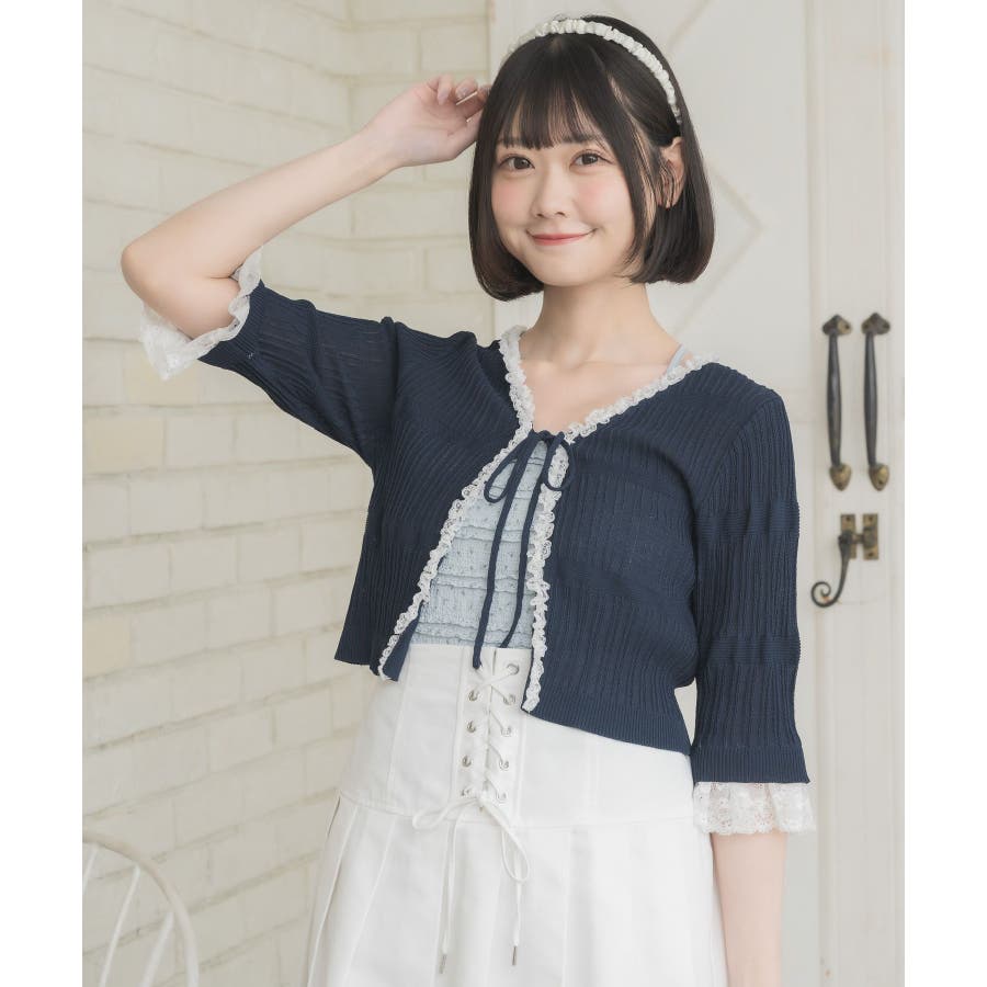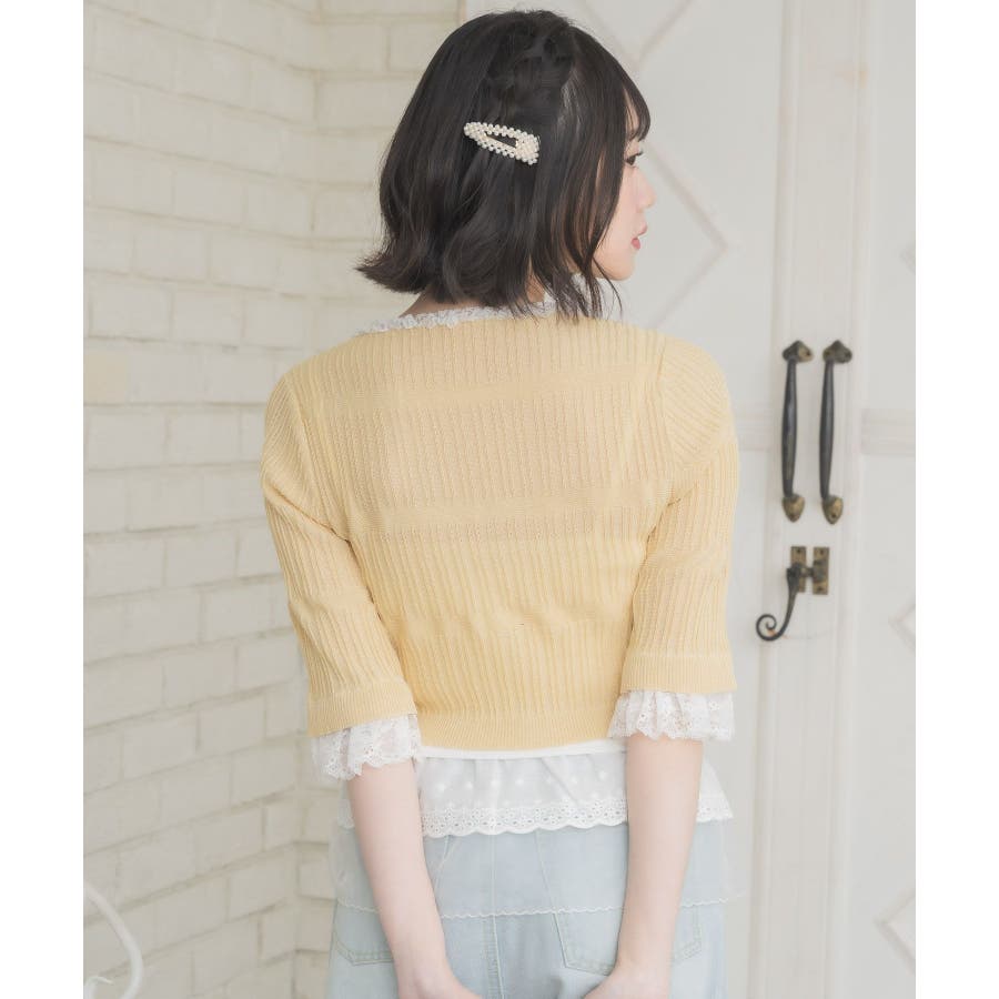 <冬に大人気を頂いたブローチセットのカーディガンがサマースタイルに♪>▼デザイン夏に嬉しい軽い素材のカーディガン。周りはレースで縁取りされていて、華やかな印象のアイテムです。袖口はふわっと広がるレースが動くたびに女性らしい印象に♪胸元のリボンとフックで着脱可能です◎▼コーディネート羽織っても、着用がおすすめのアイテム。夏も使いやすい透け感ある素材で、キャミワンピやカーディガンに1枚プラスしたい時におすすめです。------------------------------生地感:やや薄手伸縮性:ある透け感:ややある裏地:なし------------------------------▼ブランド紹介ems excite (エムズエキサイト)“more fun more cute”今をもっと楽しくもっと可愛くいたい女の子に向けたgirly cuteなブランド#スカシ編み #サマーニット #サマーニットカーデ #カーディガン #レース #五分袖 ▼注意事項※撮影環境やモニター環境によって実際の商品とお色味が 多少異なってみえる場合がございます。品番:EL518112B001 / 品名:レース付きフリルカーデ