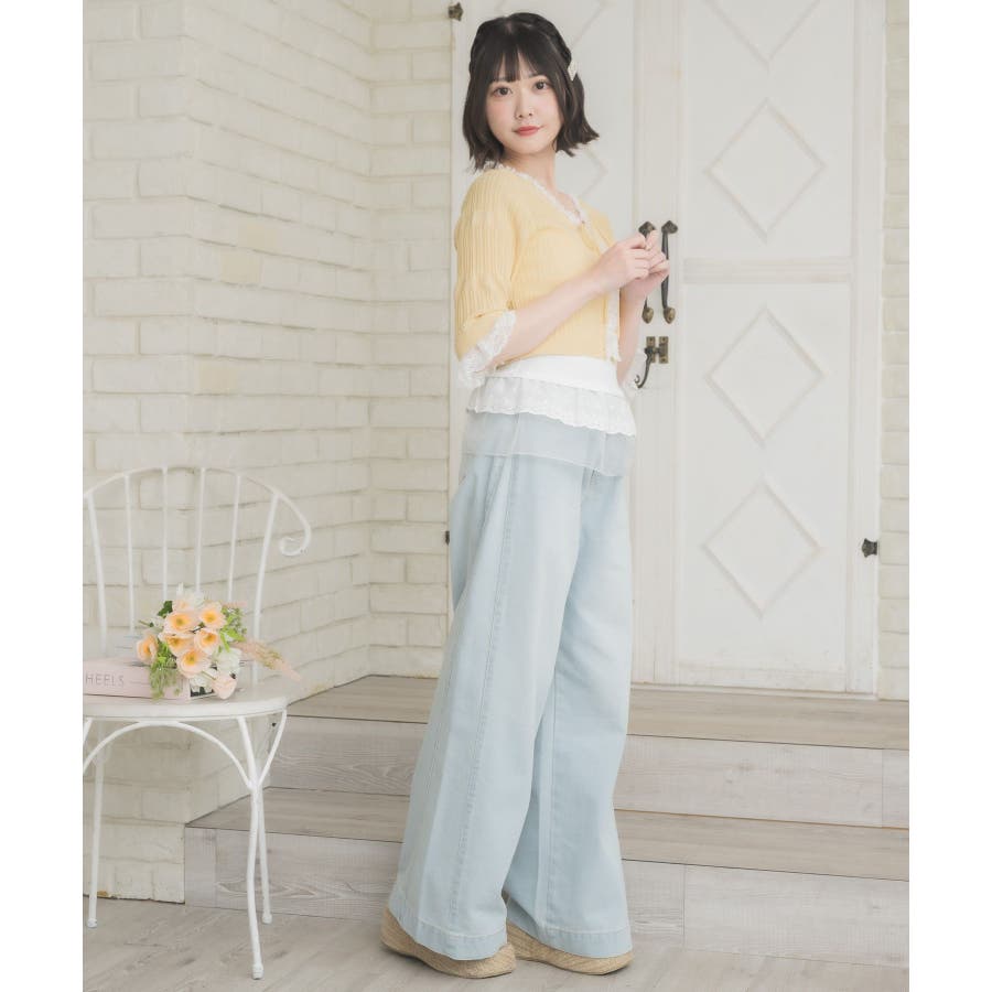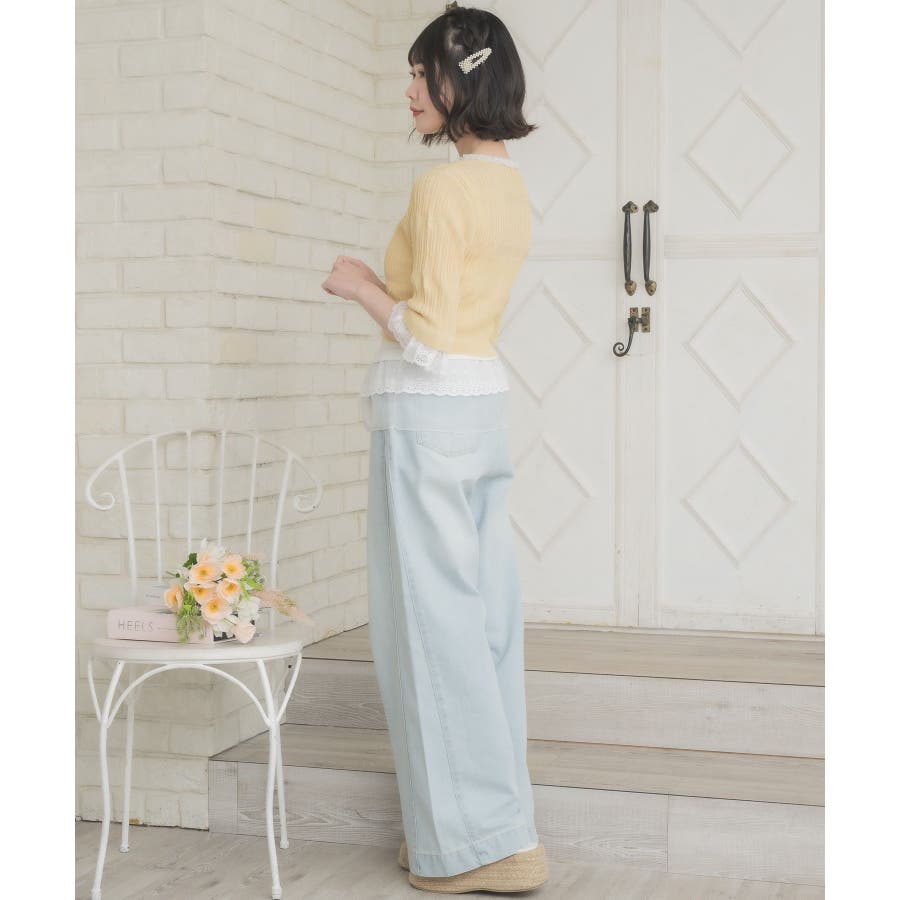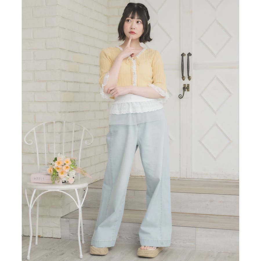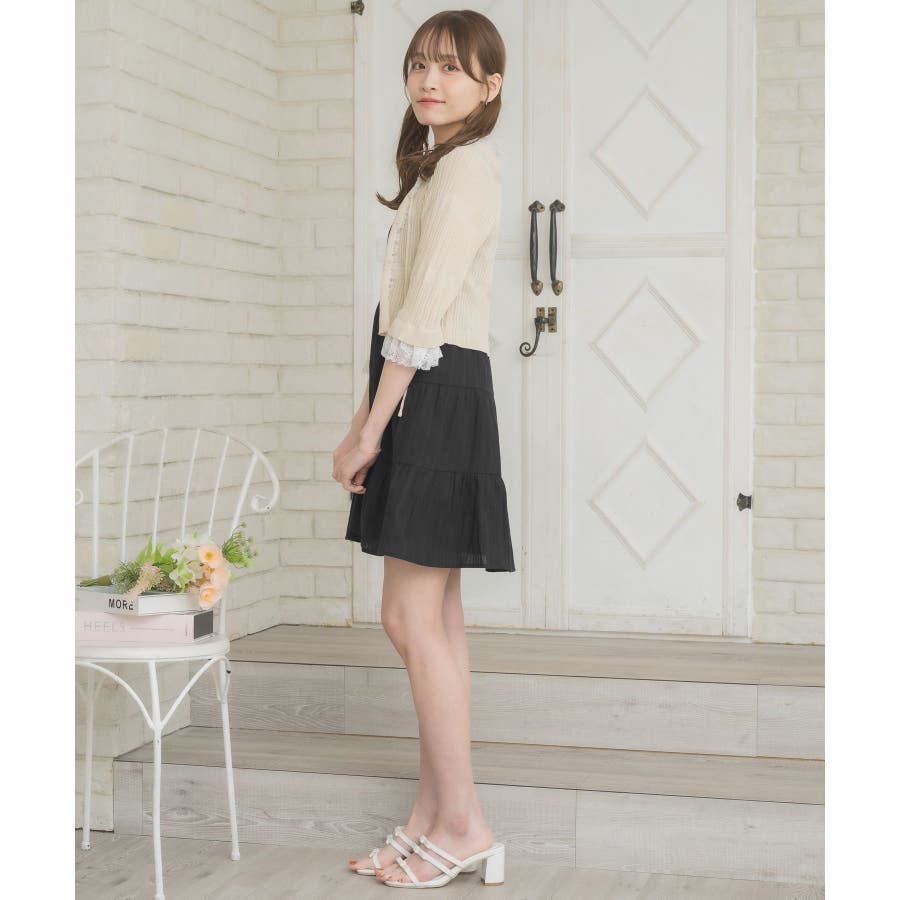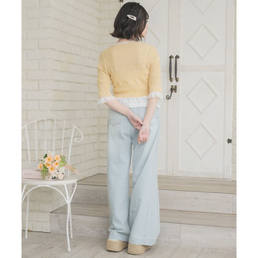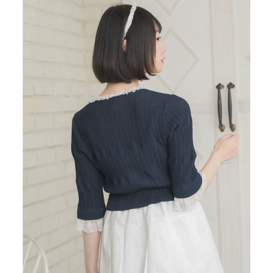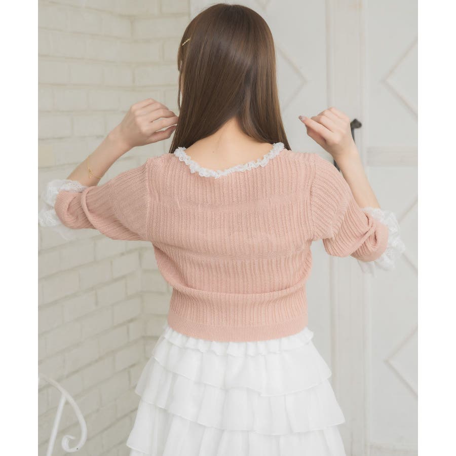 <冬に大人気を頂いたブローチセットのカーディガンがサマースタイルに♪>▼デザイン夏に嬉しい軽い素材のカーディガン。周りはレースで縁取りされていて、華やかな印象のアイテムです。袖口はふわっと広がるレースが動くたびに女性らしい印象に♪胸元のリボンとフックで着脱可能です◎▼コーディネート羽織っても、着用がおすすめのアイテム。夏も使いやすい透け感ある素材で、キャミワンピやカーディガンに1枚プラスしたい時におすすめです。------------------------------生地感:やや薄手伸縮性:ある透け感:ややある裏地:なし------------------------------▼ブランド紹介ems excite (エムズエキサイト)“more fun more cute”今をもっと楽しくもっと可愛くいたい女の子に向けたgirly cuteなブランド#スカシ編み #サマーニット #サマーニットカーデ #カーディガン #レース #五分袖 ▼注意事項※撮影環境やモニター環境によって実際の商品とお色味が 多少異なってみえる場合がございます。品番:EL518112B001 / 品名:レース付きフリルカーデ