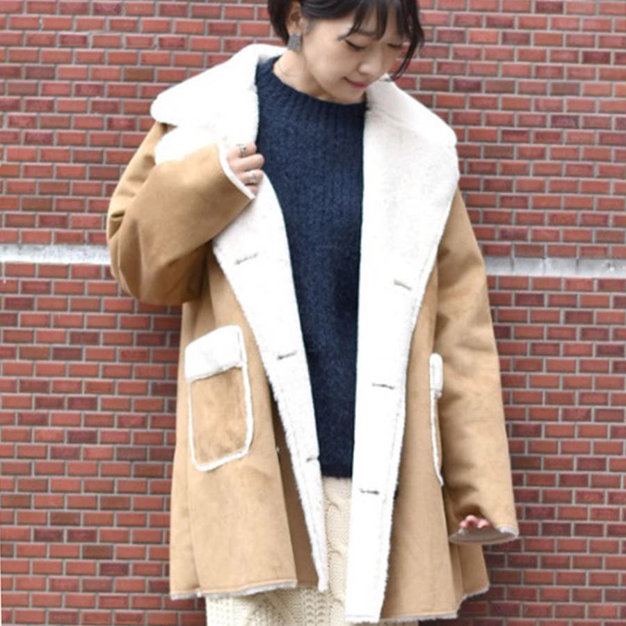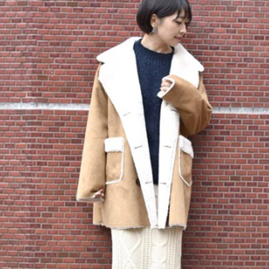 ダブル前立てのフェイクムートンコート。ゆったりサイズがモダンな1着は、フロントを開いてラフに羽織るのがおすすめです。襟や袖口、ポケットに裏ボアが覗くのもポイント。