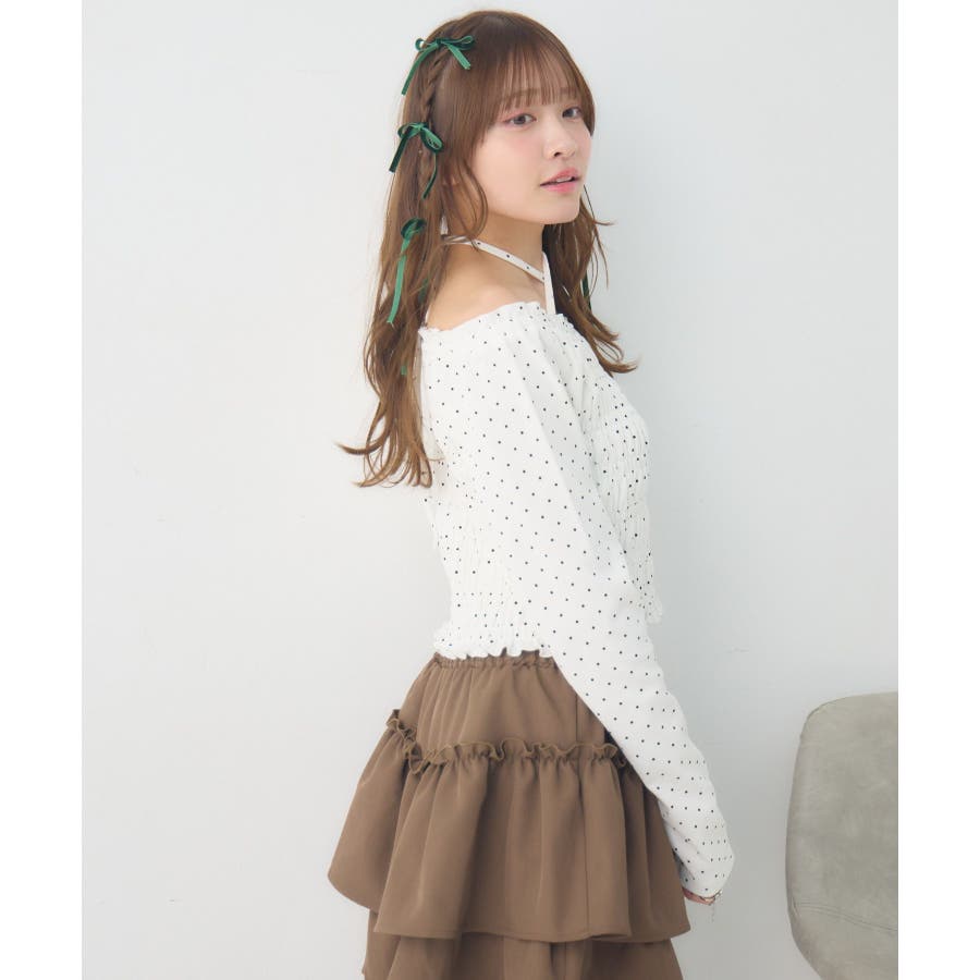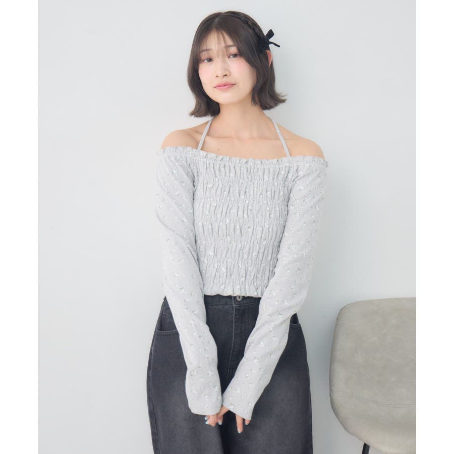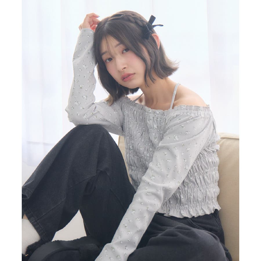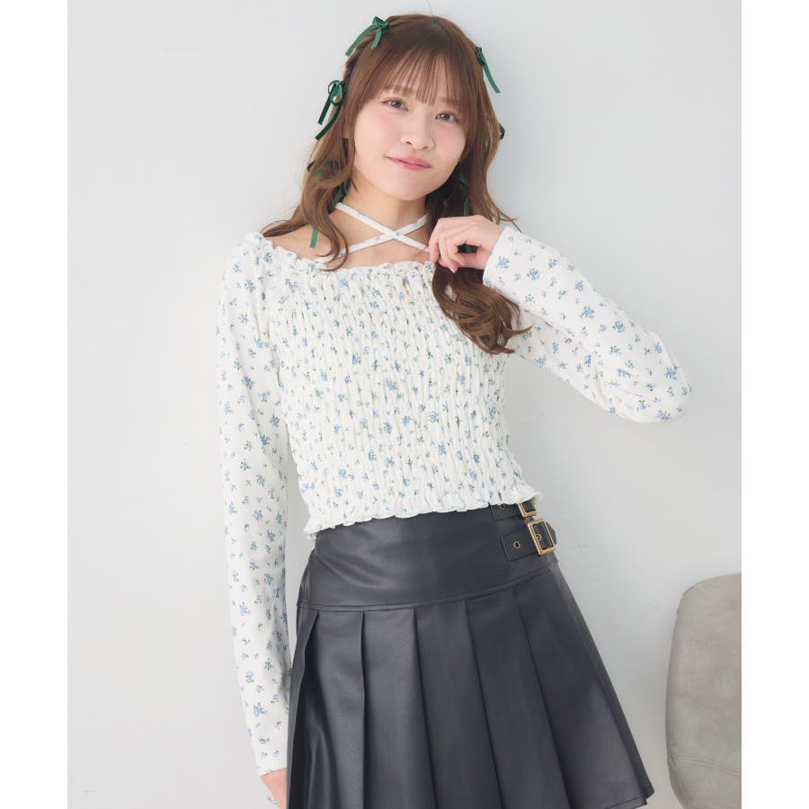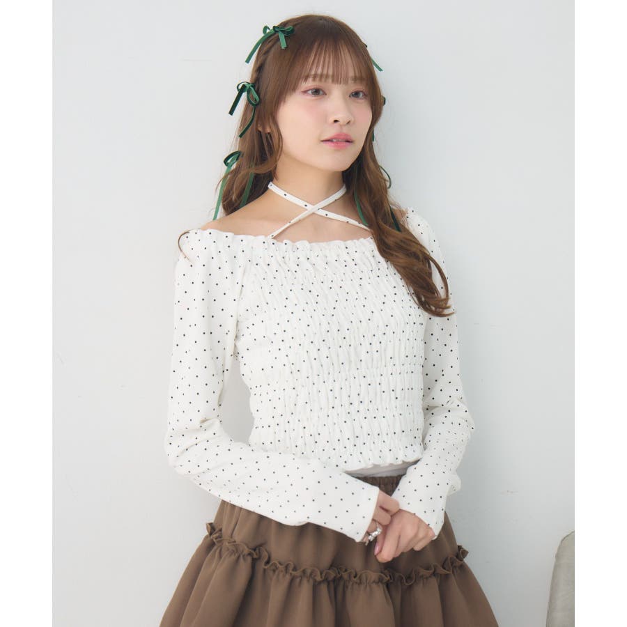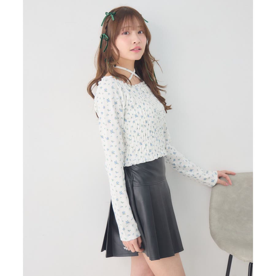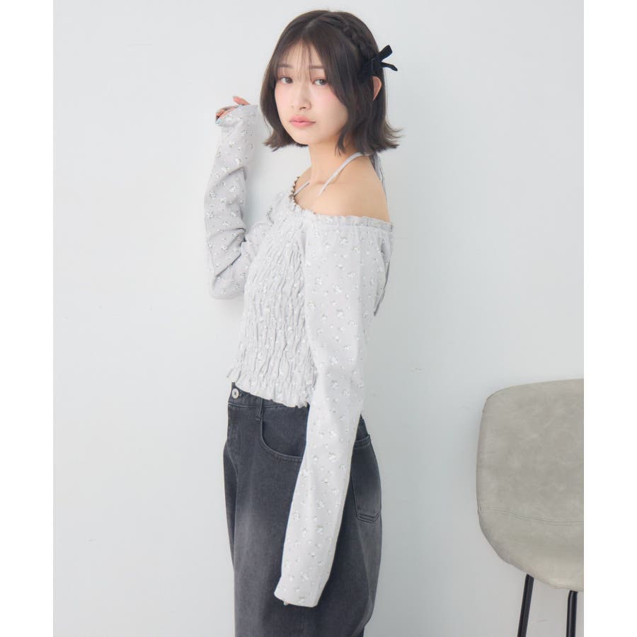 <シャーリングデザインが華やかなインナーカットソー>▼デザインオフショルダーでも着用できてアレンジの幅が広がるシャーリングカットソー!ホルターデザインになっているので、首回りも華やかで寂しさを感じさせません。伸縮性のある素材で着心地も抜群◎装飾が少なく、厚みを感じさせないデザインなので、骨格ストレートさんにもおすすめ!▼コーディネートカットソーではありますが、ブラウスっぽく着用できる万能アイテム!女性らしいデザインなので、ガーリーなボトムスと相性抜群!柄アイテムなので、コーデを華やかに可愛らしく仕上げてくれます。------------------------------生地感:薄手伸縮性:ある透け感:なし裏地:なし------------------------------ems excite (エムズエキサイト)“more fun more cute”今をもっと楽しくもっと可愛くいたい女の子に向けたgirly cuteなブランド#ブラウス #カットソー #シャーリング #ホルターネック #オフショルダー #花柄 #ドット柄▼注意事項※撮影環境やモニター環境によって実際の商品とお色味が多少異なってみえる場合がございます。品番:EP641511G001 / 品名:シャーリングインナーCT