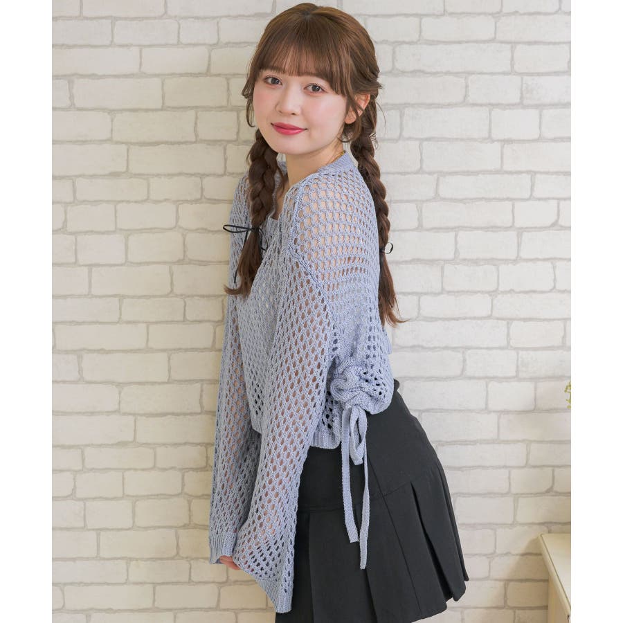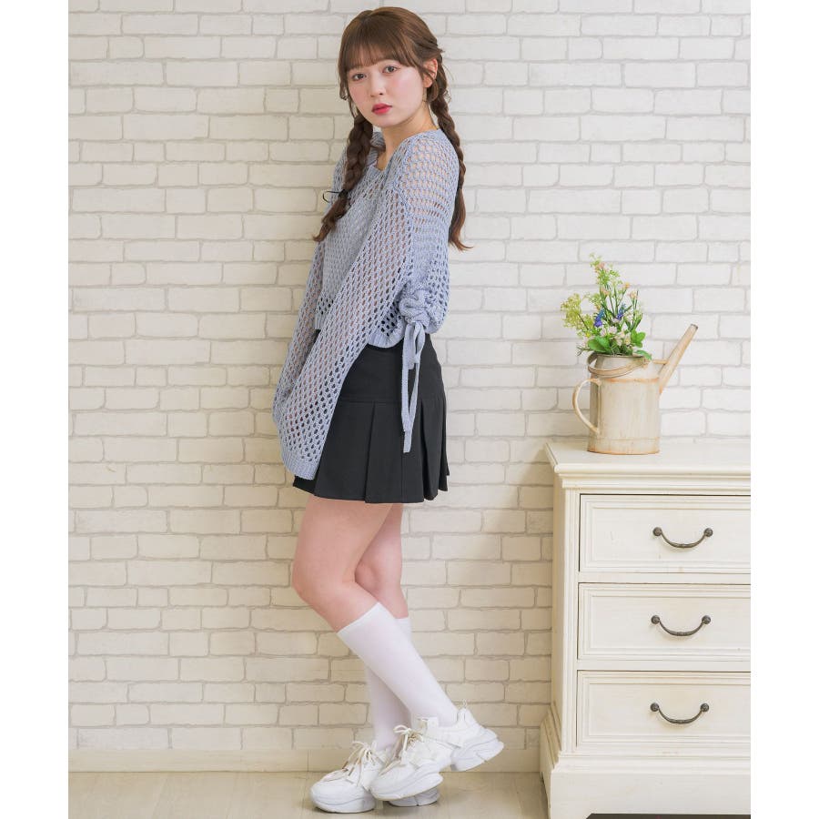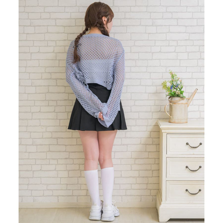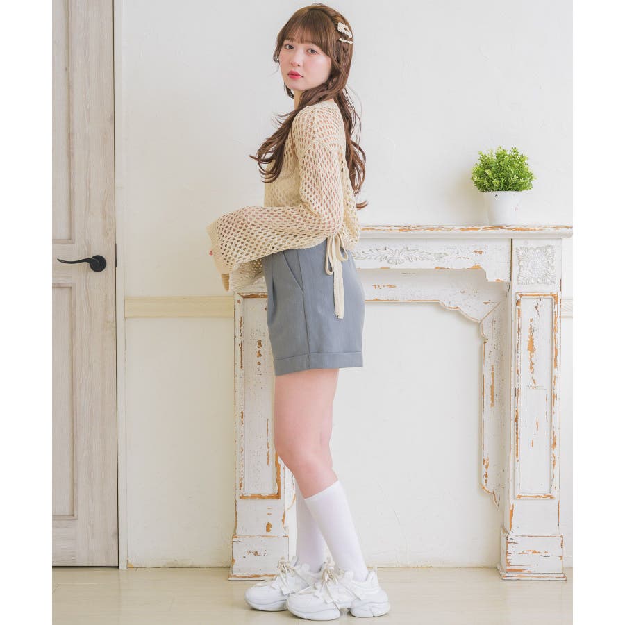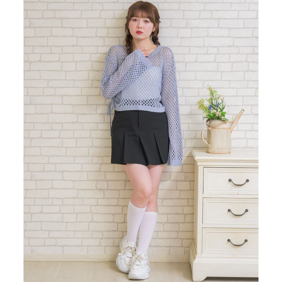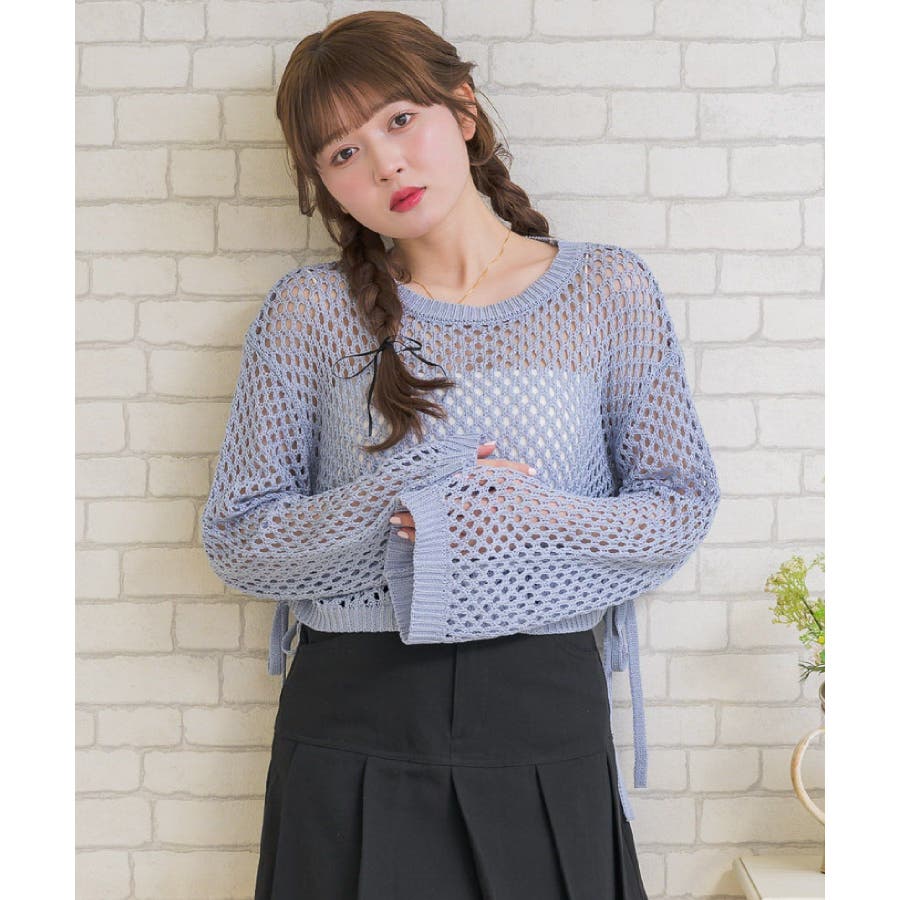 落ち着いたブルーです。丈は短いので、インナーは長めのタンクトップ似合わせようかと思います。スカートでもパンツでも合わせやすいんじゃないかな。サイドの紐リボンもアクセントでかわいいです