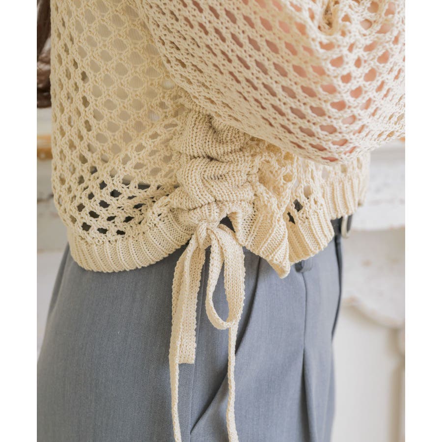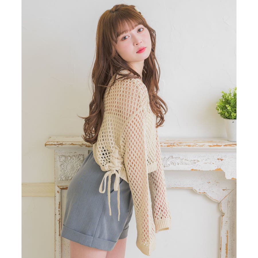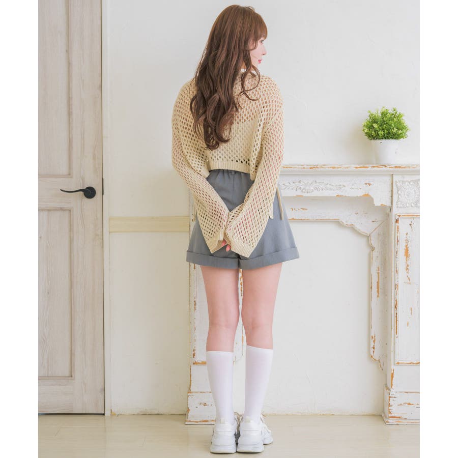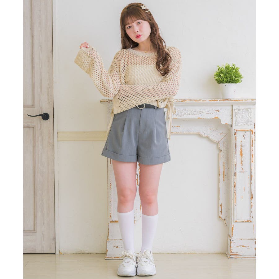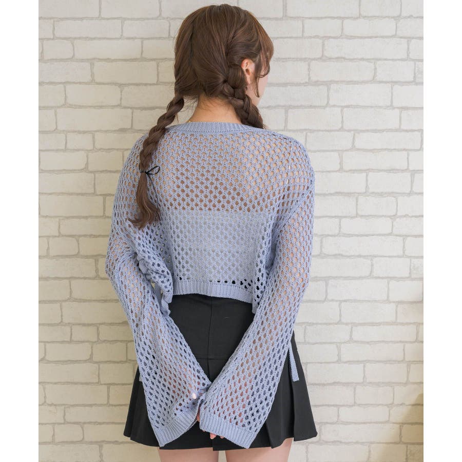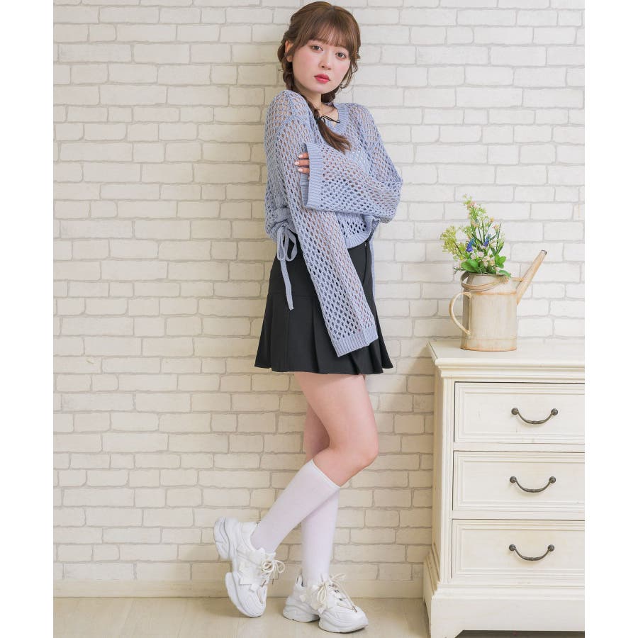 落ち着いたブルーです。丈は短いので、インナーは長めのタンクトップ似合わせようかと思います。スカートでもパンツでも合わせやすいんじゃないかな。サイドの紐リボンもアクセントでかわいいです
