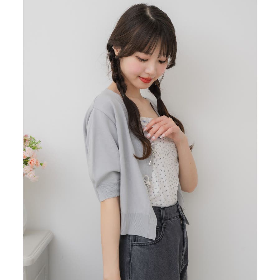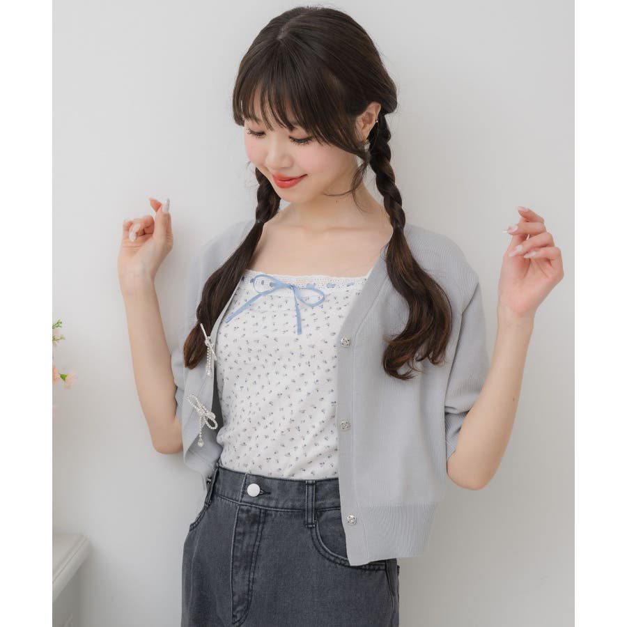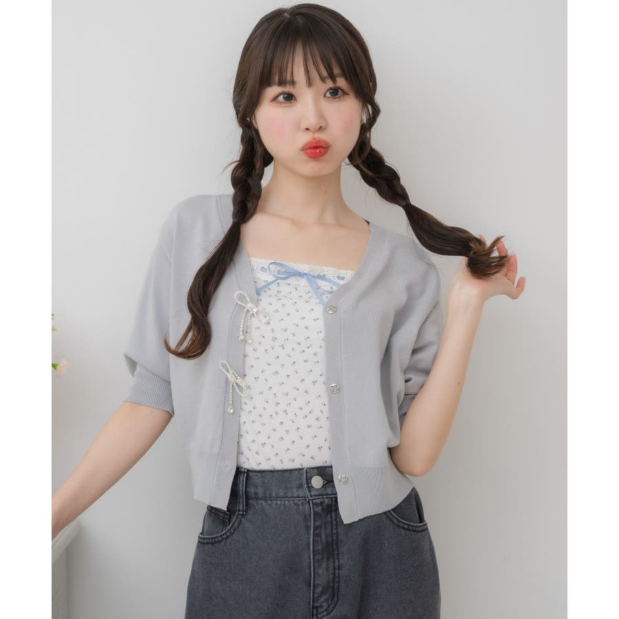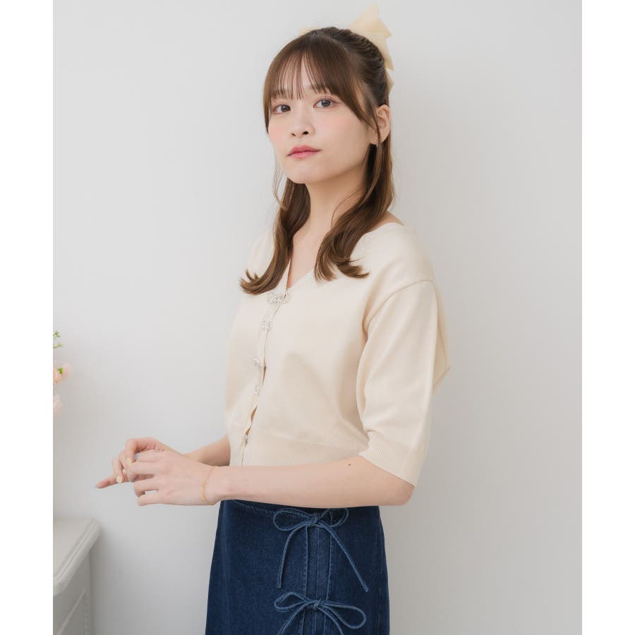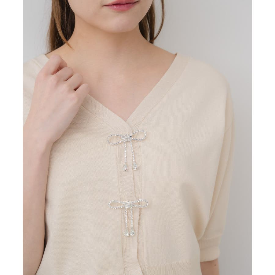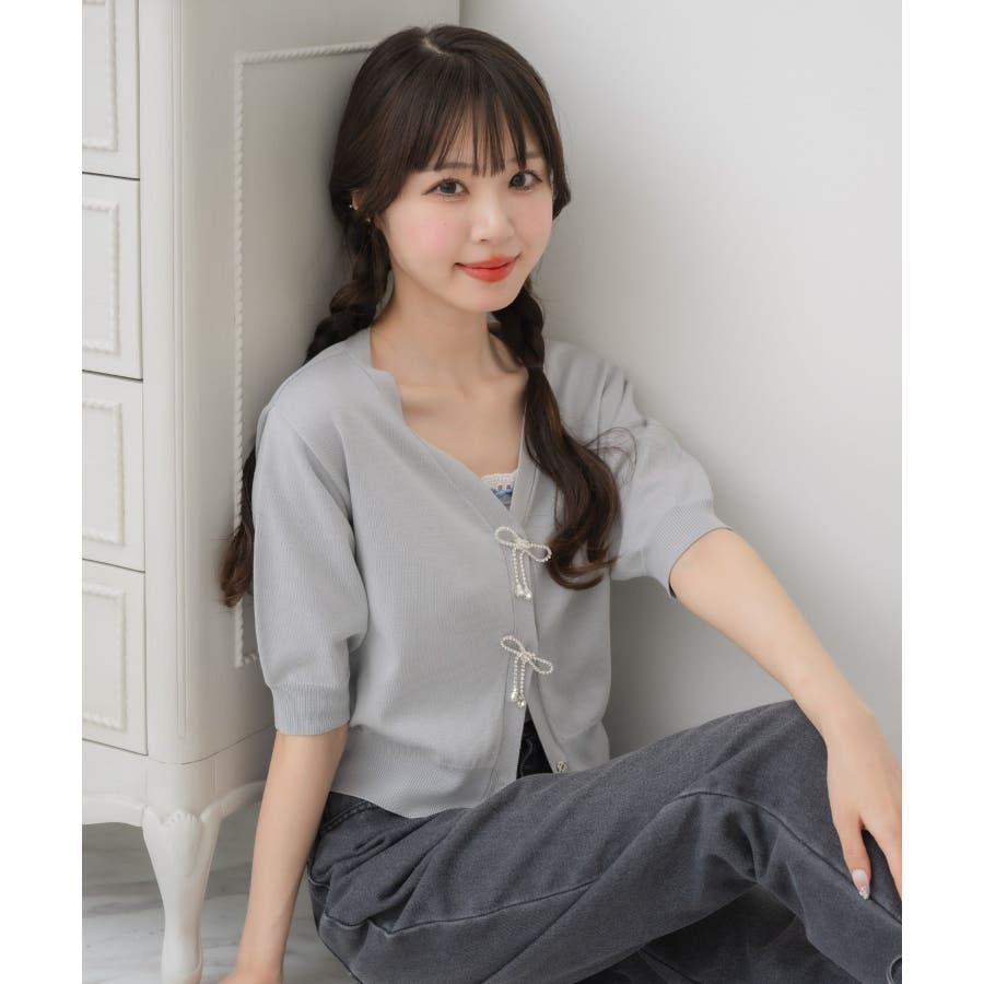 <冬に大人気を頂いたブローチセットのカーディガンがサマースタイルに♪>▼デザイン冬に大人気を頂いたリボンブローチがセットのカーディガン。夏らしい軽い糸の素材になって再登場です♪フロント部分に取り外し可能なリボンブローチが2つセットになっています。リボンブローチもビジューデザインで、キラキラと華やかな印象にコーデを演出。トップス使いはもちろん、キャミソールに羽織っても可愛い汎用性ある1枚です。▼コーディネート羽織っても、1枚でニット使いしても可愛いアイテム。ブローチは外して、バッグや帽子につけても可愛いです。------------------------------生地感:普通伸縮性:ある透け感:なし裏地:なし------------------------------▼ブランド紹介ems excite (エムズエキサイト)“more fun more cute”今をもっと楽しくもっと可愛くいたい女の子に向けたgirly cuteなブランド#ラメブローチ #サマーニット #サマーニットカーデ #カーディガン #ブローチ付 #デートコーデ▼注意事項※撮影環境やモニター環境によって実際の商品とお色味が 多少異なってみえる場合がございます。品番:ES541512G003 / 品名:リボンブローチショートカーデ