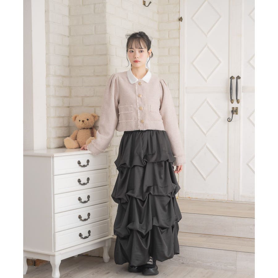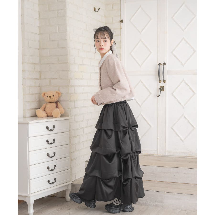 <タックデザインが目を惹く段々ボリュームスカート>▼デザイン光沢感のある素材で高見えするロング丈ワンピース。摘ままれたようなタックデザインが施されていて、存在感ばっちりのぼこぼこシルエット。カラー展開も秋らしく、フェミニンコーデにおおすすめの1枚。ウエストはゴムで、伸縮性もあり、着心地ばっちり◎▼コーディネートボトムにデザインがあるので、トップスはシンプルにニットやカーディガン合わせでも◎ブラウスとは相性抜群で、大人ガーリーコーデが楽しめます。------------------------------生地感:普通伸縮性:なし透け感:なし裏地:ある------------------------------▼ブランド紹介ems excite (エムズエキサイト)“more fun more cute”今をもっと楽しくもっと可愛くいたい女の子に向けたgirly cuteなブランド#ロングスカート #フレアスカート #ガーリーアイテム #サテンスカート #タックスカート #ロングスカート▼注意事項※撮影環境やモニター環境によって実際の商品とお色味が多少異なってみえる場合がございます。品番:EW537531G003 / 品名:ボリュームタックSK