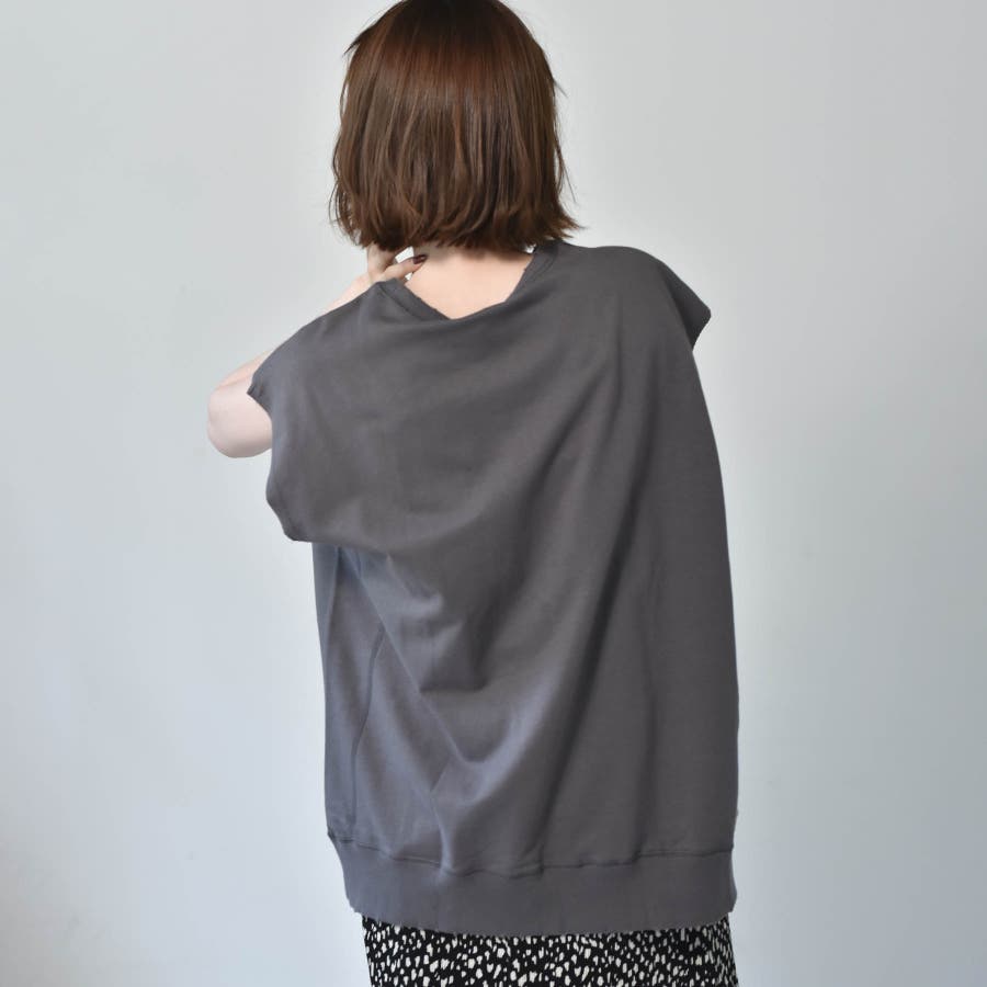 ゆったりシルエットの少し二の腕にかかるノースリデザインに仕上げたトップス