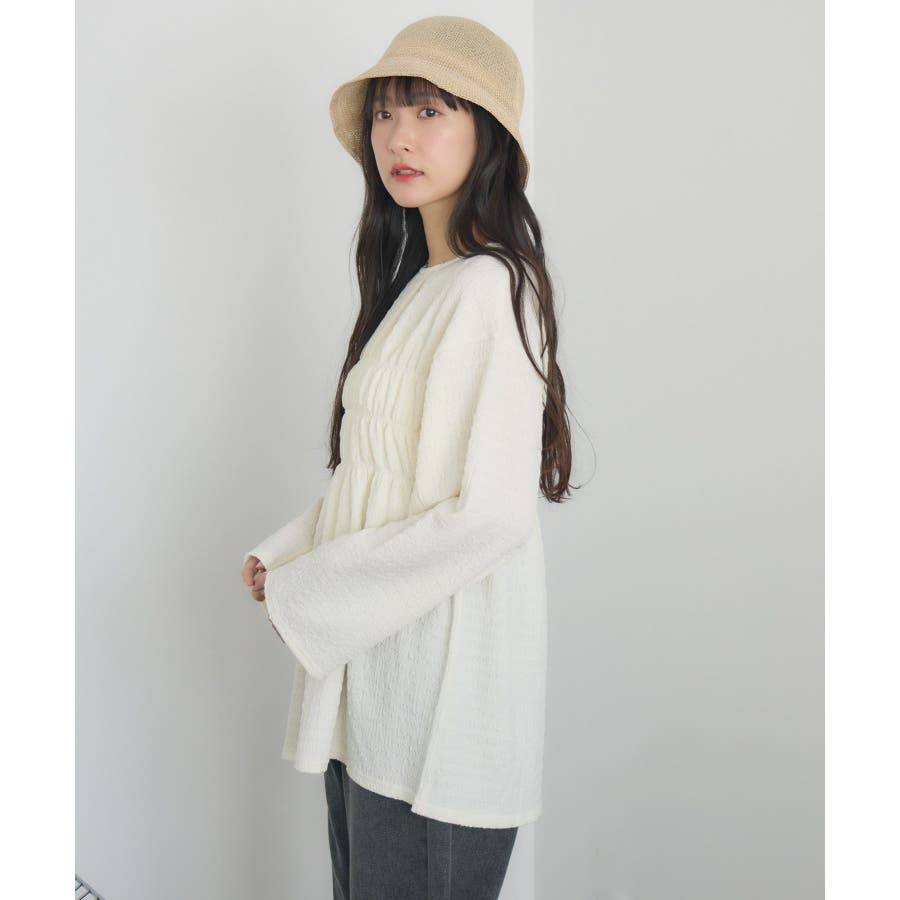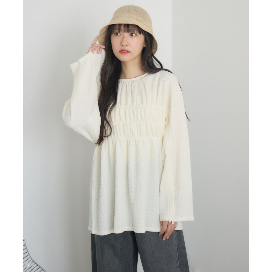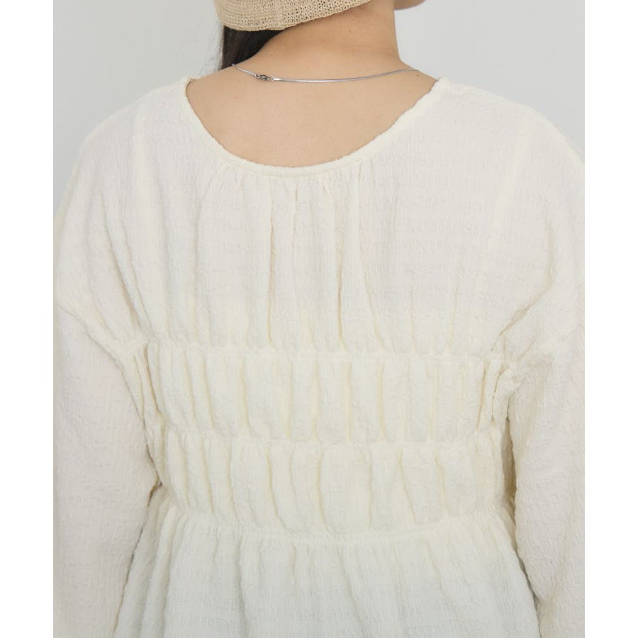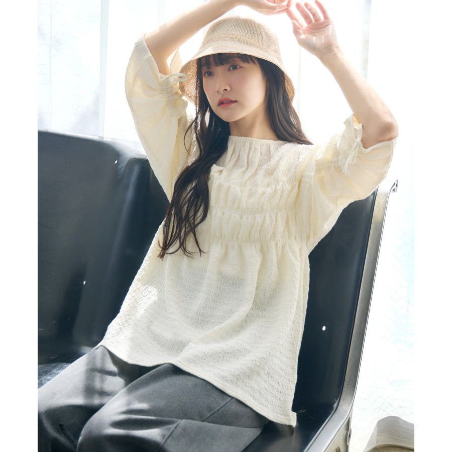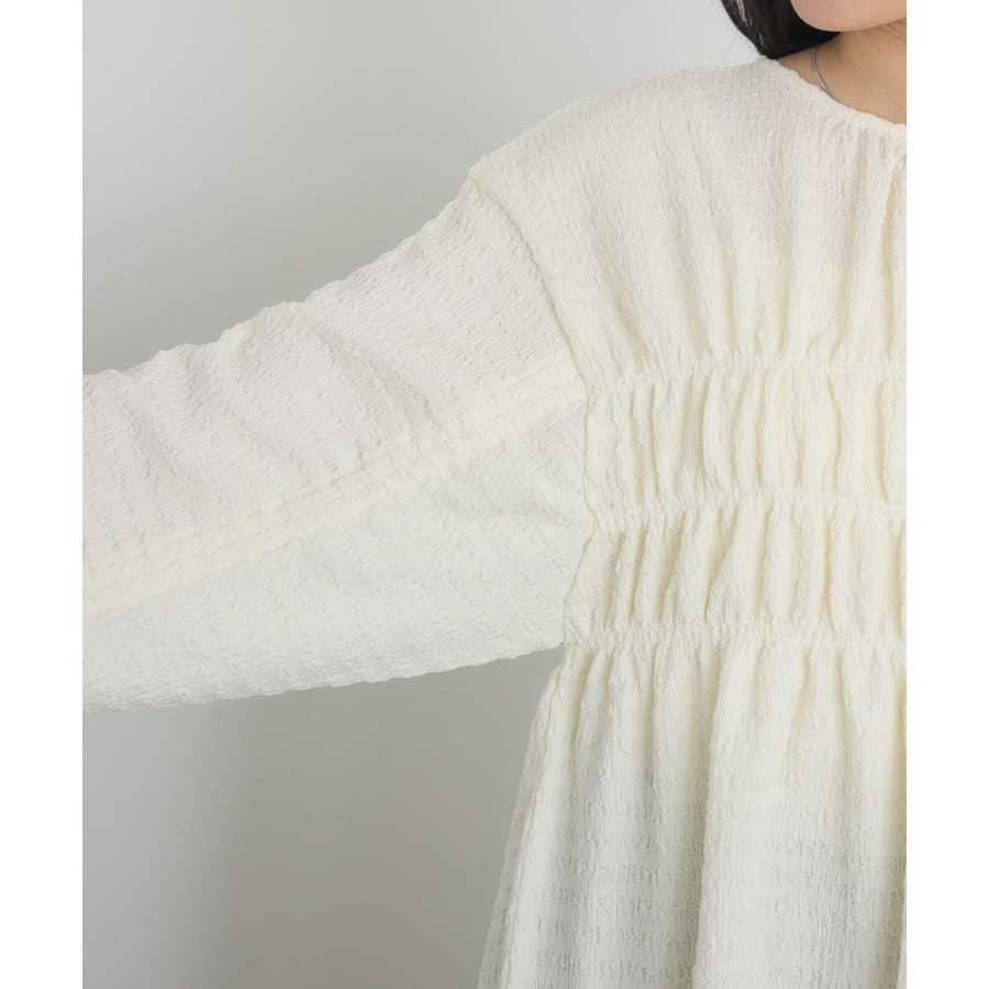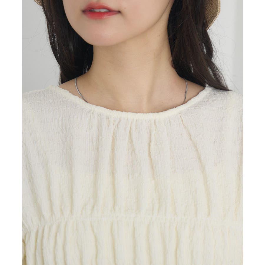 <ポコポコした素材とギャザーデザインが可愛いカットソーアイテム>▼デザインポコポコと表面感のある素材感が癖になるティアード丈のカットソー。バスト部分はギャザーデザインが入っているのは、デザインにこだわったポイント!袖口にはリボンデザインが施されていて、女性らしさも忘れない1枚。春先にぴったりの厚さで、気温調節もしやすそう!▼コーディネートボトムはパンツをレイヤードして、チュニックとして着用♪タイトなロングスカートに合わせてトレンド感あるフェミニンコーデに仕上げるのもおすすめです。------------------------------生地感:普通伸縮性:ある透け感:なし(ホワイトのみ多少あり)裏地:なし------------------------------▼ブランド紹介RETRO GIRL (レトロガール)自分らしい“ベーシックアイテム”と新しい自分の”トレンドアイテム”が見つかる場所今らしいファッションを楽しむ女性のためのブランド#ポコポコ #ブラウス #ぽこぽこ素材 #カットソー #ブラウスコーデ #チュニック#チュニックカットソー▼注意事項※撮影環境やモニター環境によって実際の商品とお色味が 多少異なってみえる場合がございます。品番:RM518111T001 / 品名 :ポコポコシャーリングCT