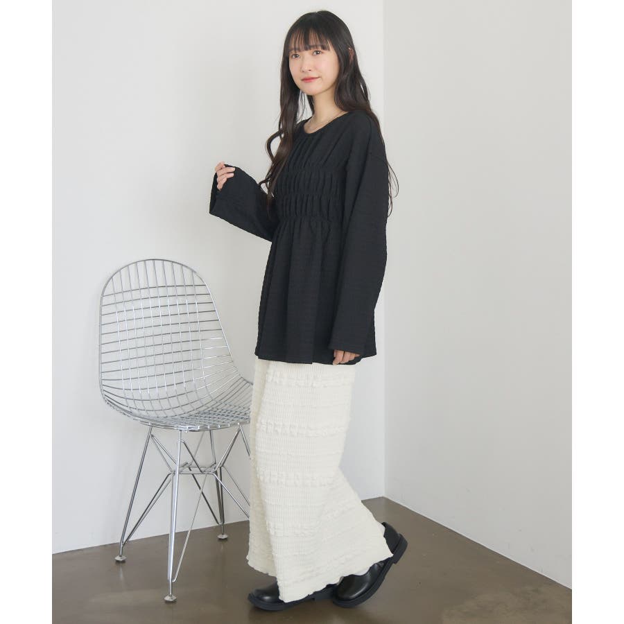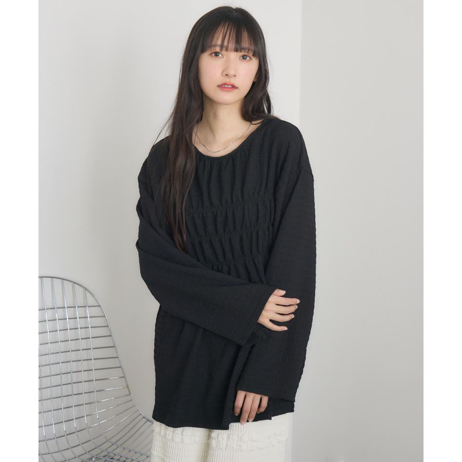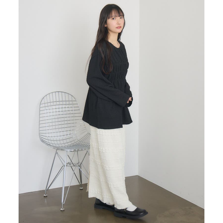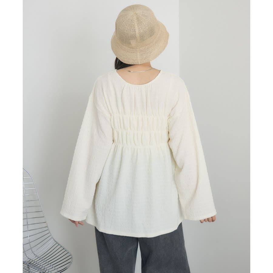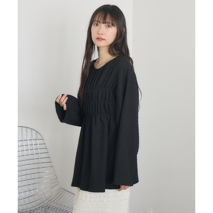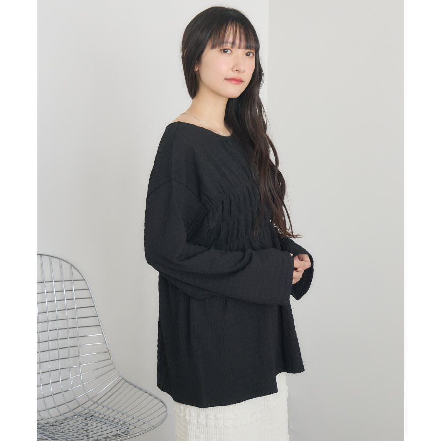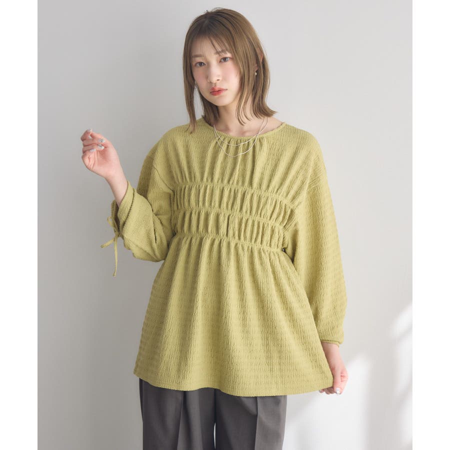 <ポコポコした素材とギャザーデザインが可愛いカットソーアイテム>▼デザインポコポコと表面感のある素材感が癖になるティアード丈のカットソー。バスト部分はギャザーデザインが入っているのは、デザインにこだわったポイント!袖口にはリボンデザインが施されていて、女性らしさも忘れない1枚。春先にぴったりの厚さで、気温調節もしやすそう!▼コーディネートボトムはパンツをレイヤードして、チュニックとして着用♪タイトなロングスカートに合わせてトレンド感あるフェミニンコーデに仕上げるのもおすすめです。------------------------------生地感:普通伸縮性:ある透け感:なし(ホワイトのみ多少あり)裏地:なし------------------------------▼ブランド紹介RETRO GIRL (レトロガール)自分らしい“ベーシックアイテム”と新しい自分の”トレンドアイテム”が見つかる場所今らしいファッションを楽しむ女性のためのブランド#ポコポコ #ブラウス #ぽこぽこ素材 #カットソー #ブラウスコーデ #チュニック#チュニックカットソー▼注意事項※撮影環境やモニター環境によって実際の商品とお色味が 多少異なってみえる場合がございます。品番:RM518111T001 / 品名 :ポコポコシャーリングCT