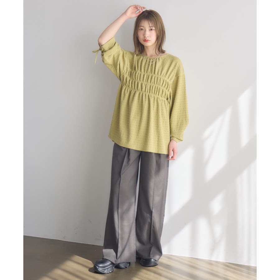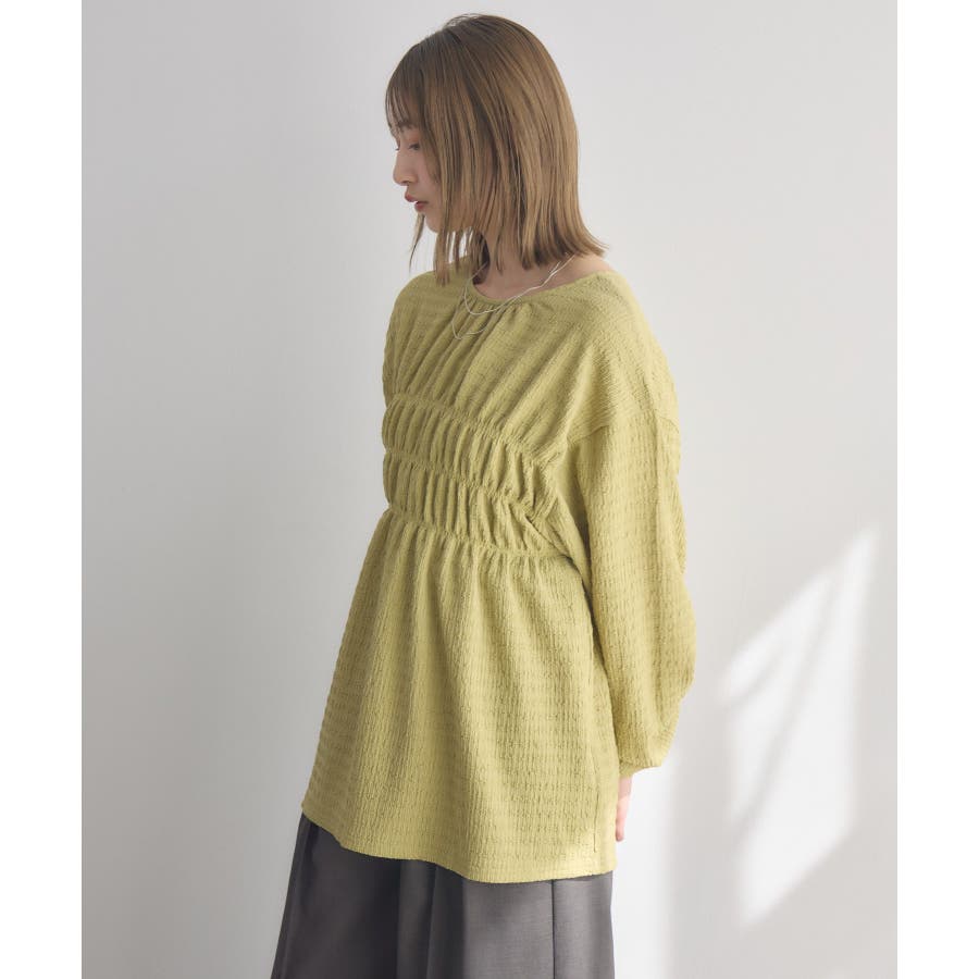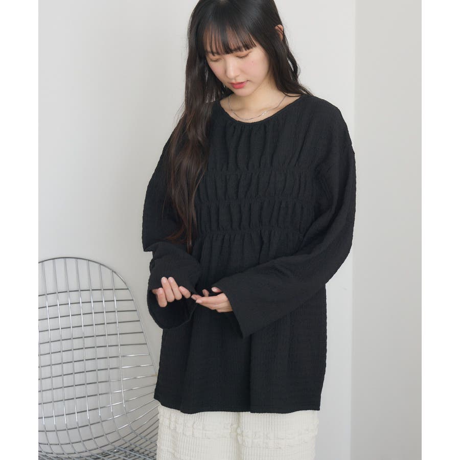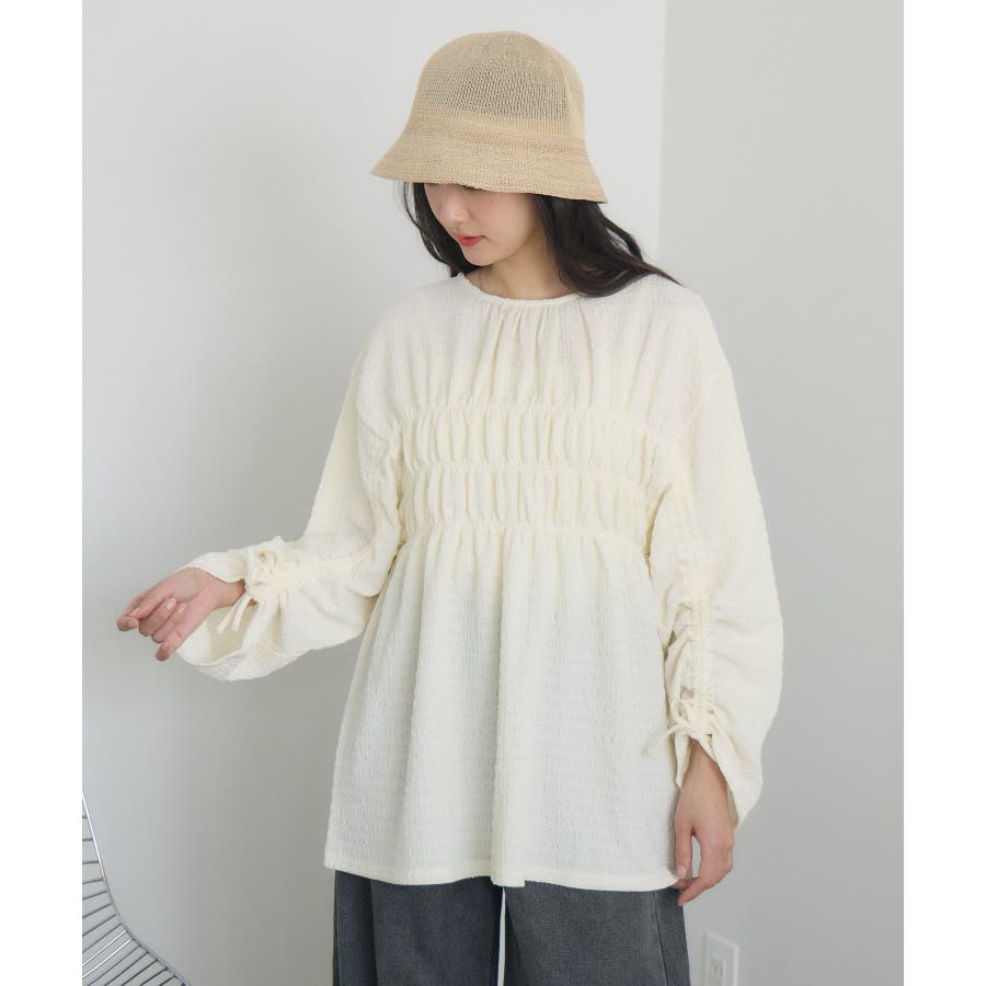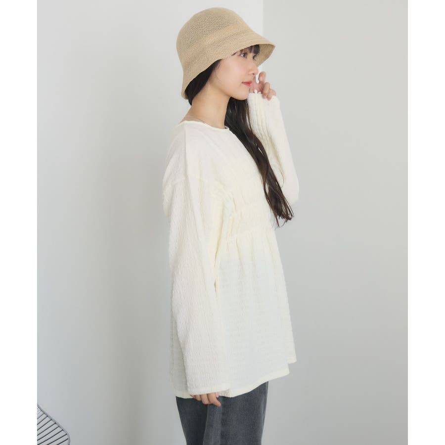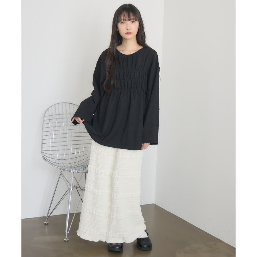 <ポコポコした素材とギャザーデザインが可愛いカットソーアイテム>▼デザインポコポコと表面感のある素材感が癖になるティアード丈のカットソー。バスト部分はギャザーデザインが入っているのは、デザインにこだわったポイント!袖口にはリボンデザインが施されていて、女性らしさも忘れない1枚。春先にぴったりの厚さで、気温調節もしやすそう!▼コーディネートボトムはパンツをレイヤードして、チュニックとして着用♪タイトなロングスカートに合わせてトレンド感あるフェミニンコーデに仕上げるのもおすすめです。------------------------------生地感:普通伸縮性:ある透け感:なし(ホワイトのみ多少あり)裏地:なし------------------------------▼ブランド紹介RETRO GIRL (レトロガール)自分らしい“ベーシックアイテム”と新しい自分の”トレンドアイテム”が見つかる場所今らしいファッションを楽しむ女性のためのブランド#ポコポコ #ブラウス #ぽこぽこ素材 #カットソー #ブラウスコーデ #チュニック#チュニックカットソー▼注意事項※撮影環境やモニター環境によって実際の商品とお色味が 多少異なってみえる場合がございます。品番:RM518111T001 / 品名 :ポコポコシャーリングCT