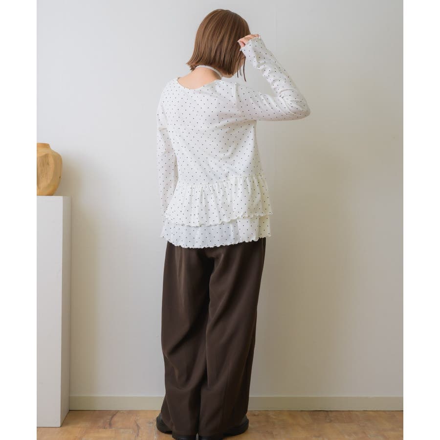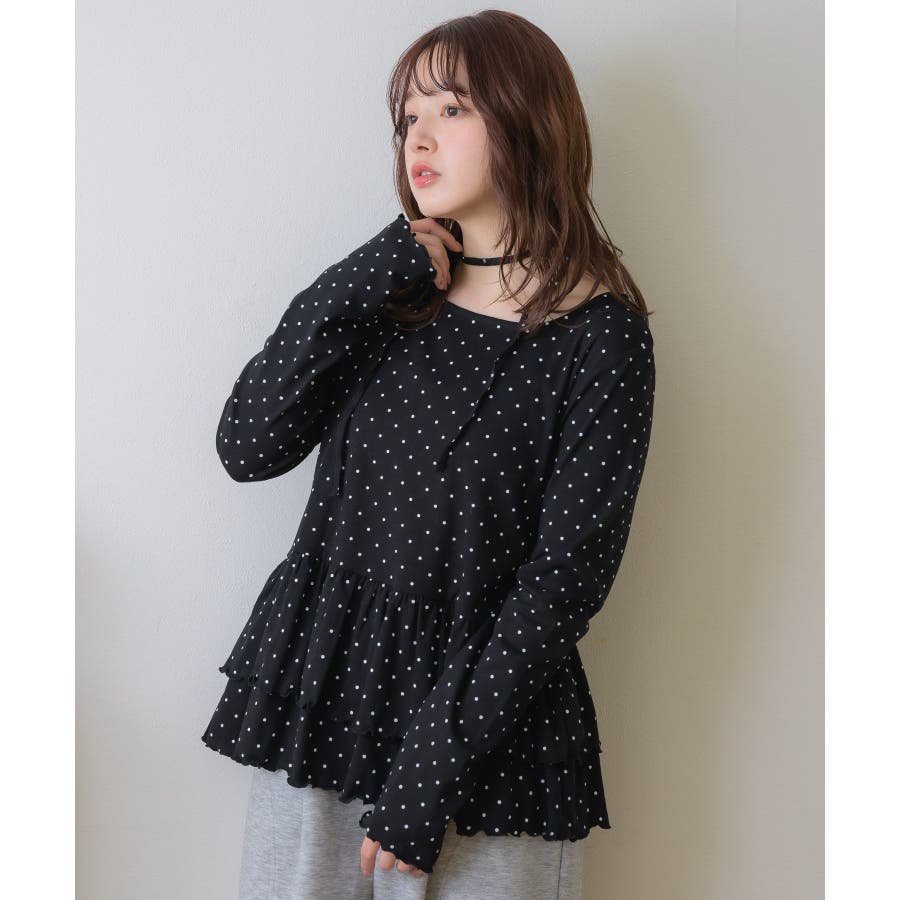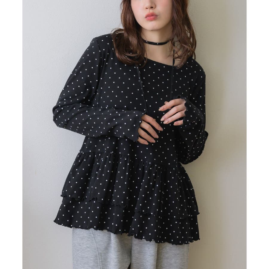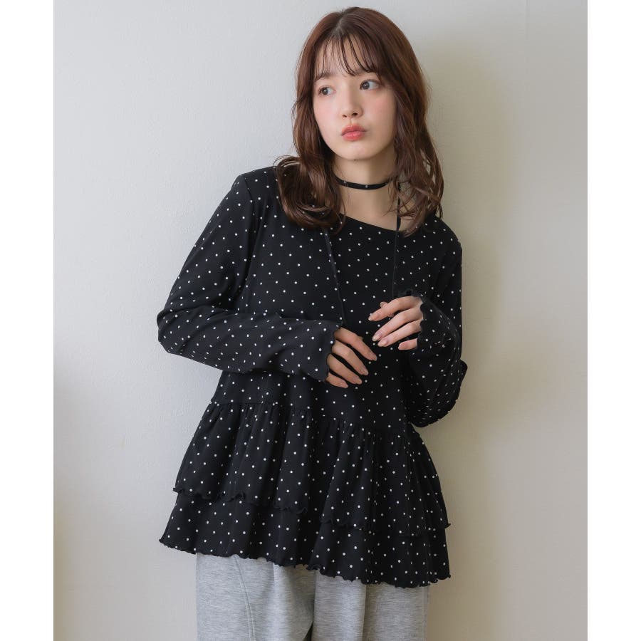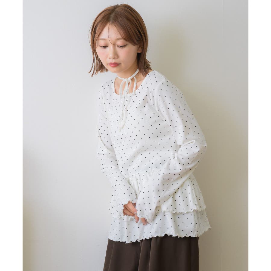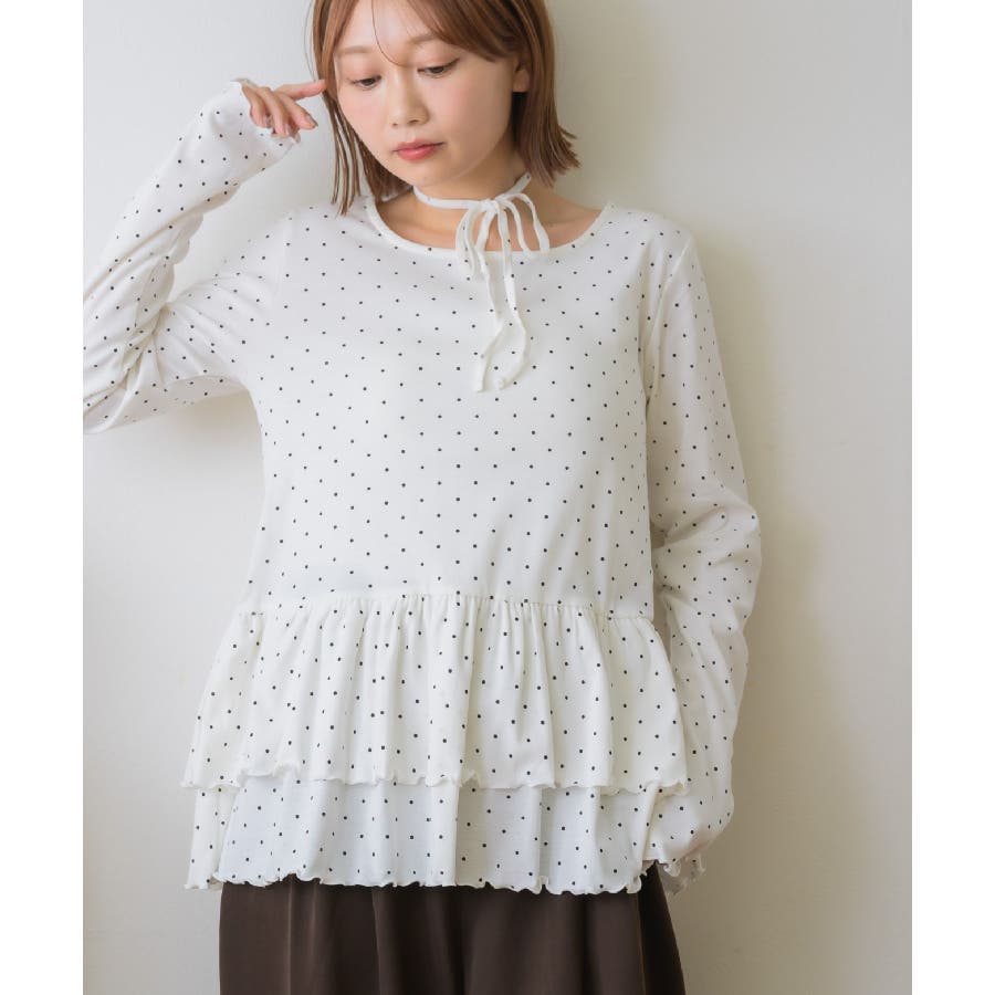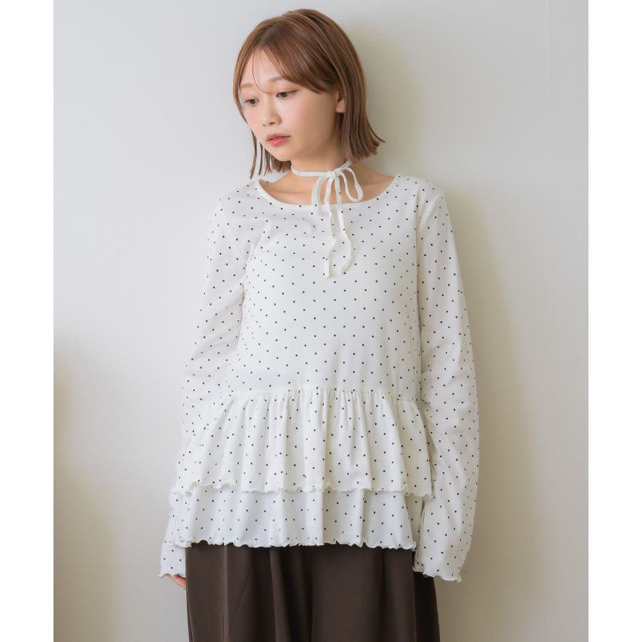 <インナー使いでコーデに甘さをプラスするドット柄カットソー>▼デザイン裾のデザインが可愛い甘めカットソー。全面ドット柄で女性らしい曲線がたっぷりなデザイン。インナー使いはもちろん、メイン使いもおすすめです。同柄のチョーカーもセットで首回りも華やかになります。▼コーディネートトップスとしてはもちろん、ニットやカーディガンの下に着てレイヤードスタイルも楽しんで頂けます。裾のティアード部分に切り替えが入っているので、ベルトマークしてもおしゃれになります。------------------------------生地感:普通伸縮性:あり透け感:なし裏地:なし------------------------------▼ブランド紹介RETRO GIRL (レトロガール)自分らしい“ベーシックアイテム”と新しい自分の”トレンドアイテム”が見つかる場所今らしいファッションを楽しむ女性のためのブランド#フリル #インナー #ドット柄インナー #レイヤードアイテム #ドット柄 #ティアード▼注意事項※撮影環境やモニター環境によって実際の商品とお色味が 多少異なってみえる場合がございます。品番:RU556411T001 / 品名:裾フリルカットソー