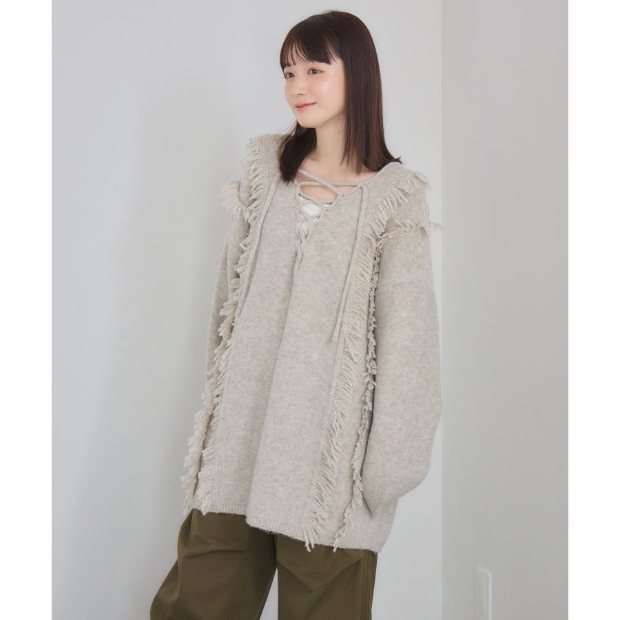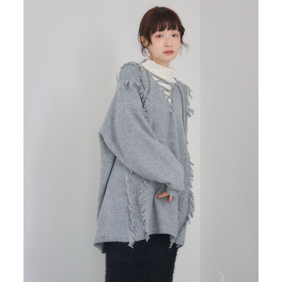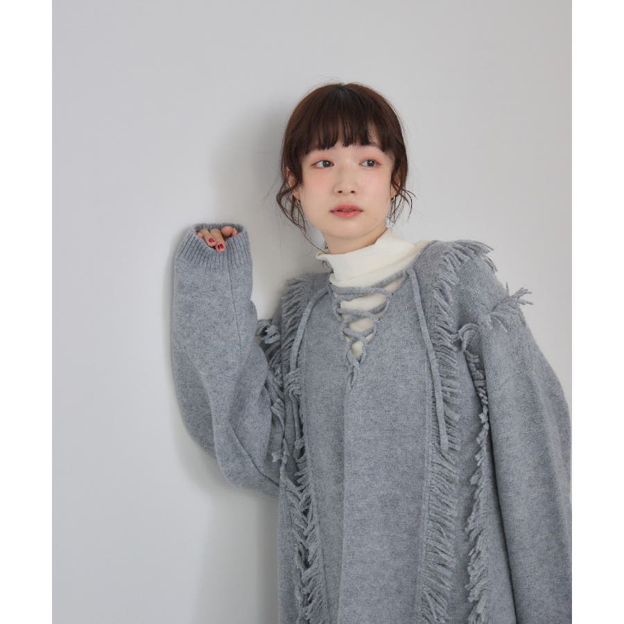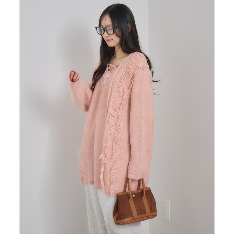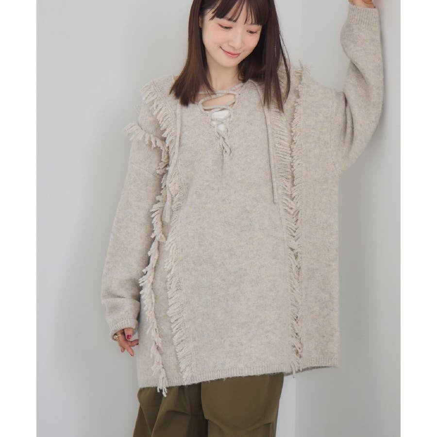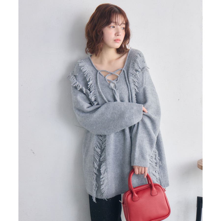 <胸元のデザインが可愛いチュニックニット>▼デザイン胸元が大きくVネックに空いたデザインのニット!レースアップが施されていて、カジュアルでオシャレなデザインに。フロント部分にはフリンジデザインが施されていて、暖かい印象です。チュニック丈で、お尻周りもカバーしてくれるのが嬉しいポイントです♪▼コーディネートVネックなので、鎖骨周りを綺麗に魅せてくれます、ネックレスを合わせると、映えるデザインです。チュニックで着丈が長いので、ショートパンツ合わせで、ニットワンピのように着ていただくのもおすすめ!------------------------------生地感:普通伸縮性:あり透け感:あり裏地:なし-----------------------------#ニット #ニットコーデ #レースアップデザイン #チュニック #チュニックニット▼注意事項※撮影環境やモニター環境によって実際の商品とお色味が 多少異なってみえる場合がございます。品番:RU557112T001 / 品名:レースアップチュニックNT