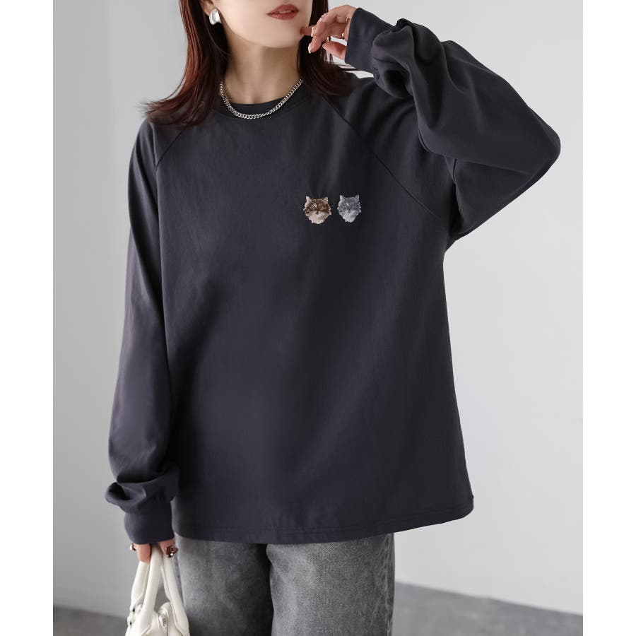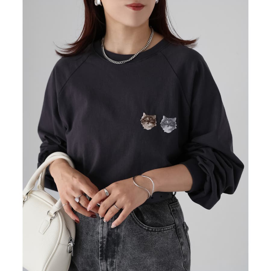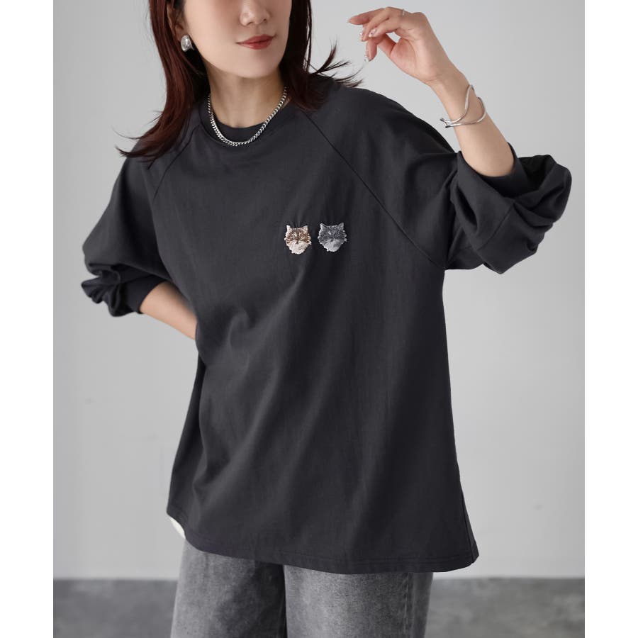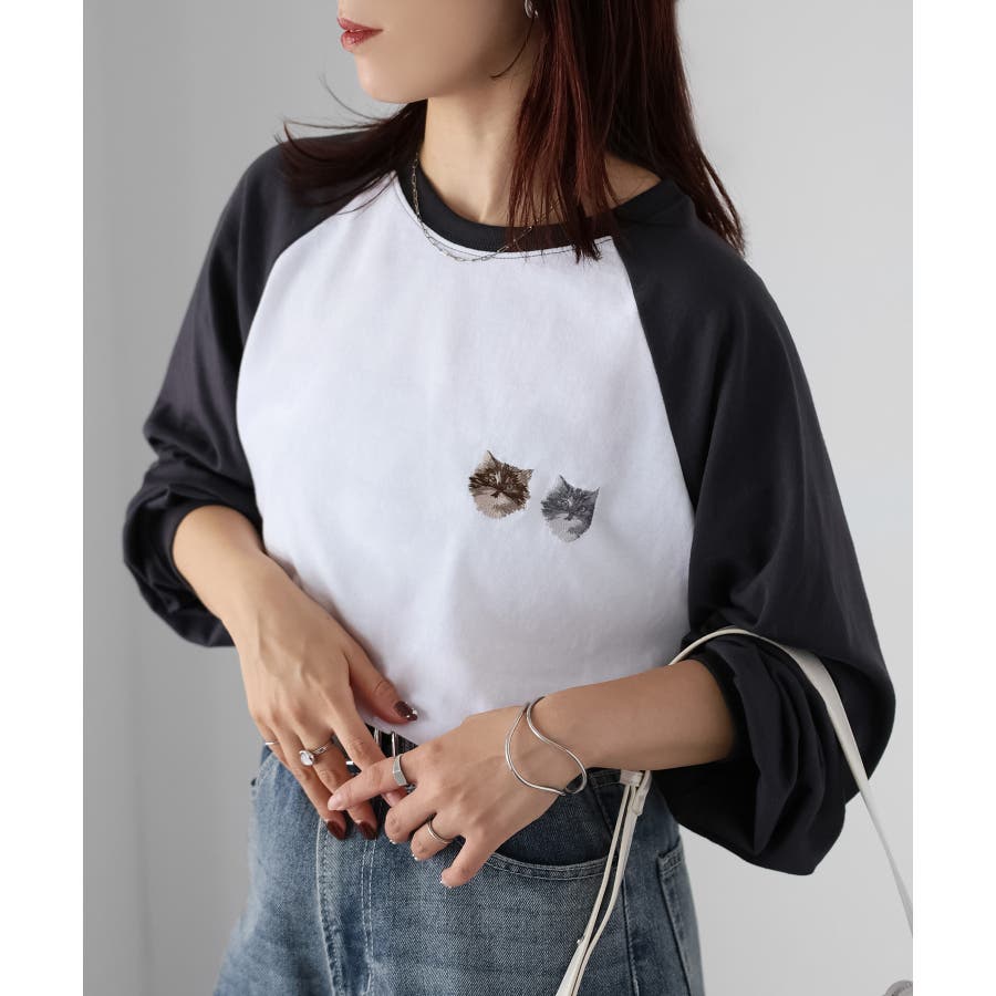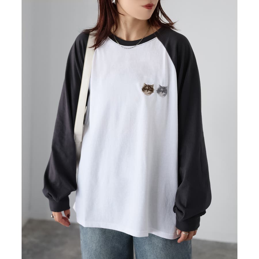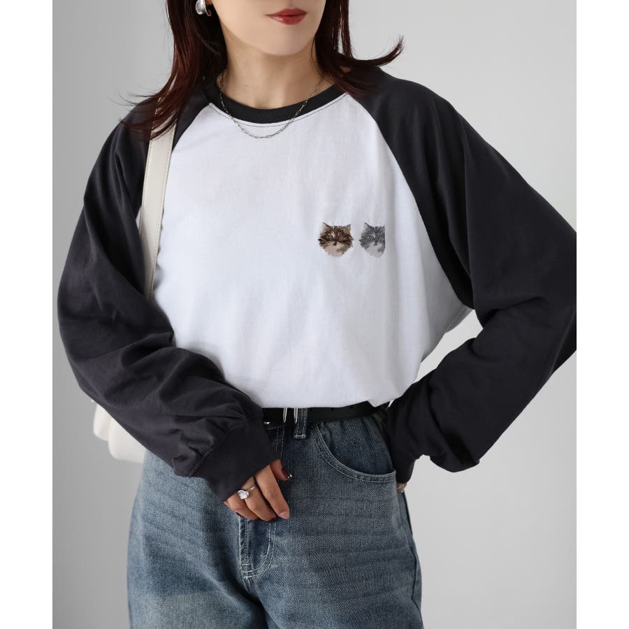 ネコ刺繍ラグランロンT