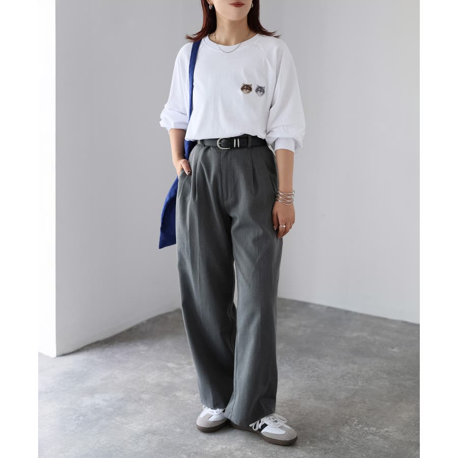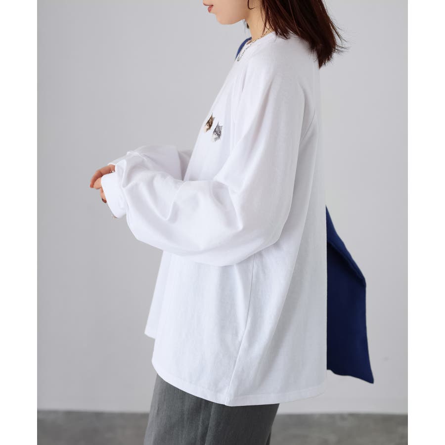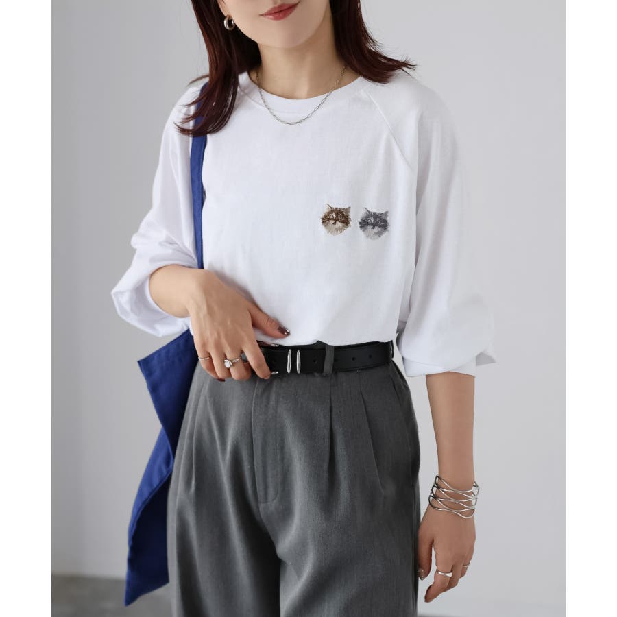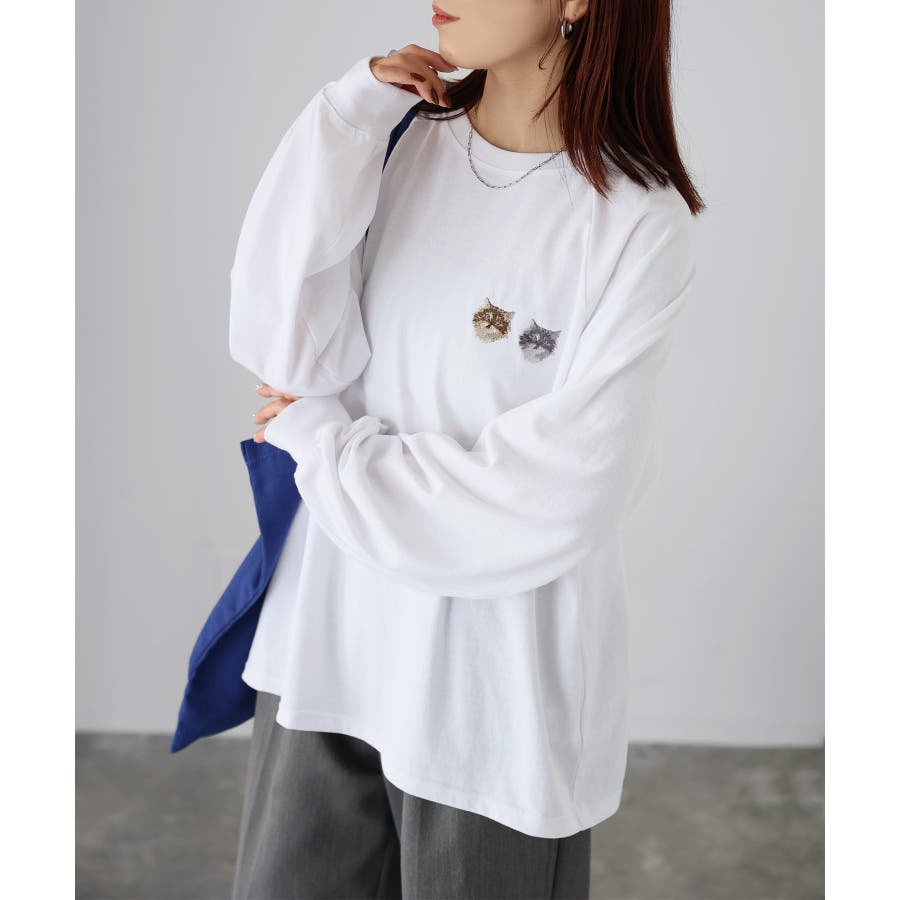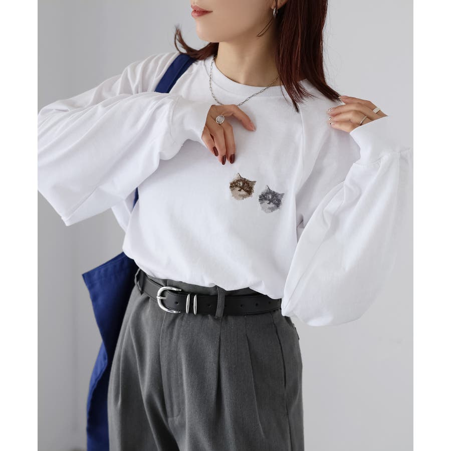 胸元のネコ刺繡がキュートで1枚でアクセントになるアイテムです。