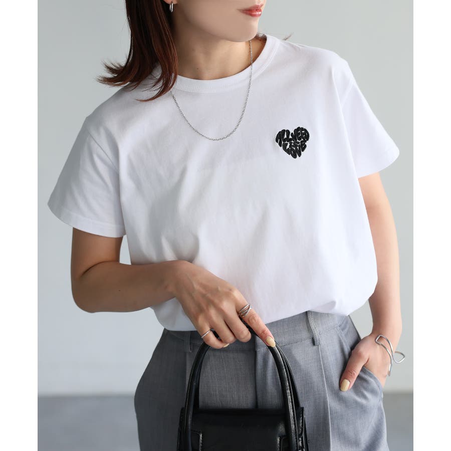 子供っぽい印象になりやすいハートの刺繡ですが、コンパクトなサイズ感なので大人カジュアルに着られるアイテムです。