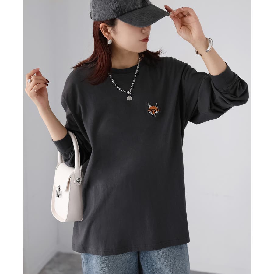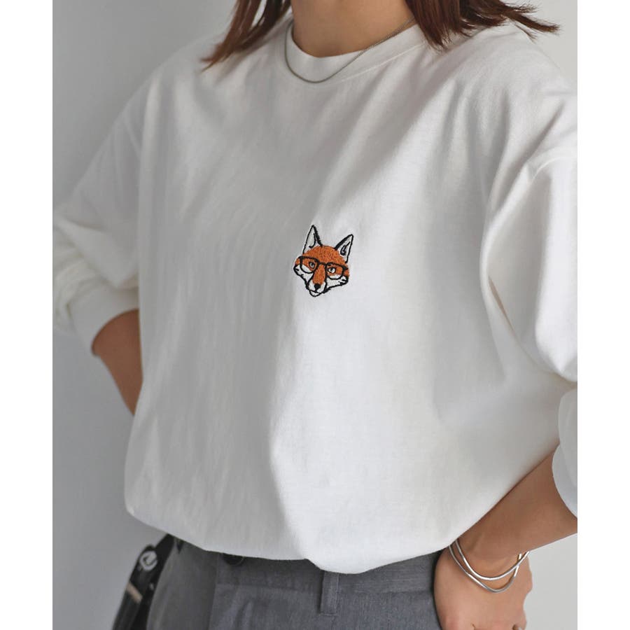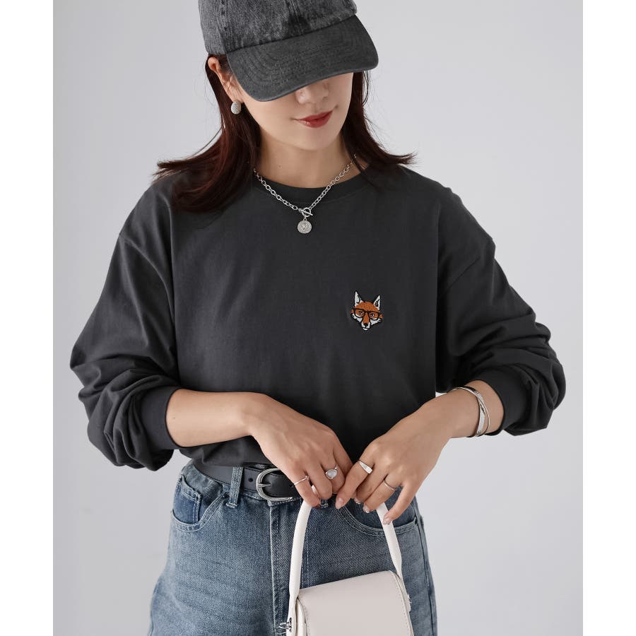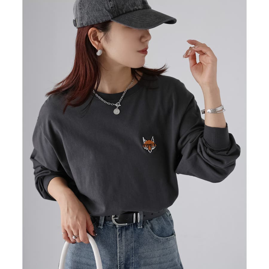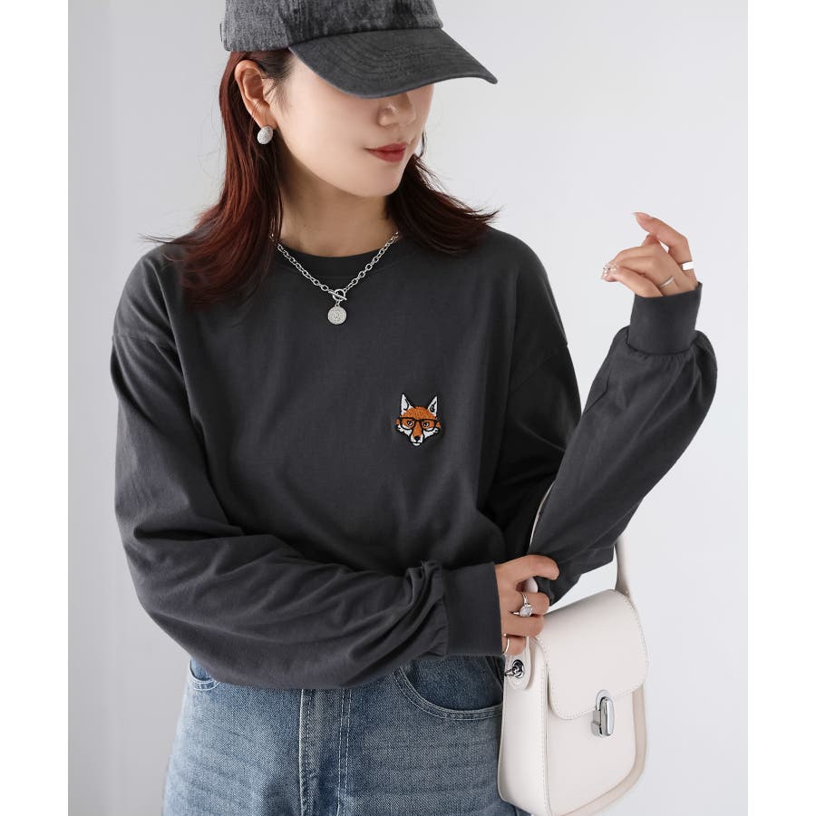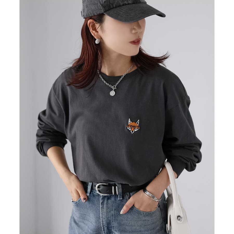 シンプルになりがちなTシャツですが、胸元のめがねキツネの刺繍がアクセントになってくれる主役級ロンTです。