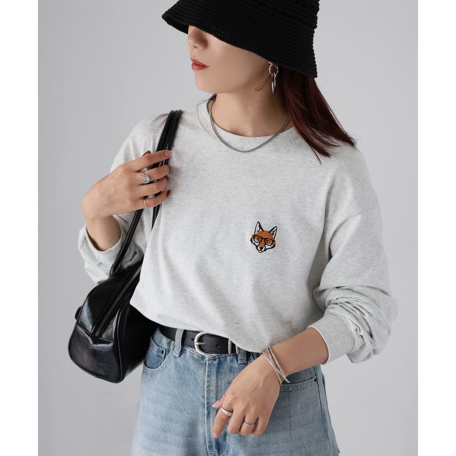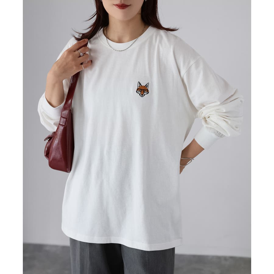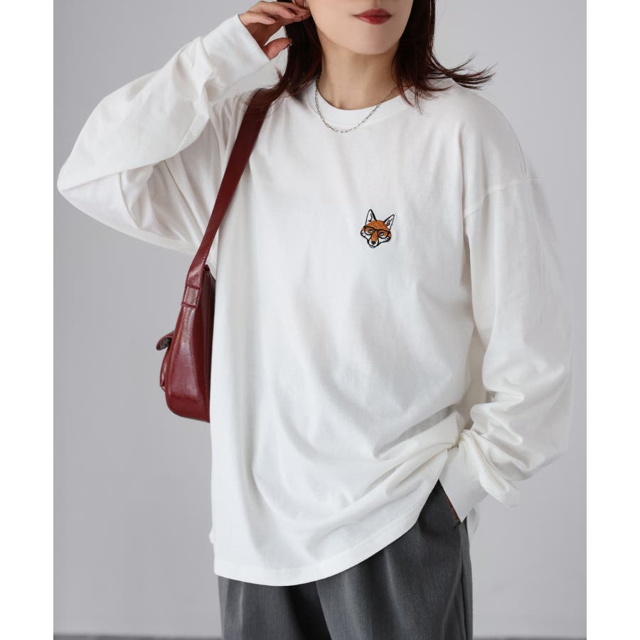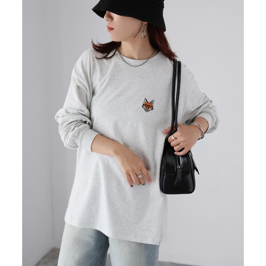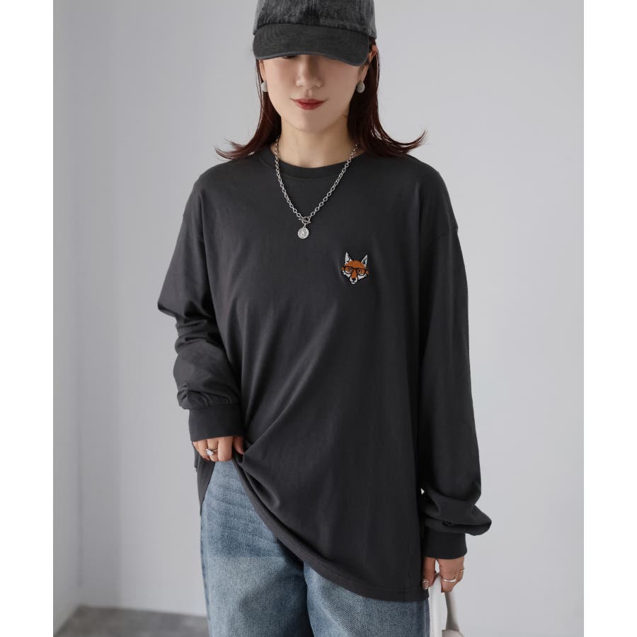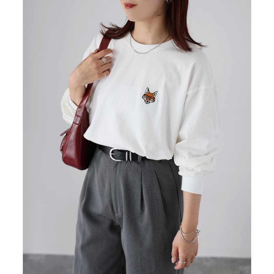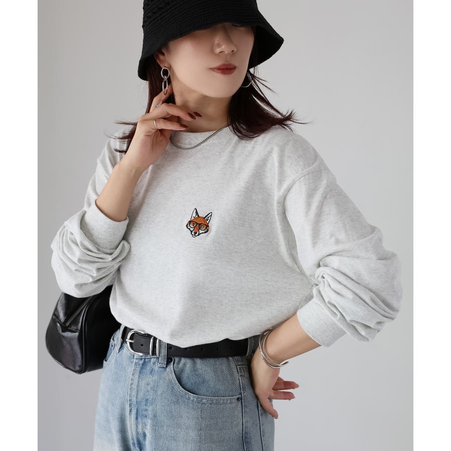 シンプルになりがちなTシャツですが、胸元のめがねキツネの刺繍がアクセントになってくれる主役級ロンTです。