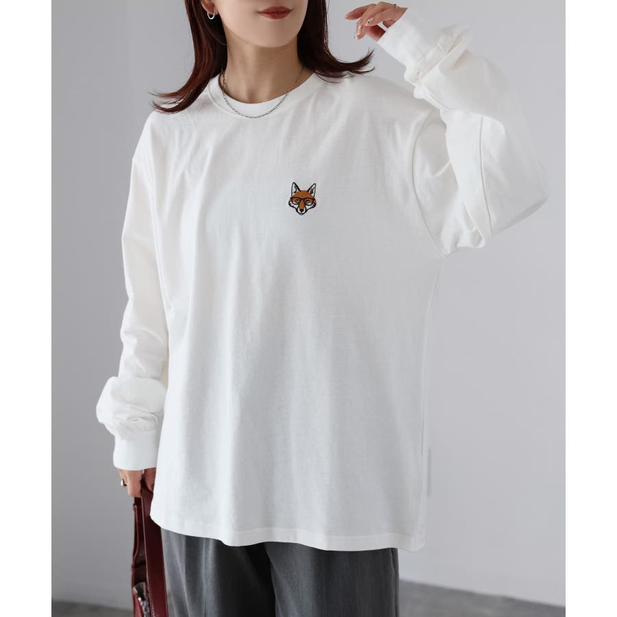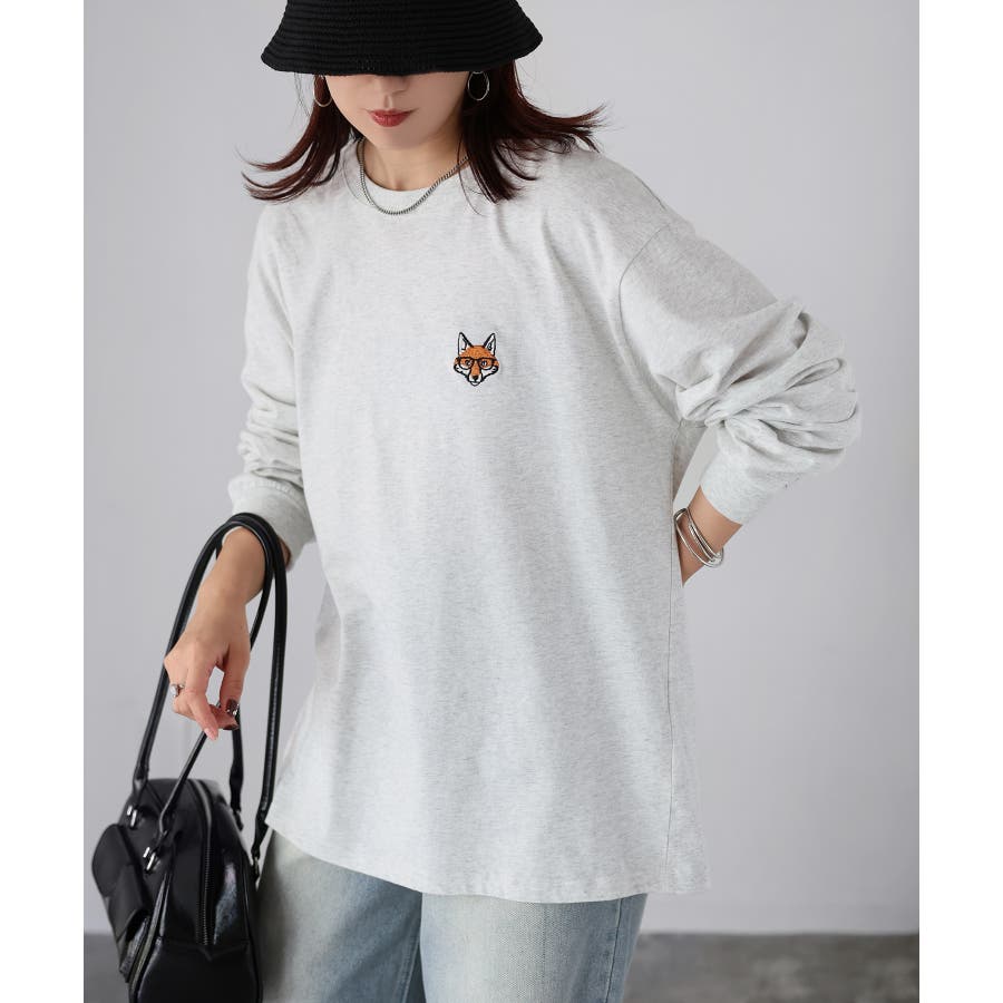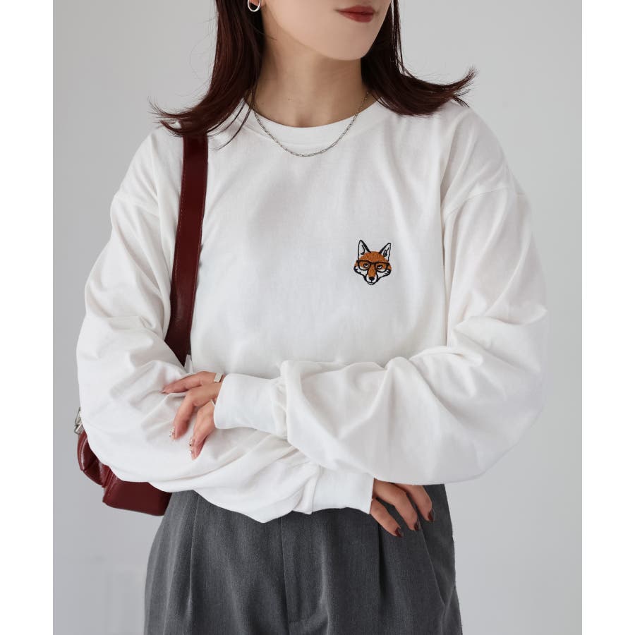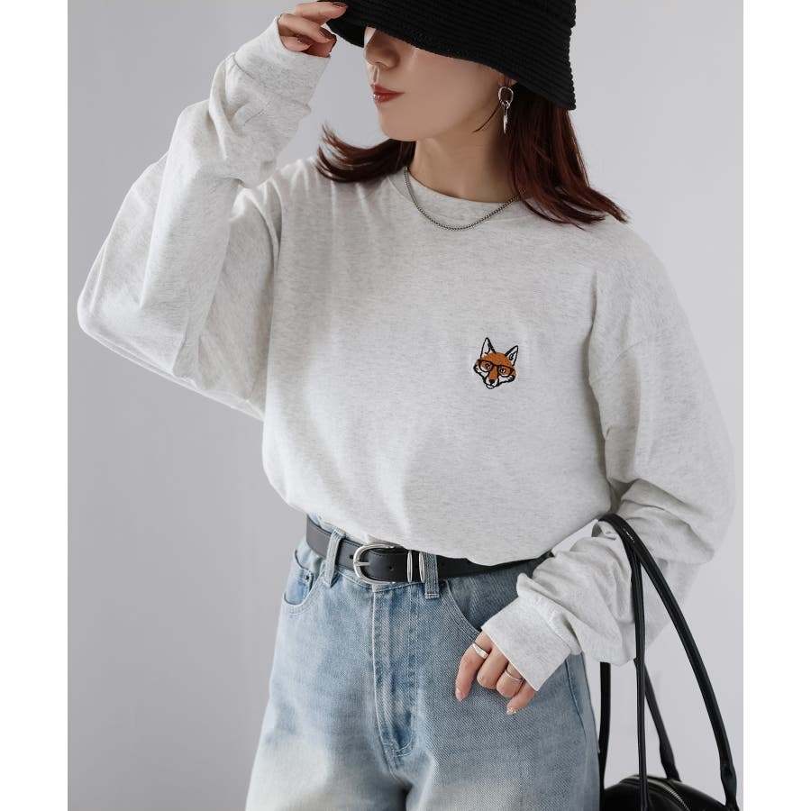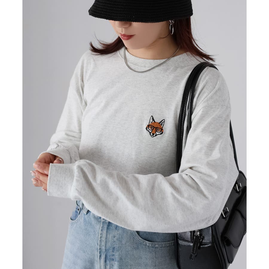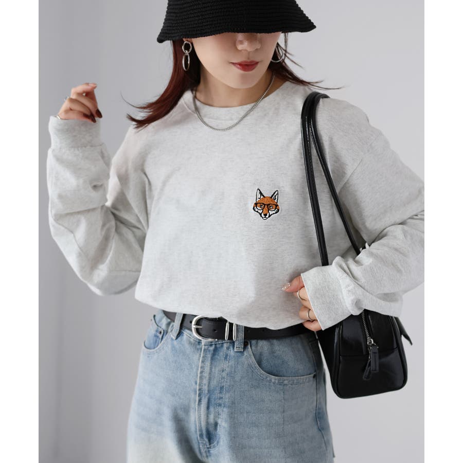 シンプルになりがちなTシャツですが、胸元のめがねキツネの刺繍がアクセントになってくれる主役級ロンTです。