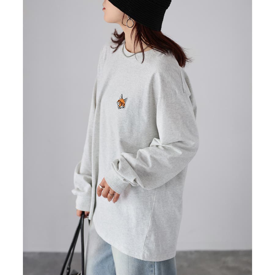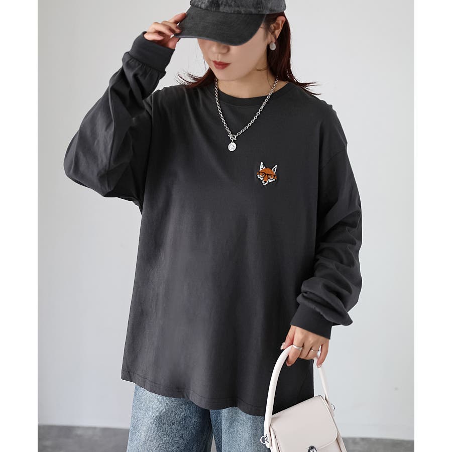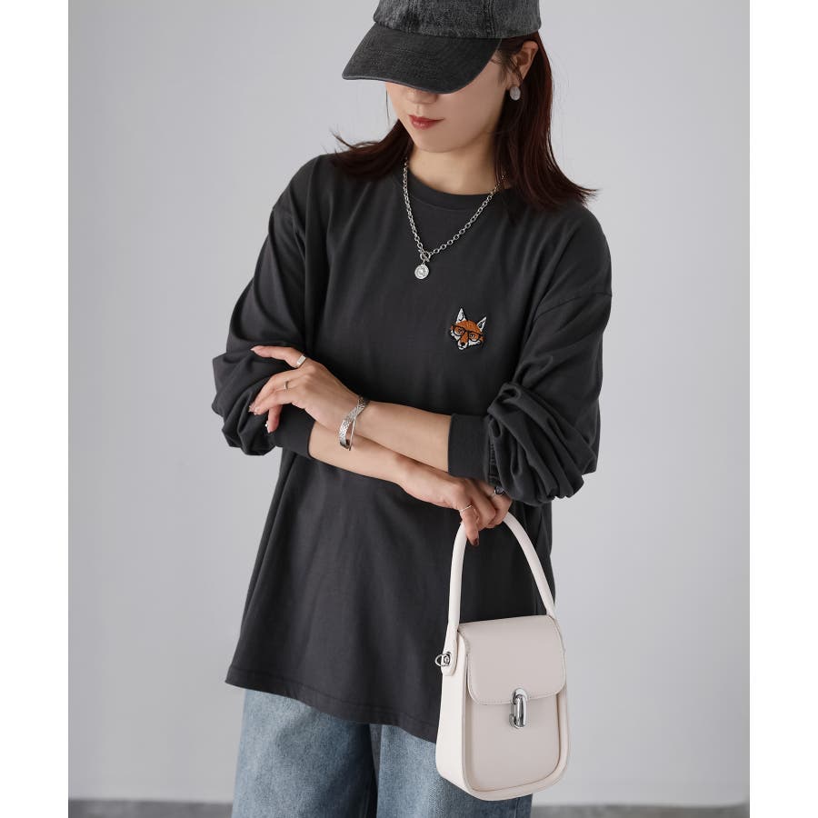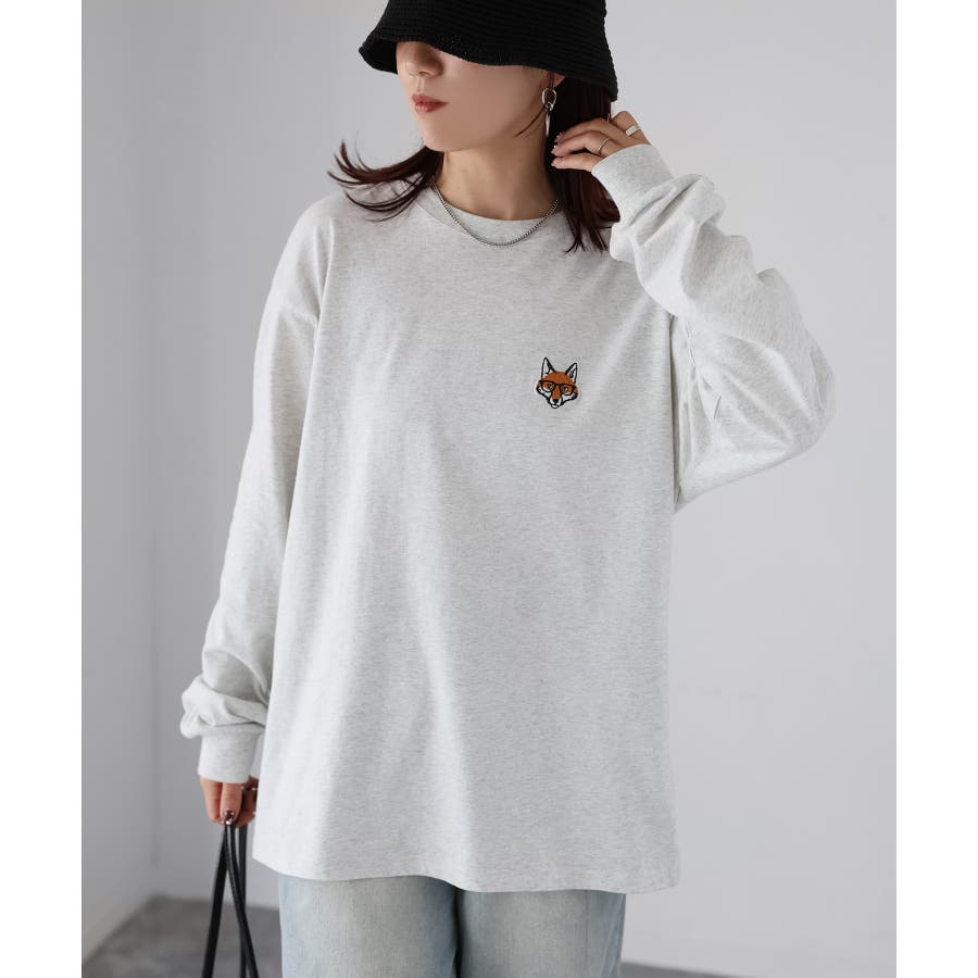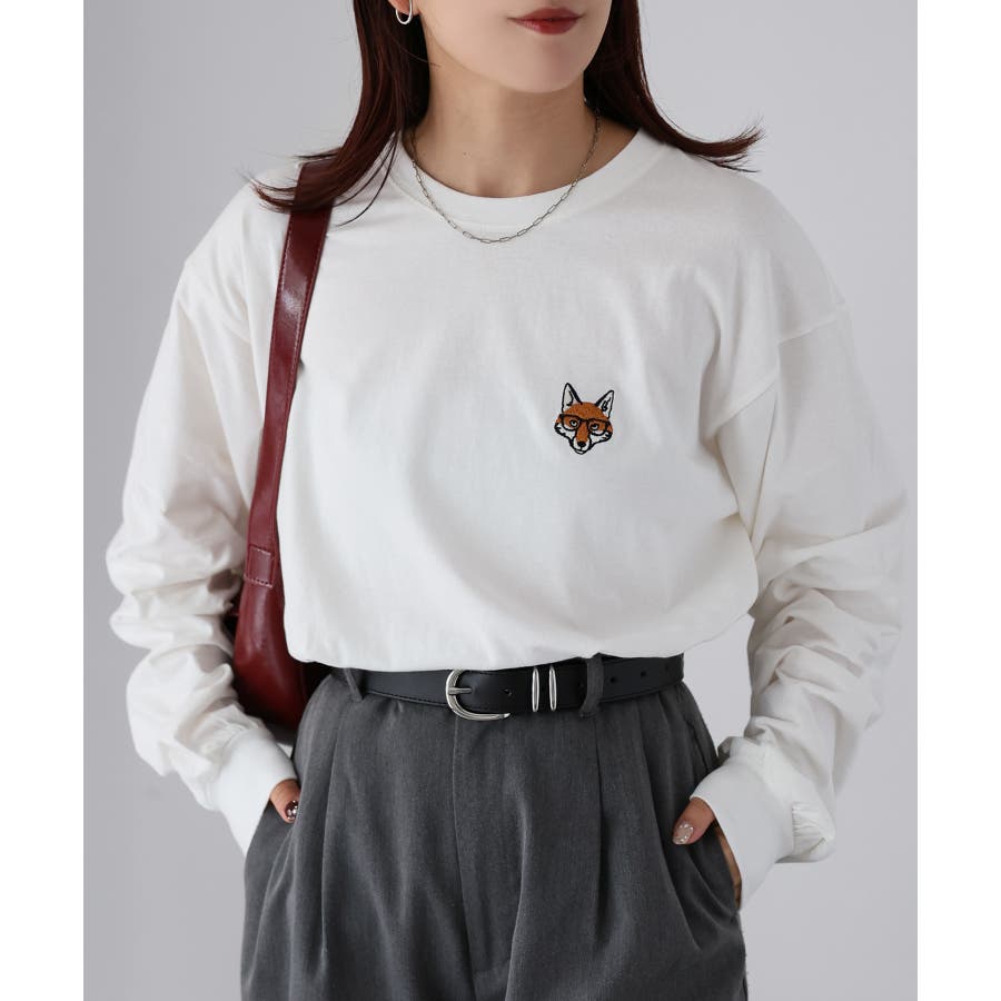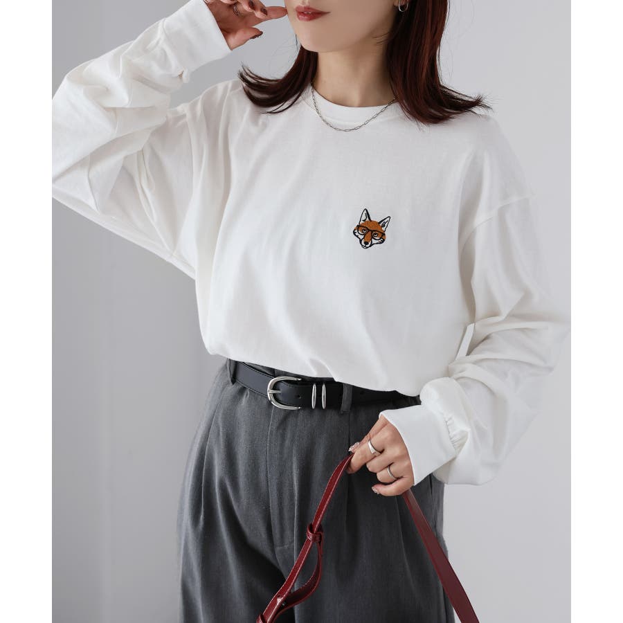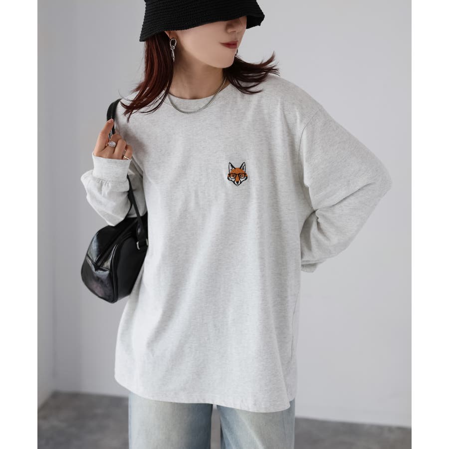シンプルになりがちなTシャツですが、胸元のめがねキツネの刺繍がアクセントになってくれる主役級ロンTです。