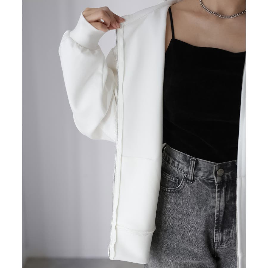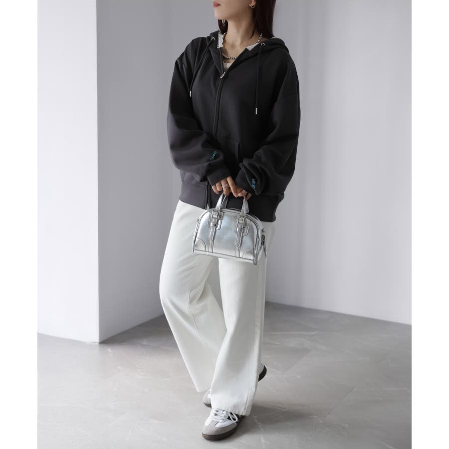ダブルジップを活かして、インナーにロゴTやシアートップスを合わせれば、旬なレイヤードスタイルが完成します。