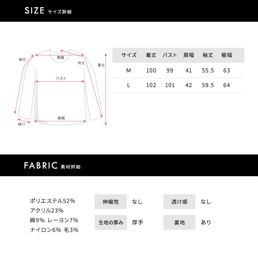 [L]着丈:102cm / 肩幅:42cm / バスト:101cm / 裾幅:64cm / 袖丈:59.5cm