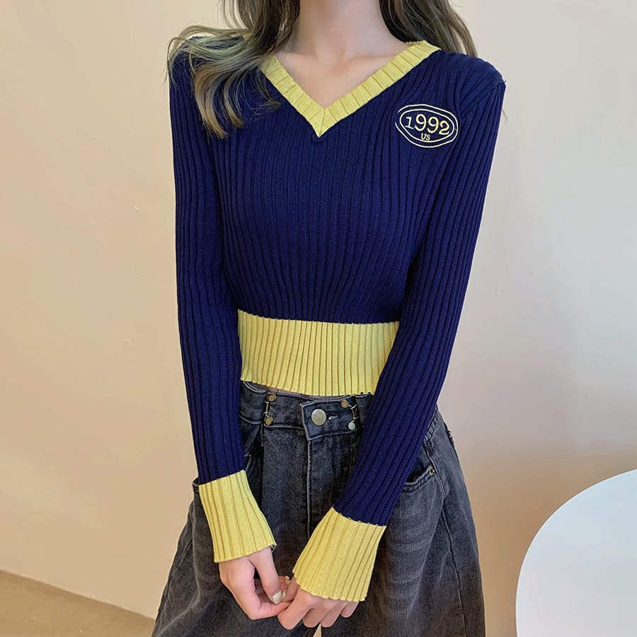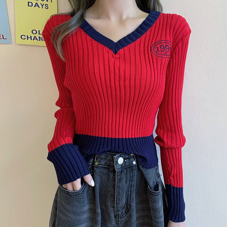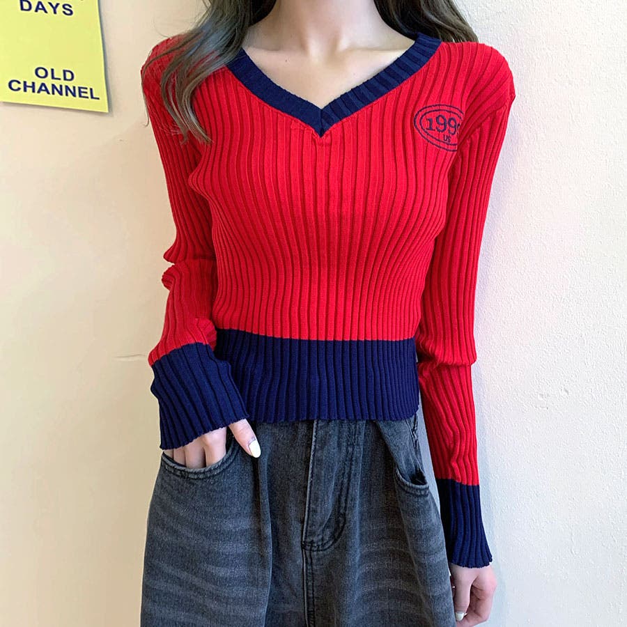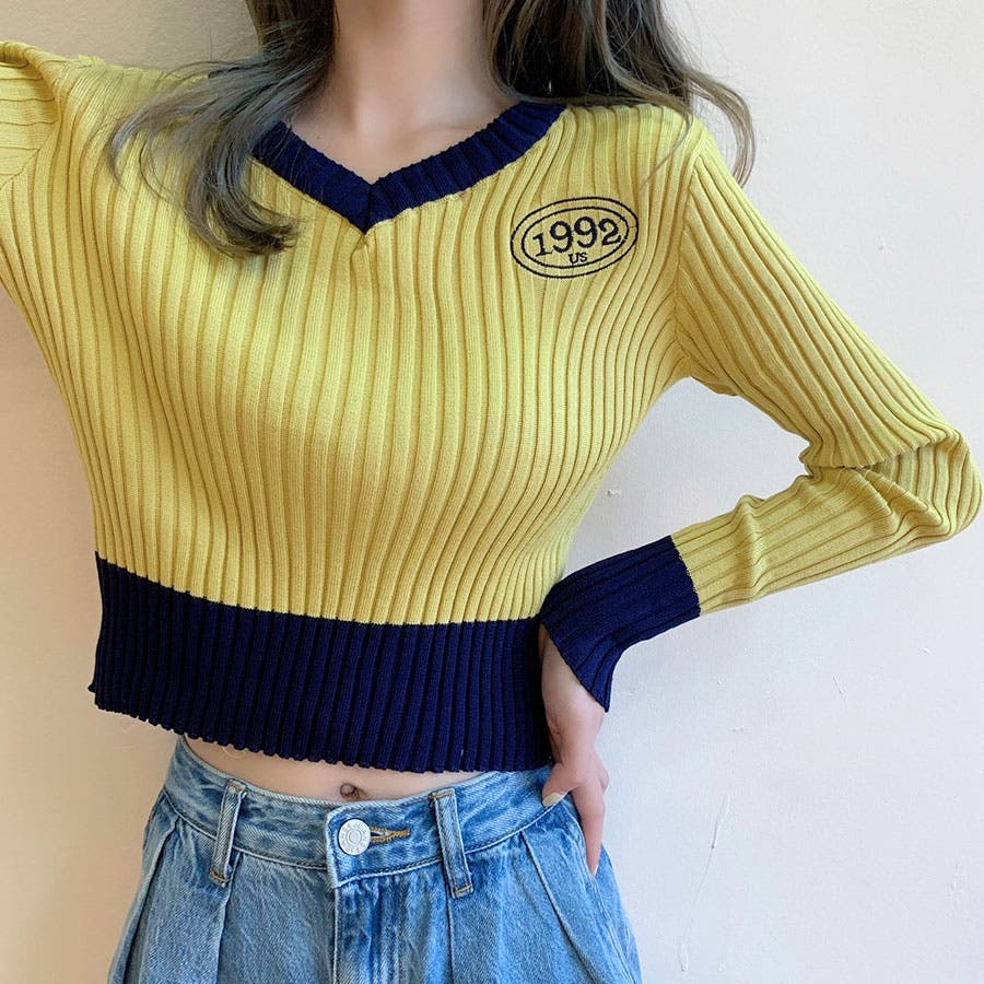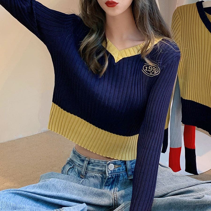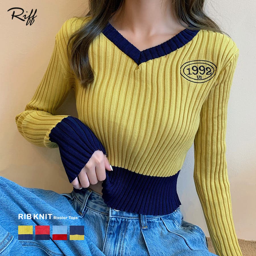 ビタミンカラーの配色が可愛い バイカラーVネックリブニット ショート丈