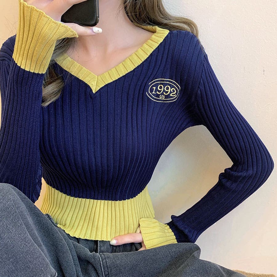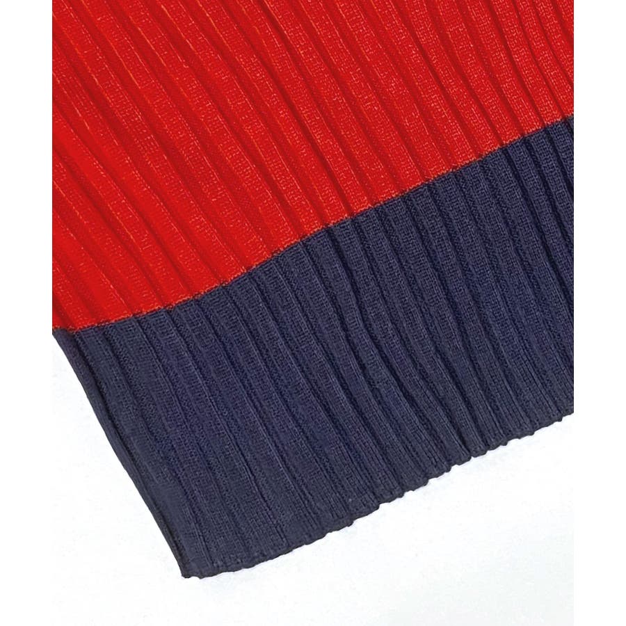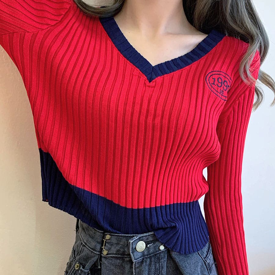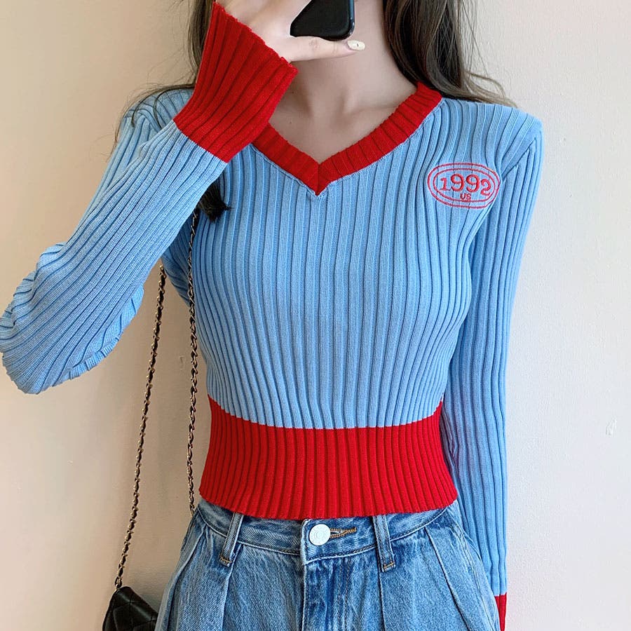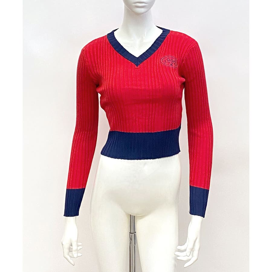 ビタミンカラーの配色が可愛い バイカラーVネックリブニット ショート丈