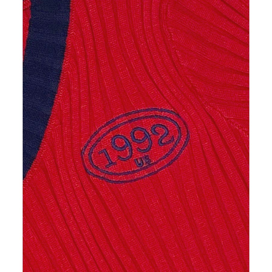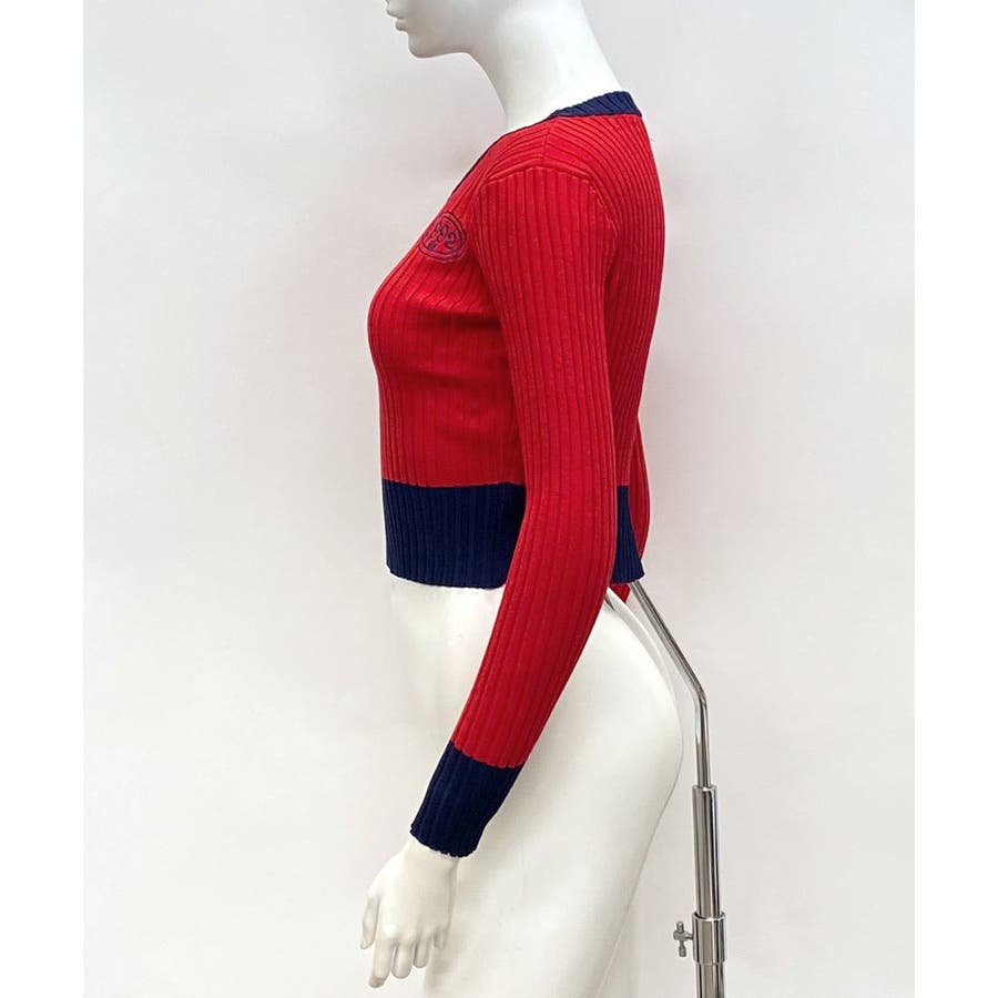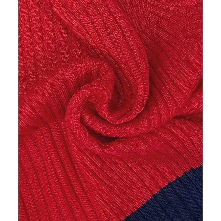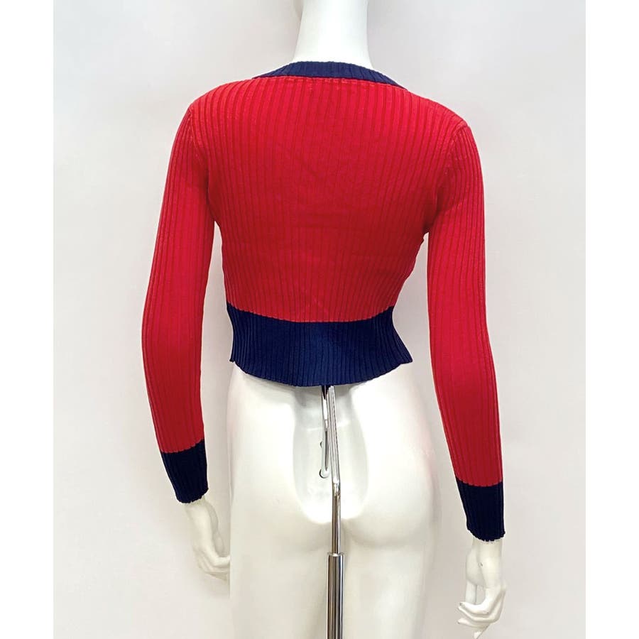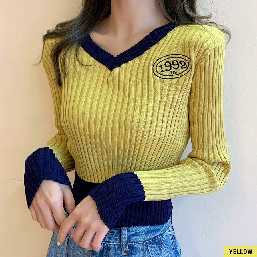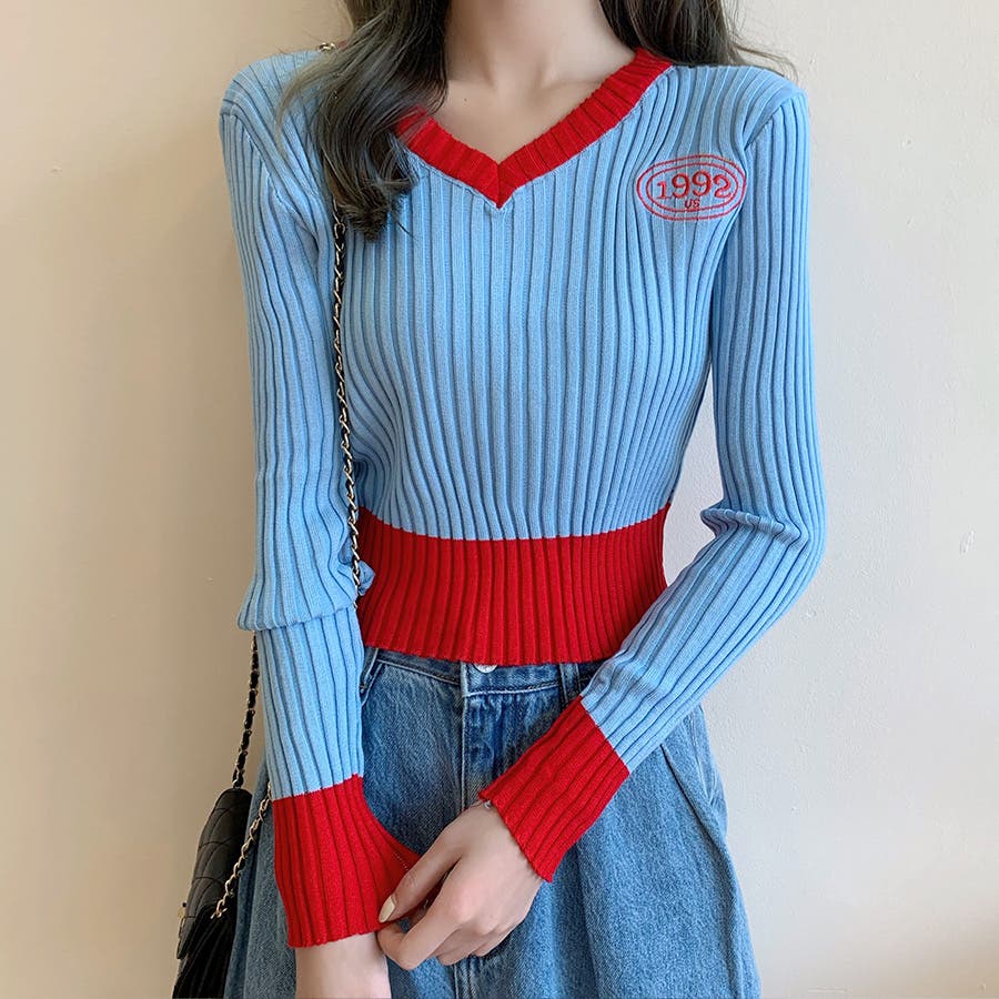 ビタミンカラーの配色が可愛い バイカラーVネックリブニット ショート丈