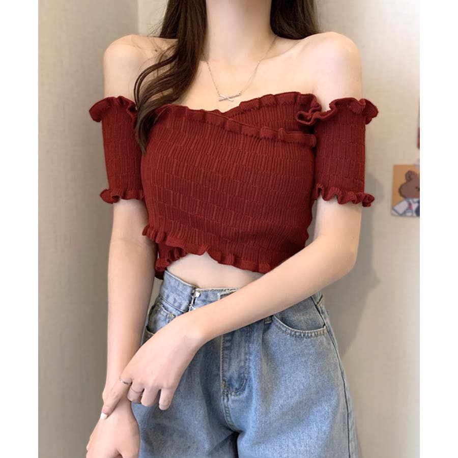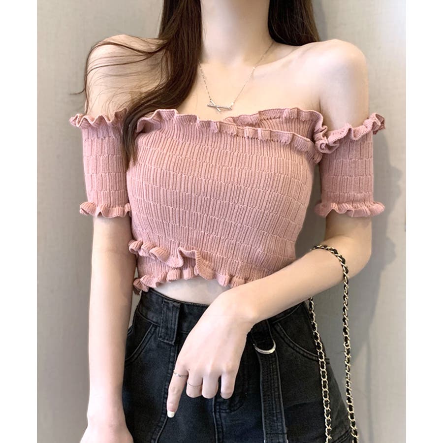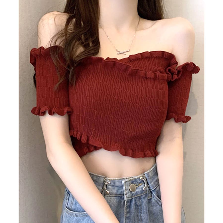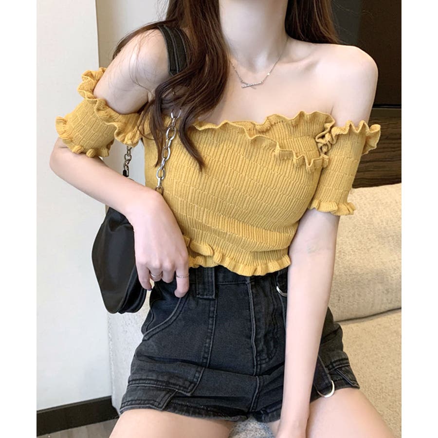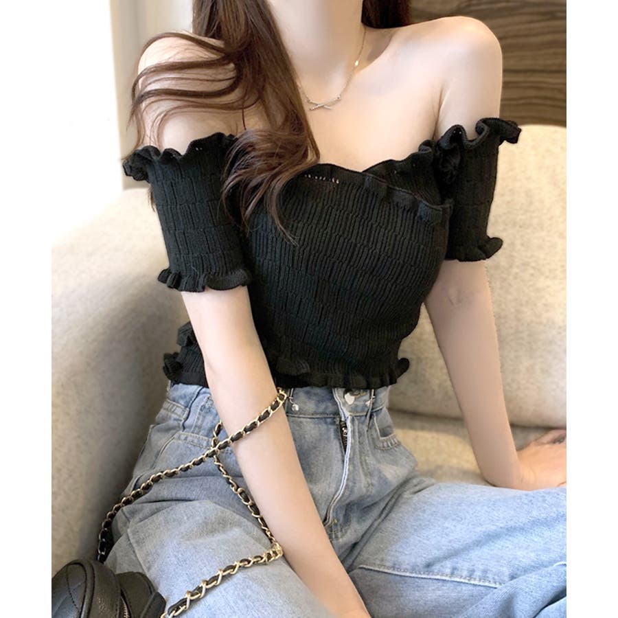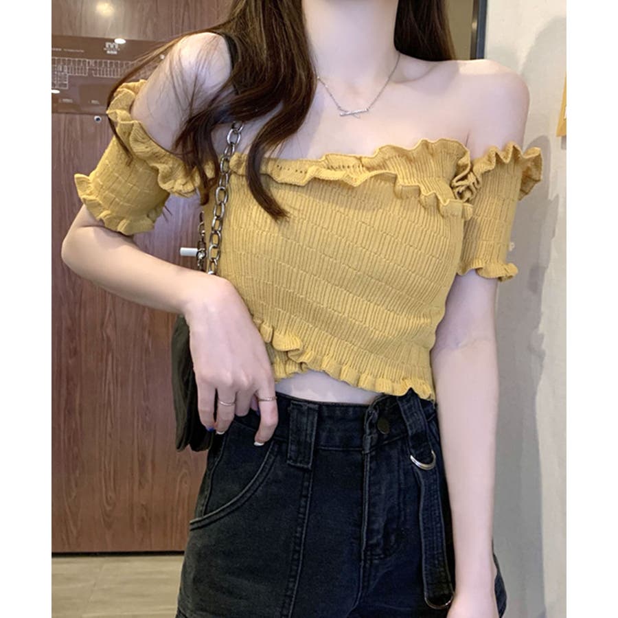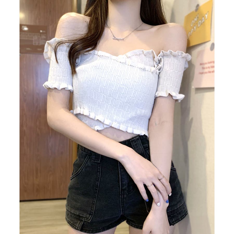 全体にギャザーが入った伸縮性のあるサマーニット素材で、からだに程よくフィット。首周り、袖、裾に施したプチフリルがアクセントに。クロップド丈なのでハイウエストのボトムと好相性です◎