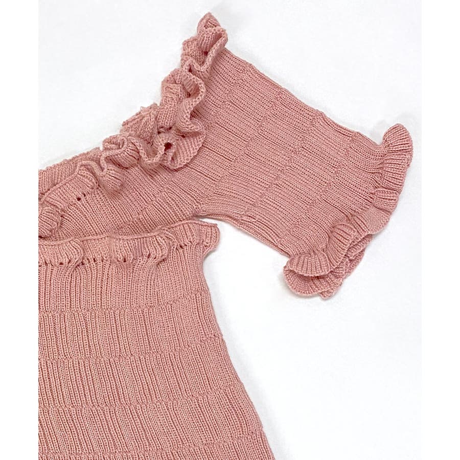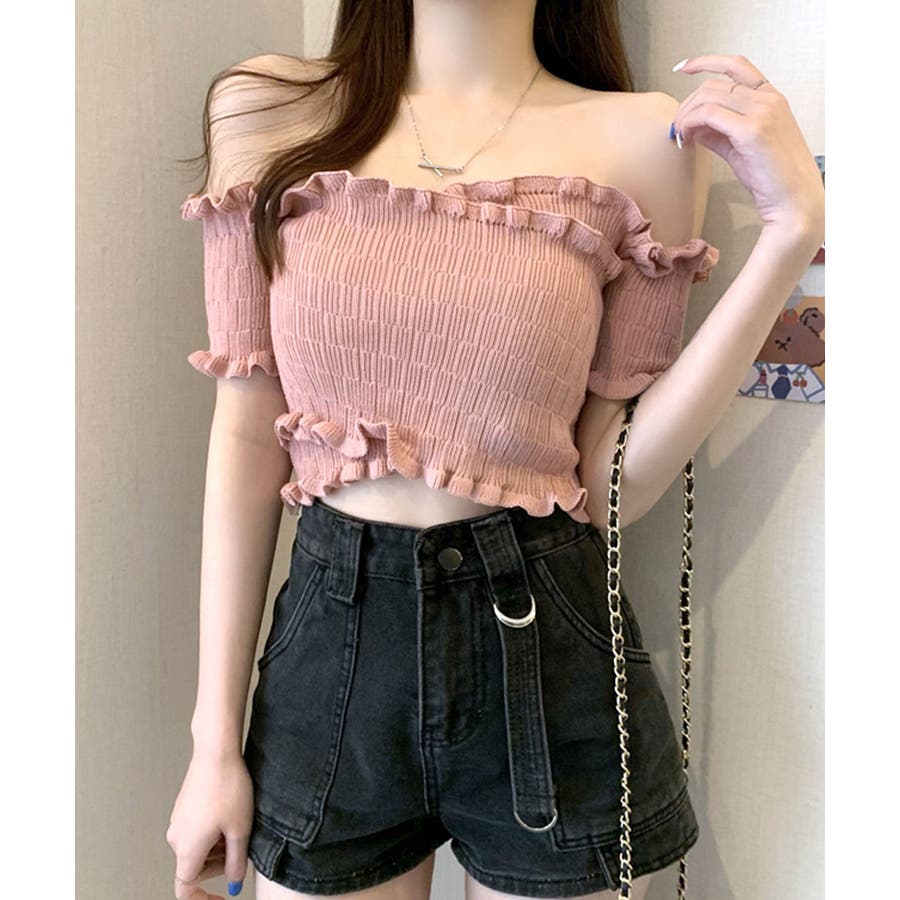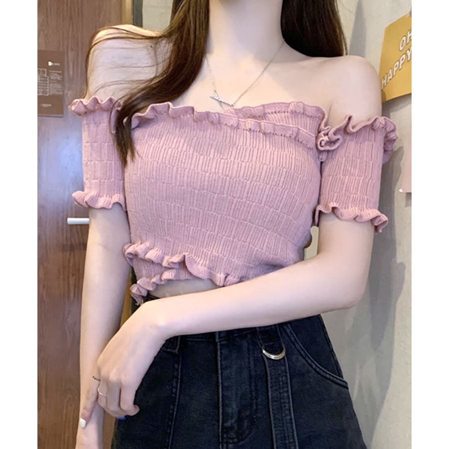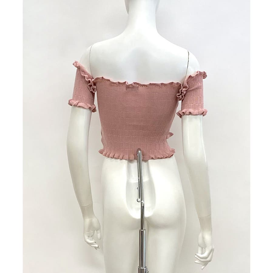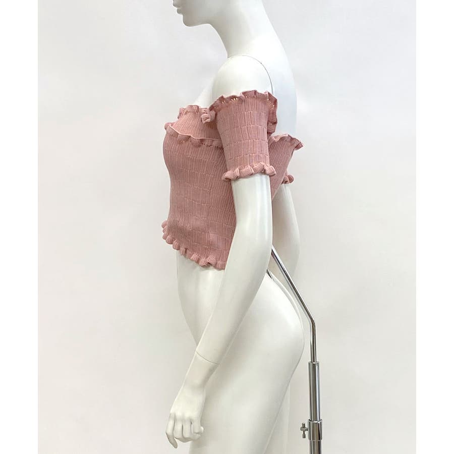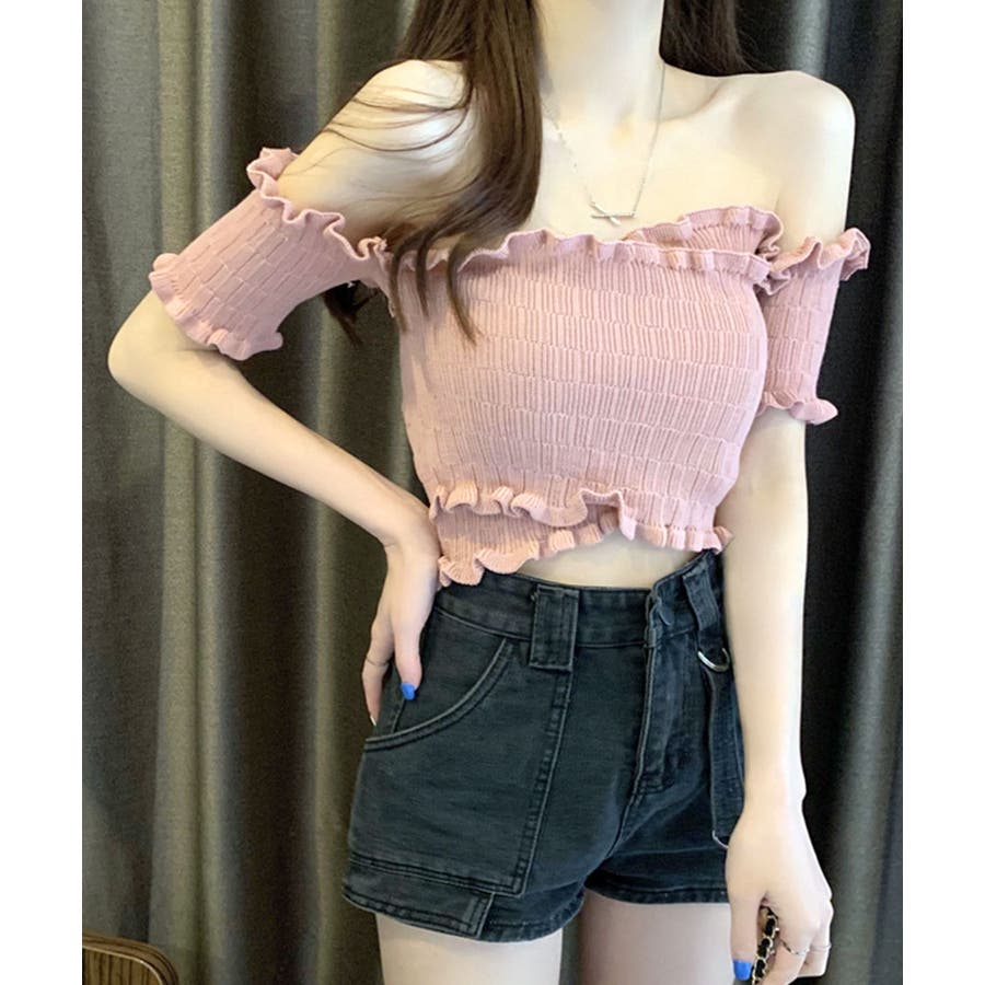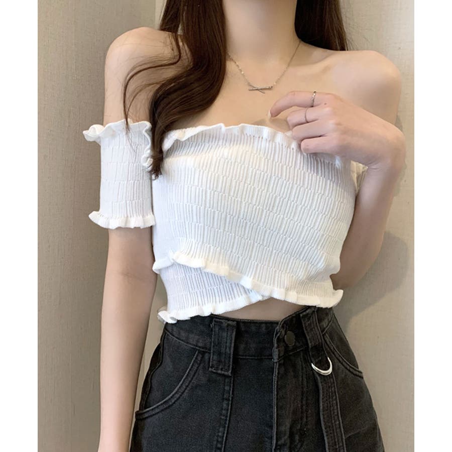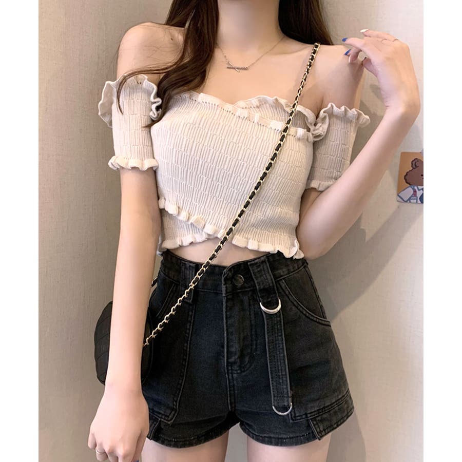 全体にギャザーが入った伸縮性のあるサマーニット素材で、からだに程よくフィット。首周り、袖、裾に施したプチフリルがアクセントに。クロップド丈なのでハイウエストのボトムと好相性です◎
