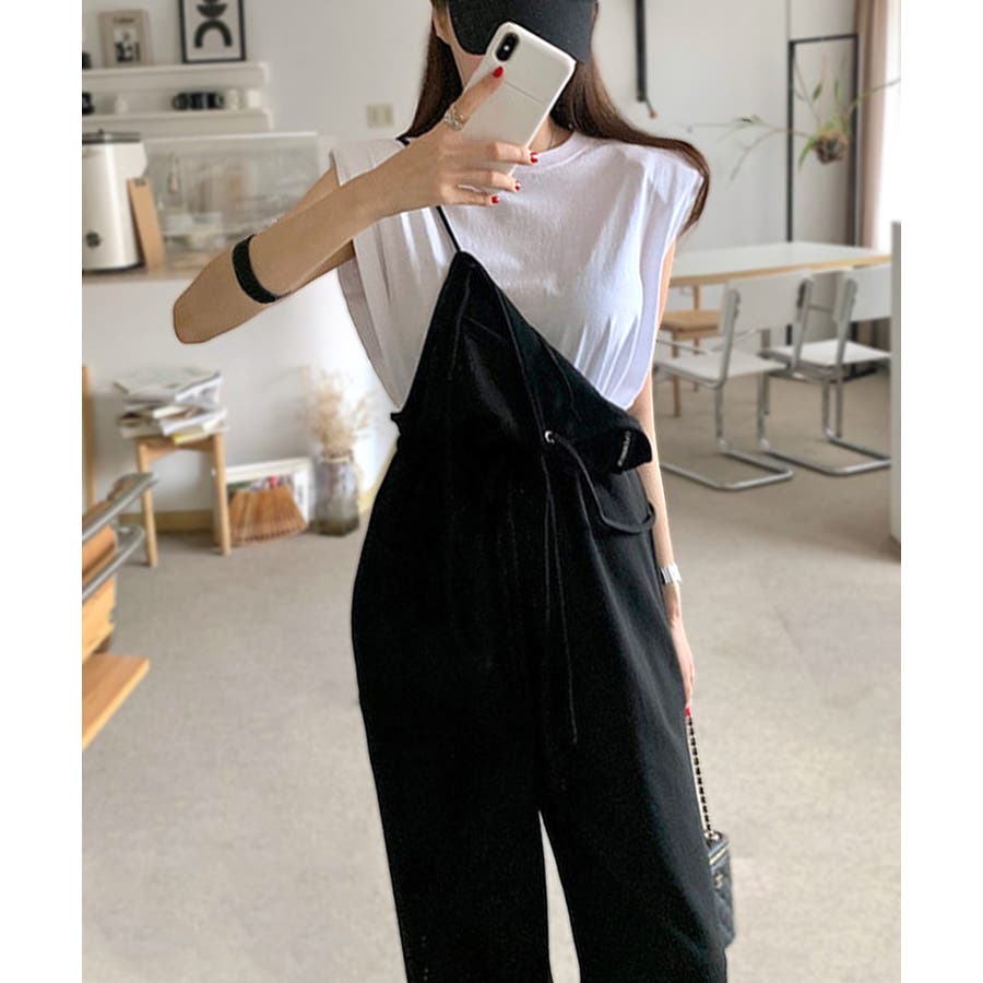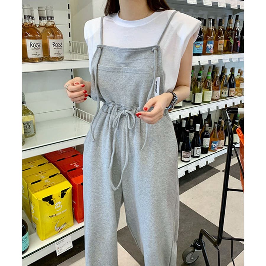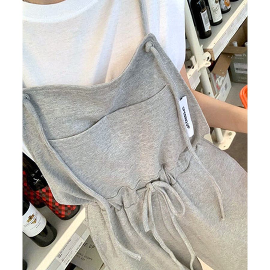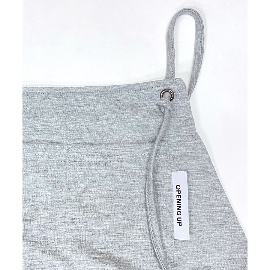 肩紐も結び目で着丈を調節できます。細紐なのも可愛いポイント。ウエストはドロスト仕様で調節可能です。伸縮性がありやわらかな生地感で着心地も◎インナーを変えるだけでシーズンレスで着回せるボトムスです。