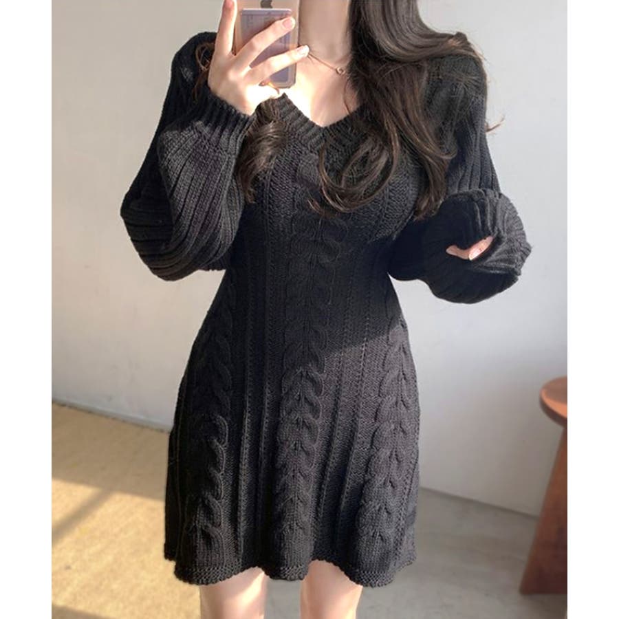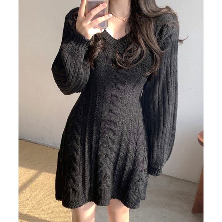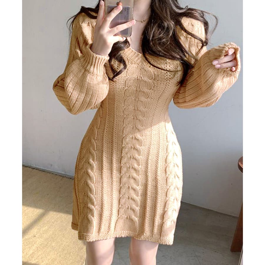 ケーブルニットミニワンピース ケーブル編み Vネック